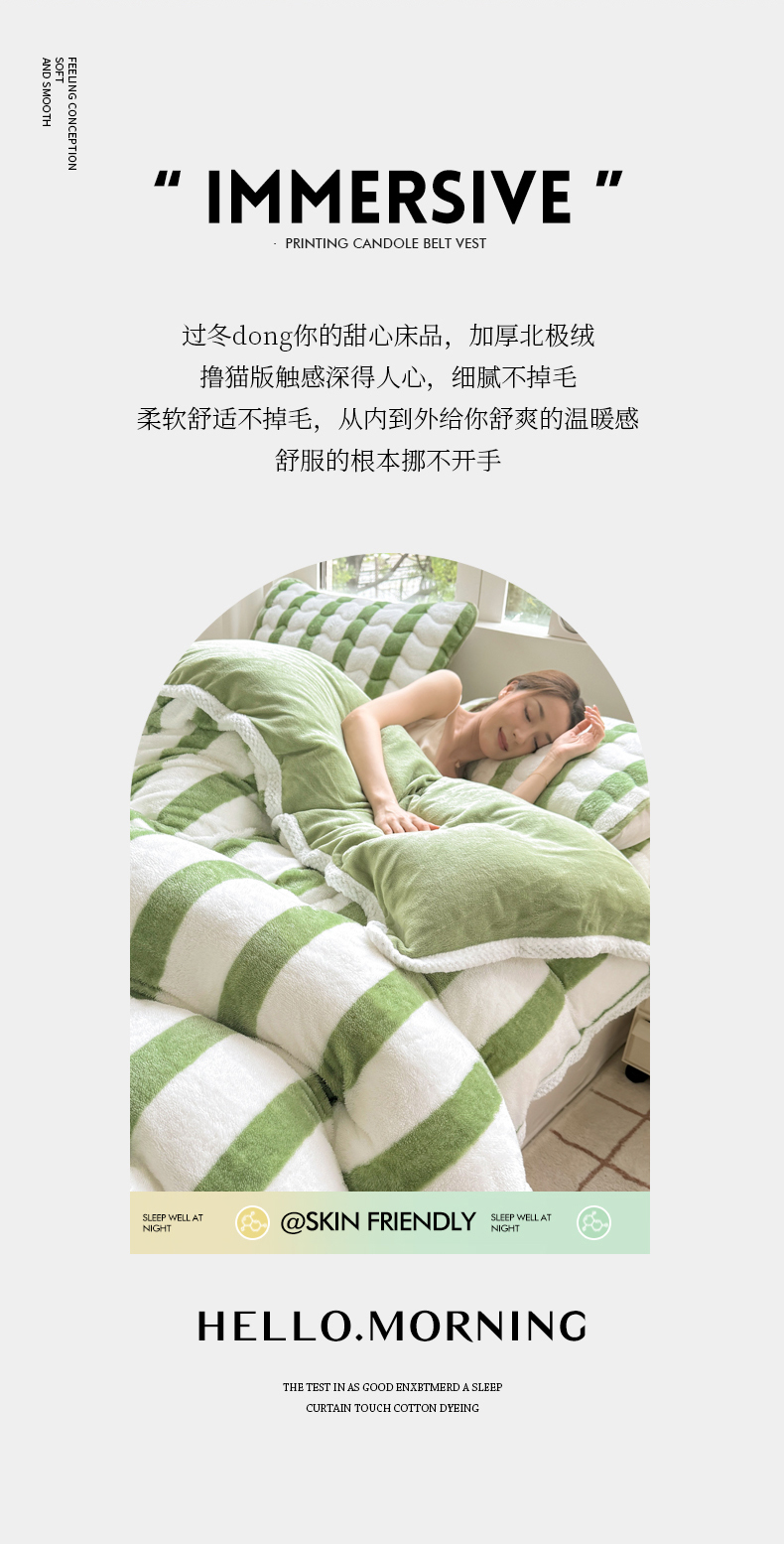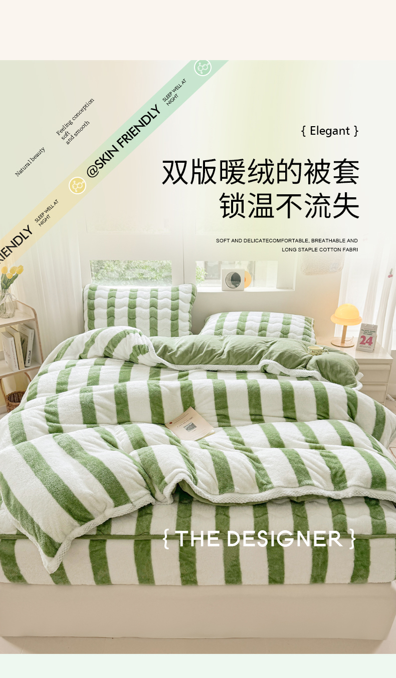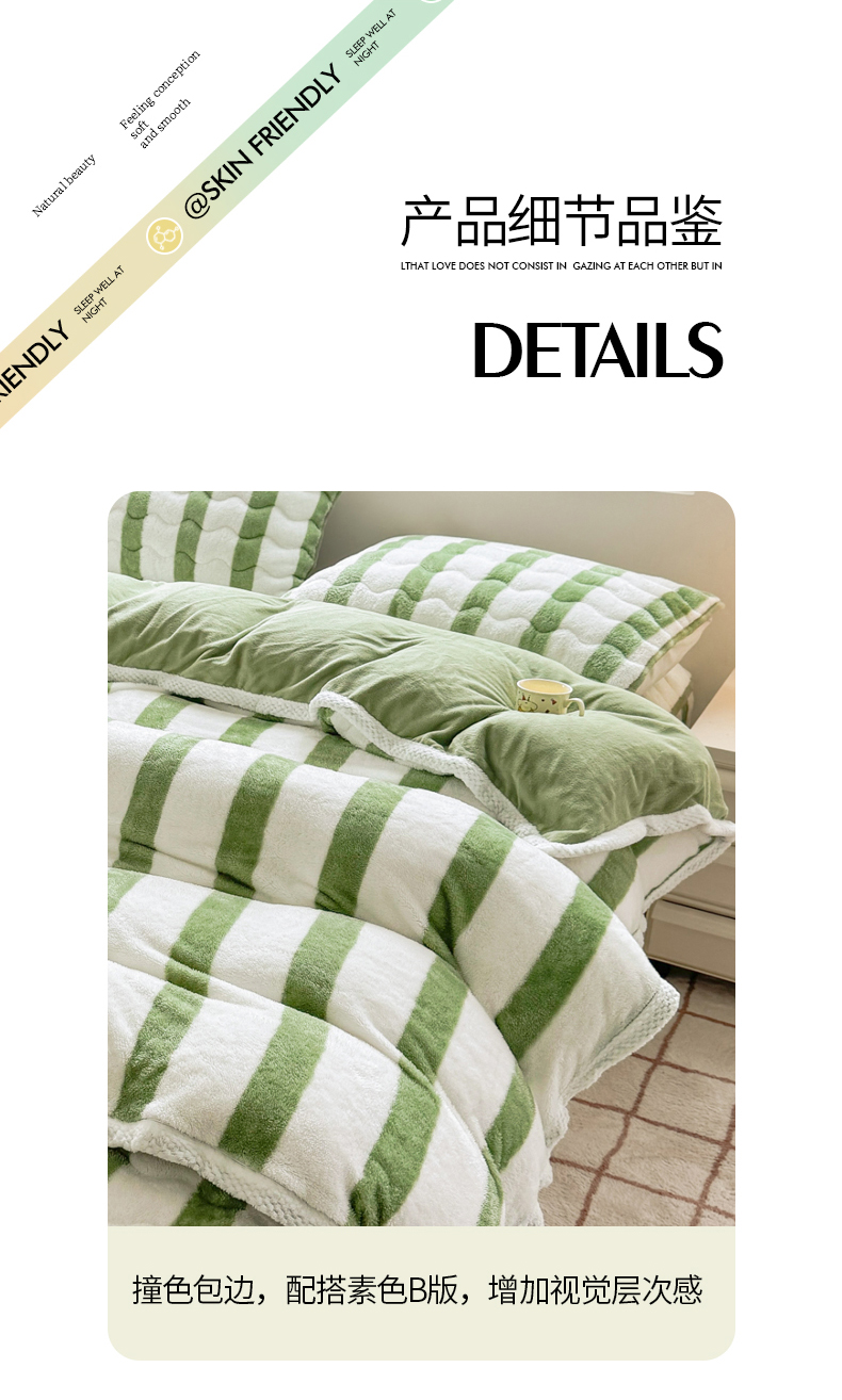 商品名称:2024新款A类北极绒格子-条纹系列宽包边加厚被套(自然光图) 条纹-豆绿