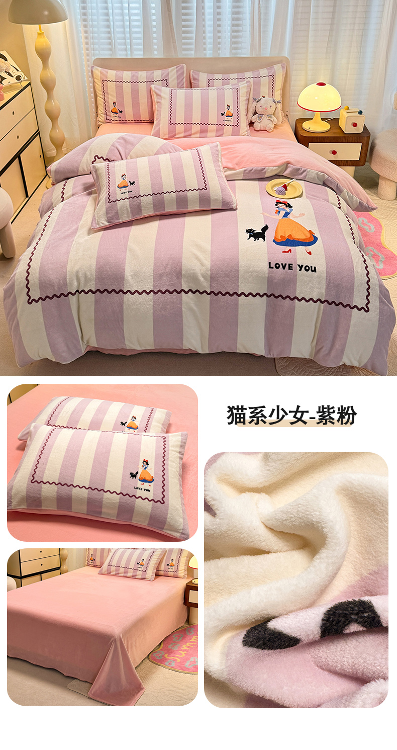 商品名称:经年 2025新款大版卡通牛奶绒四件套-猫系少女系列 猫系少女-紫粉