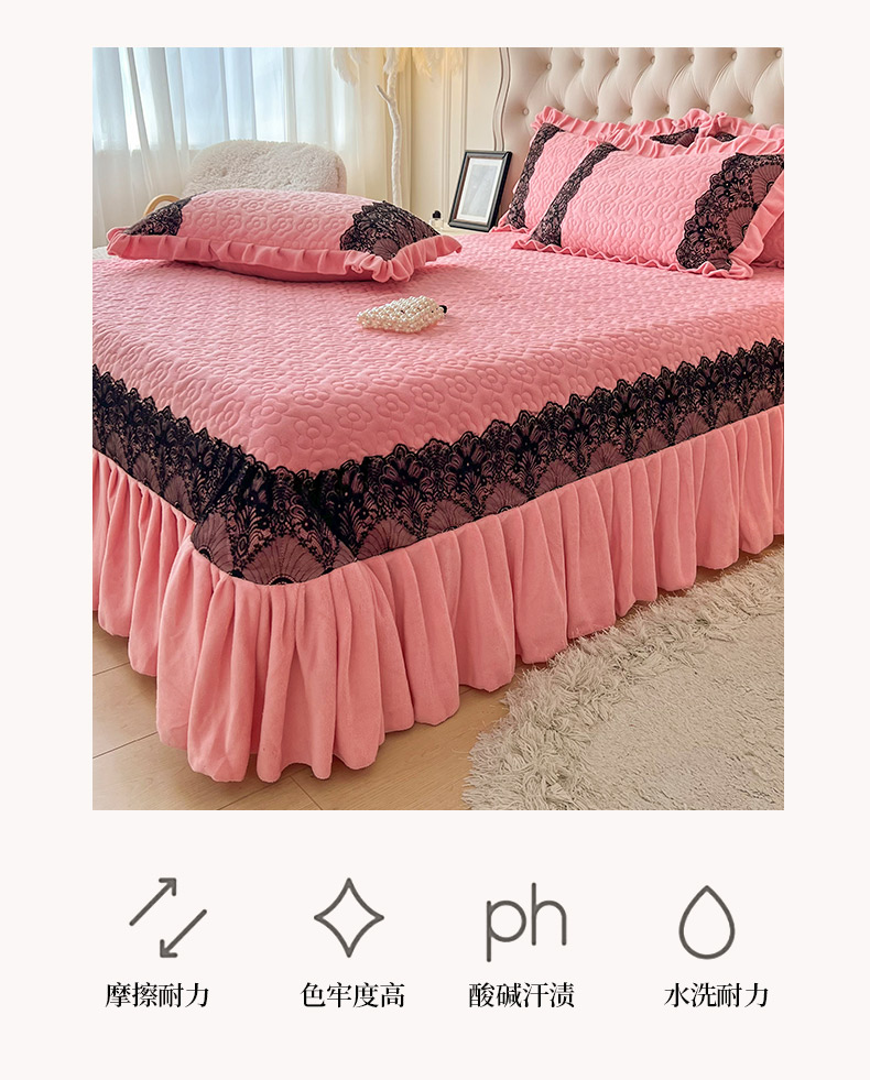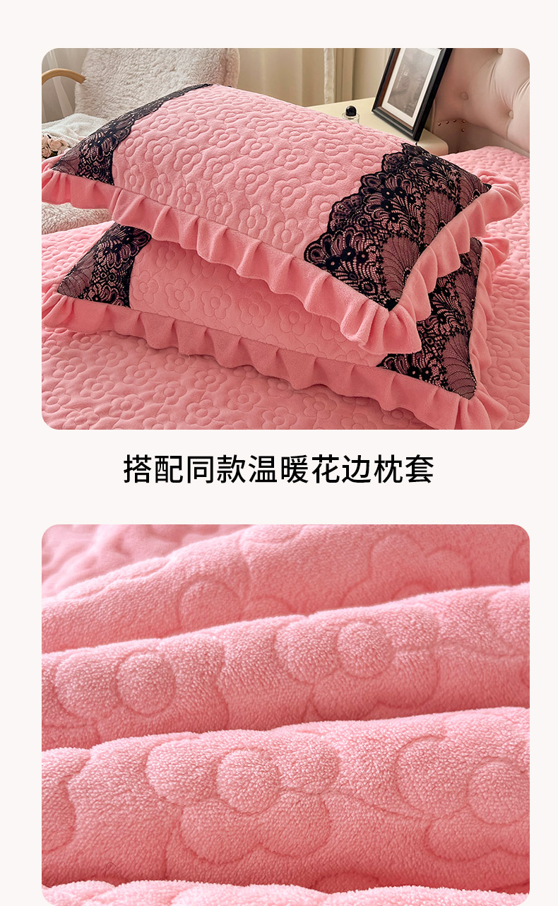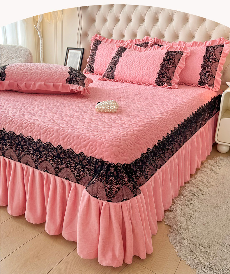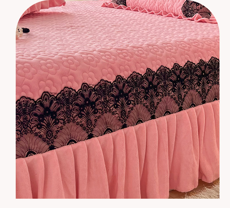 商品名称:恋尚 2024新款牛奶绒夹棉床盖纯色蕾丝边牛奶绒床盖 洛丽塔 粉色