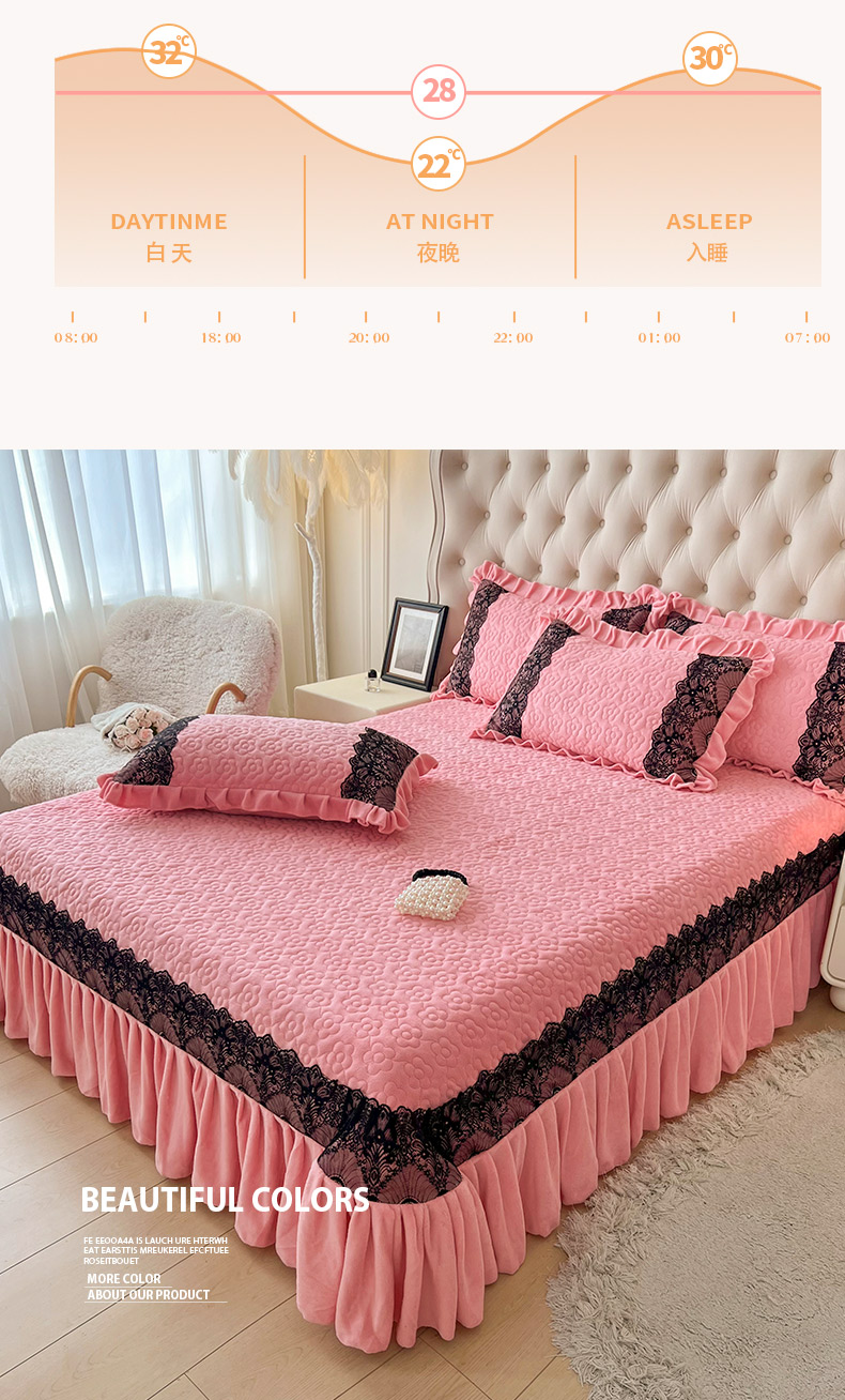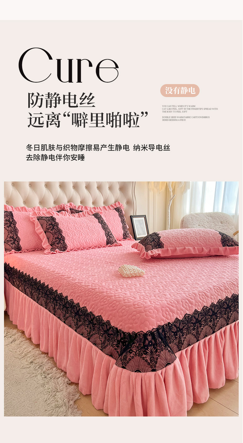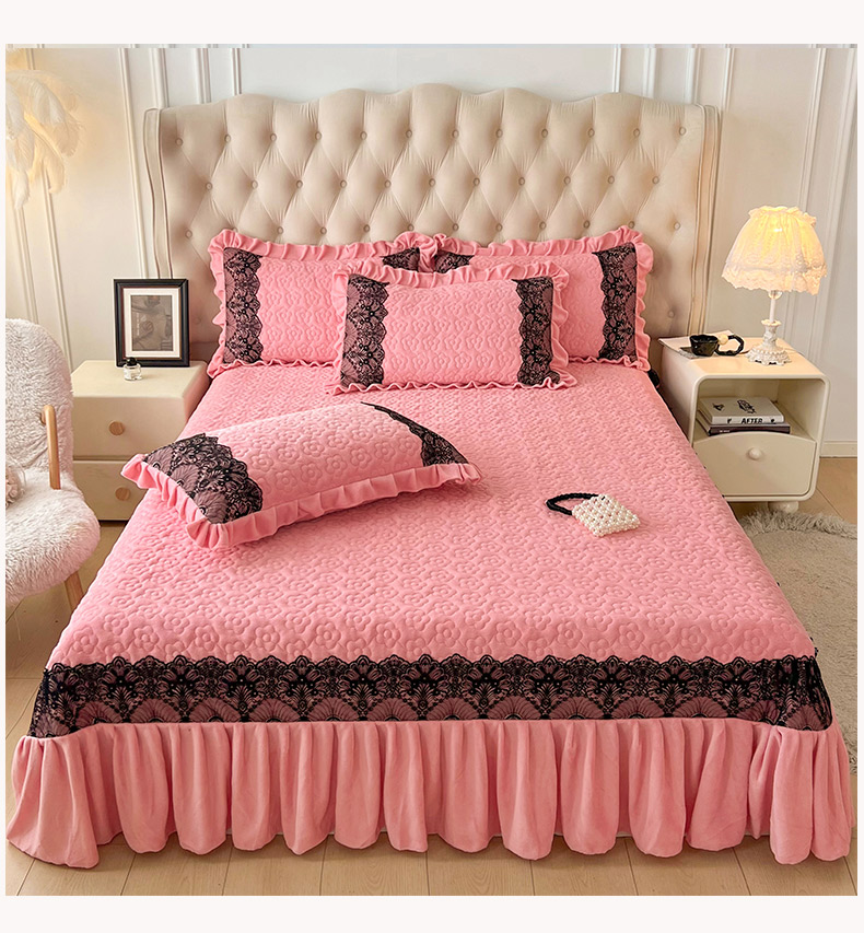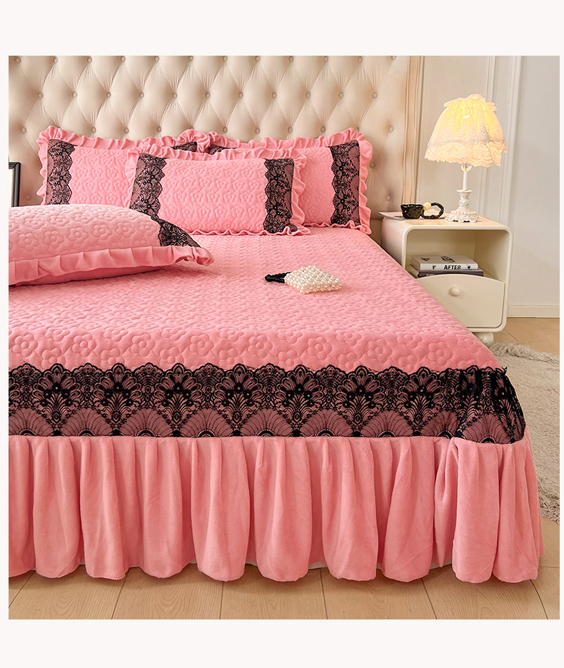 商品名称:恋尚 2024新款牛奶绒夹棉床盖纯色蕾丝边牛奶绒床盖 洛丽塔 粉色