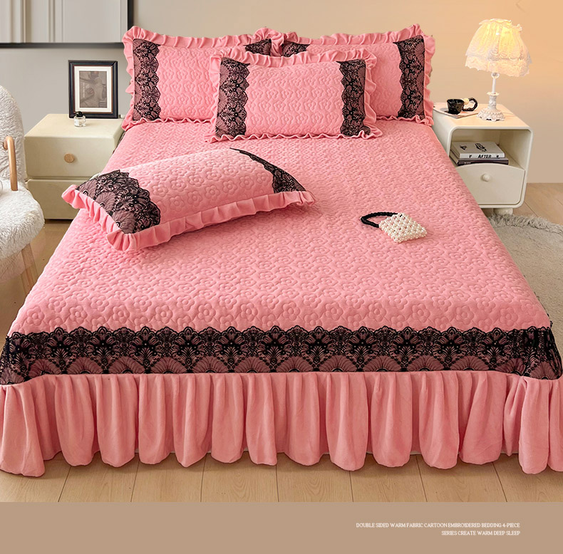 恋尚 2024新款牛奶绒夹棉床盖纯色蕾丝边牛奶绒床盖 洛丽塔 粉色