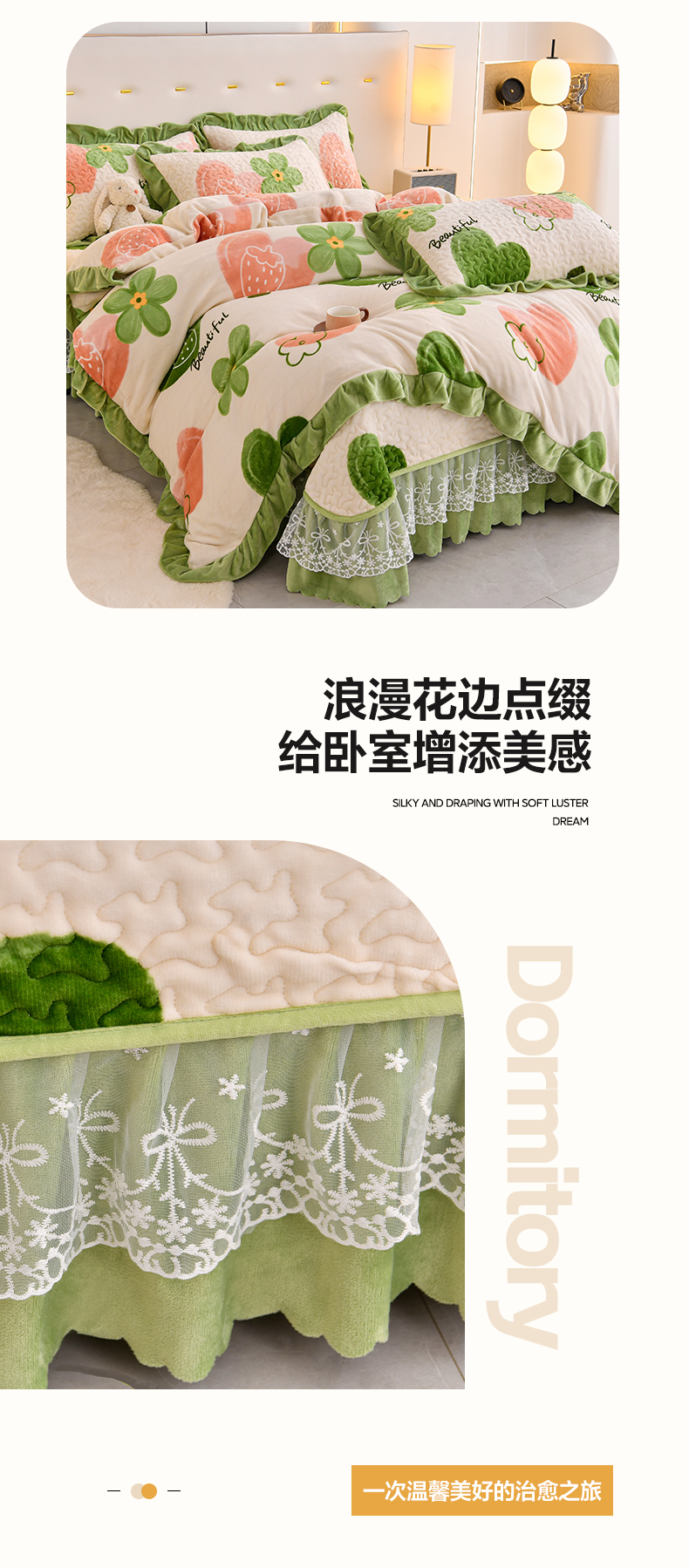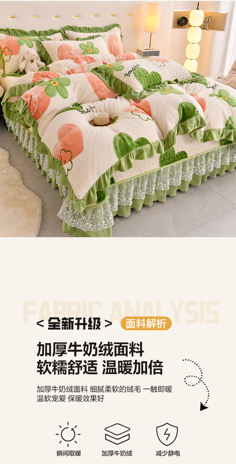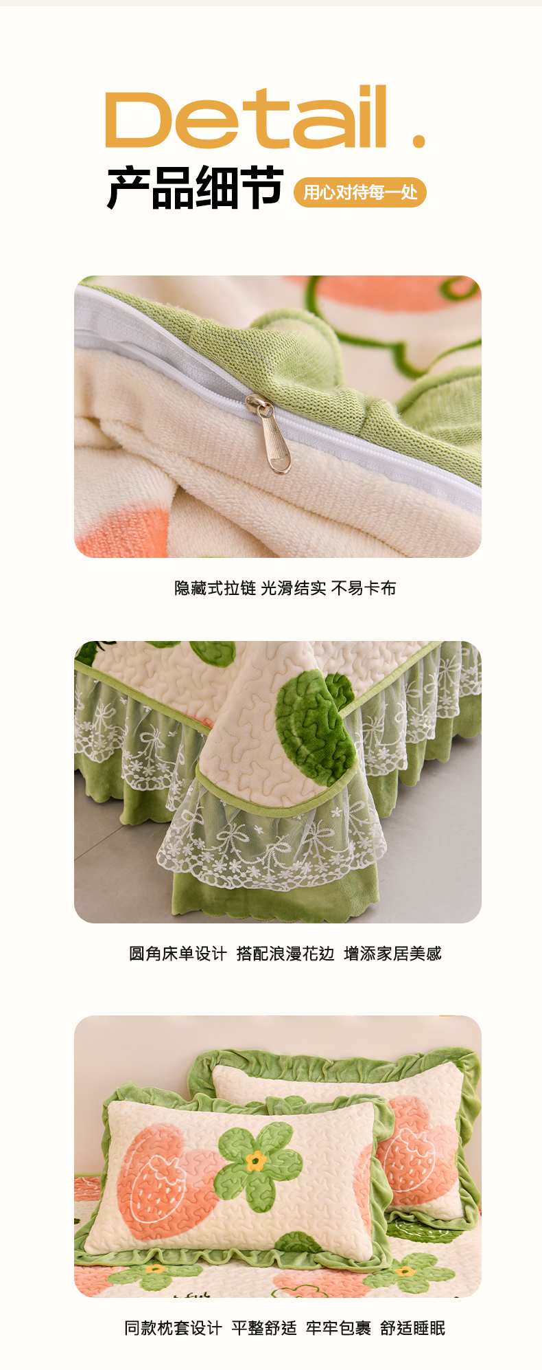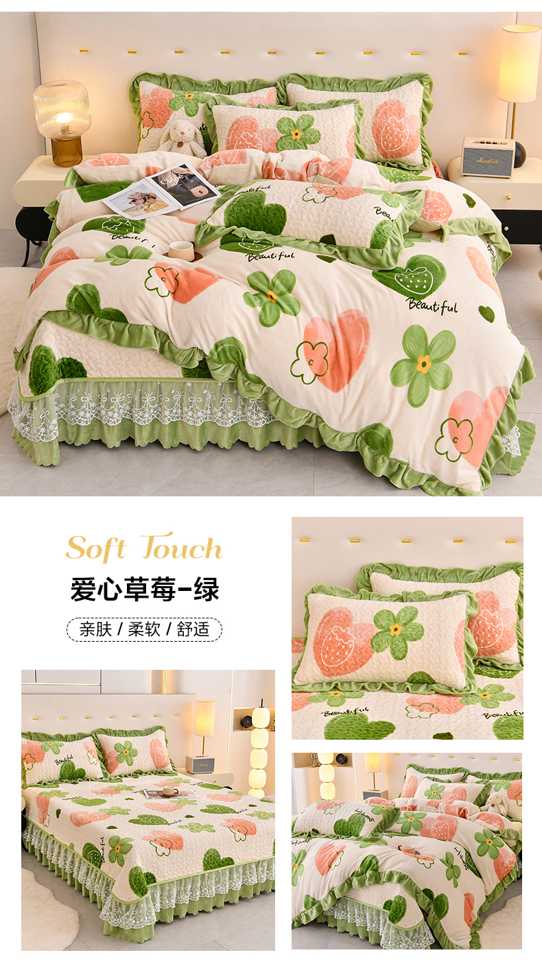 当前位置: 91家纺网 > 商品网购 > 床品套件 > 四件套 > 牛奶绒四件套 > 民新家纺 2025新款牛奶绒印花夹棉床盖四件套 爱心草莓-绿
