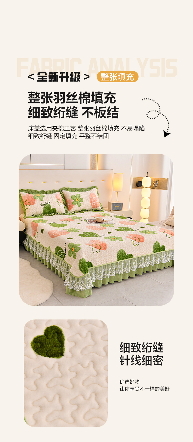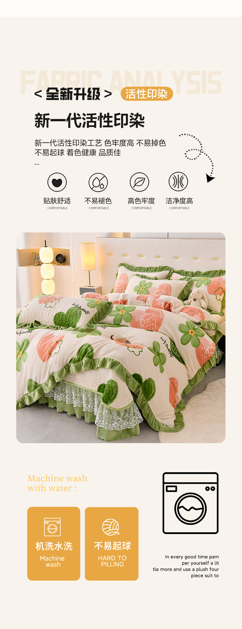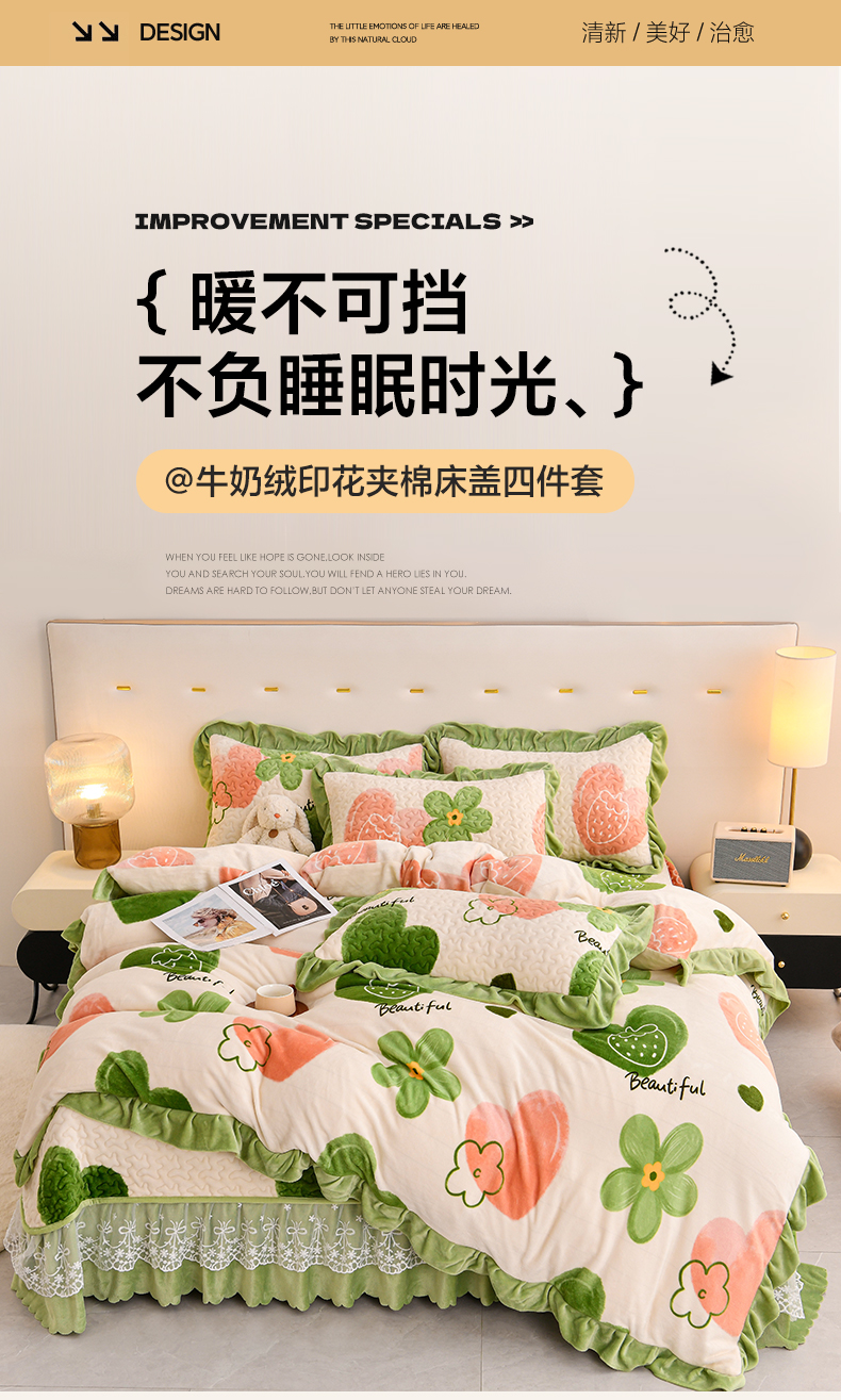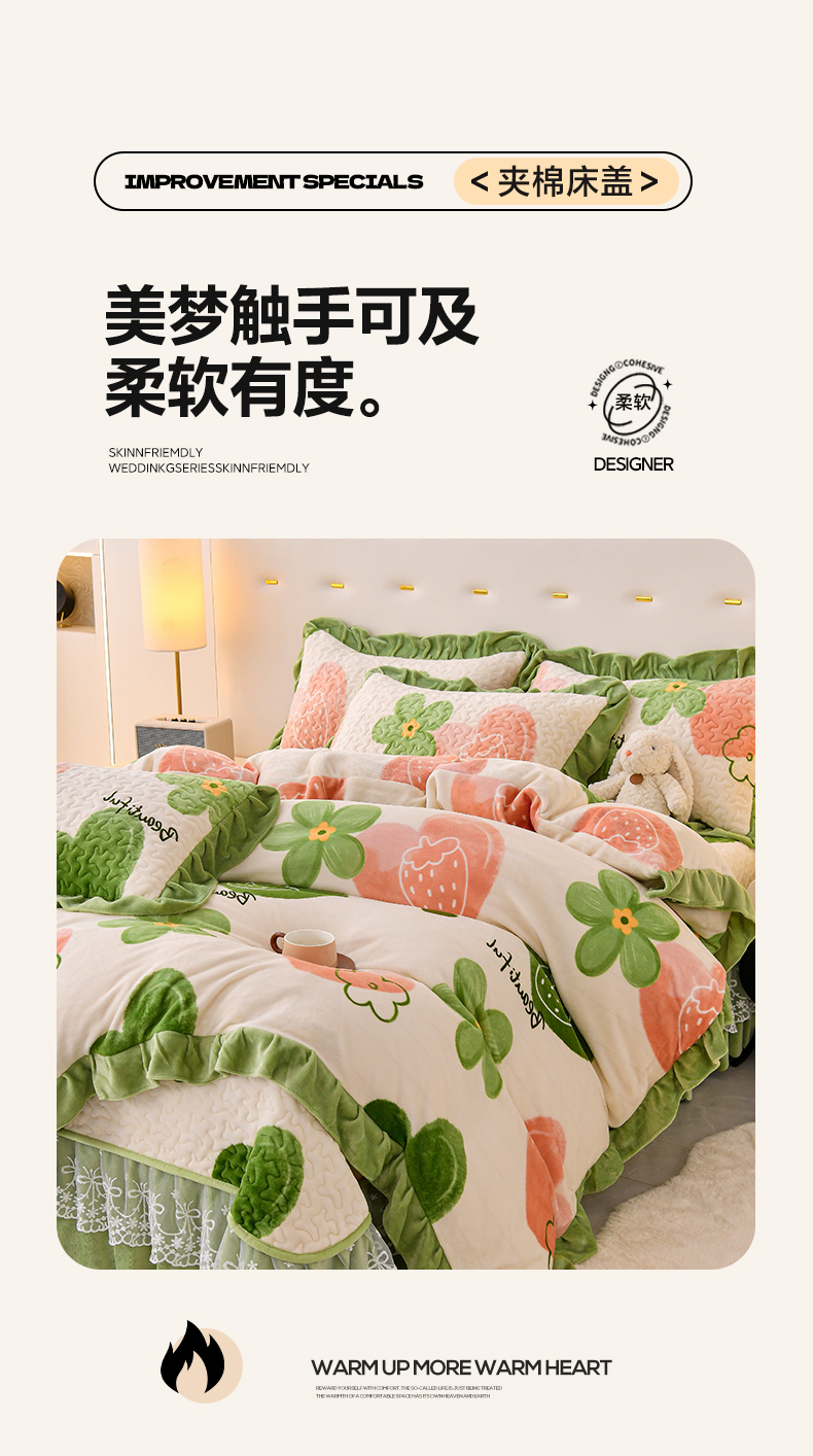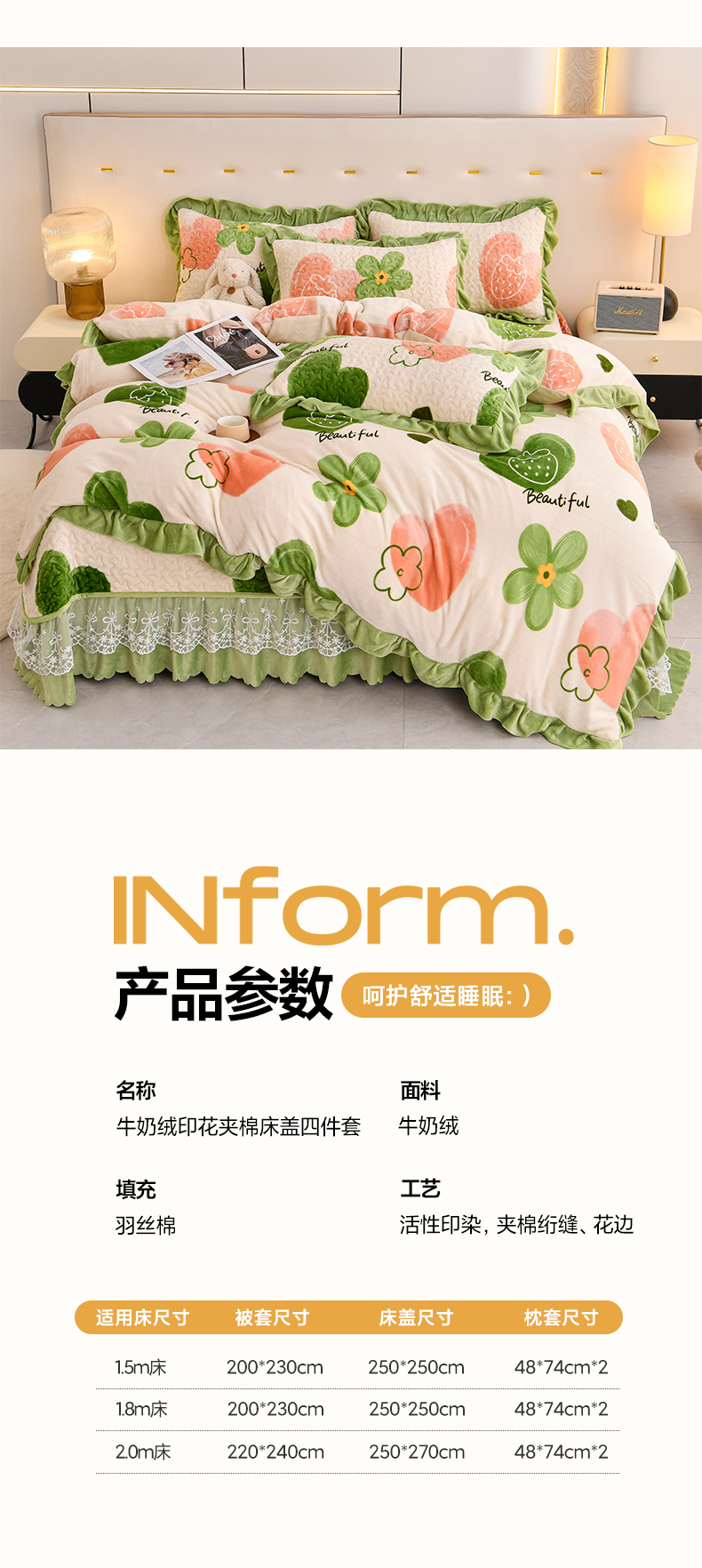 当前位置: 91家纺网 > 商品网购 > 床品套件 > 四件套 > 牛奶绒四件套 > 民新家纺 2025新款牛奶绒印花夹棉床盖四件套 爱心草莓-绿