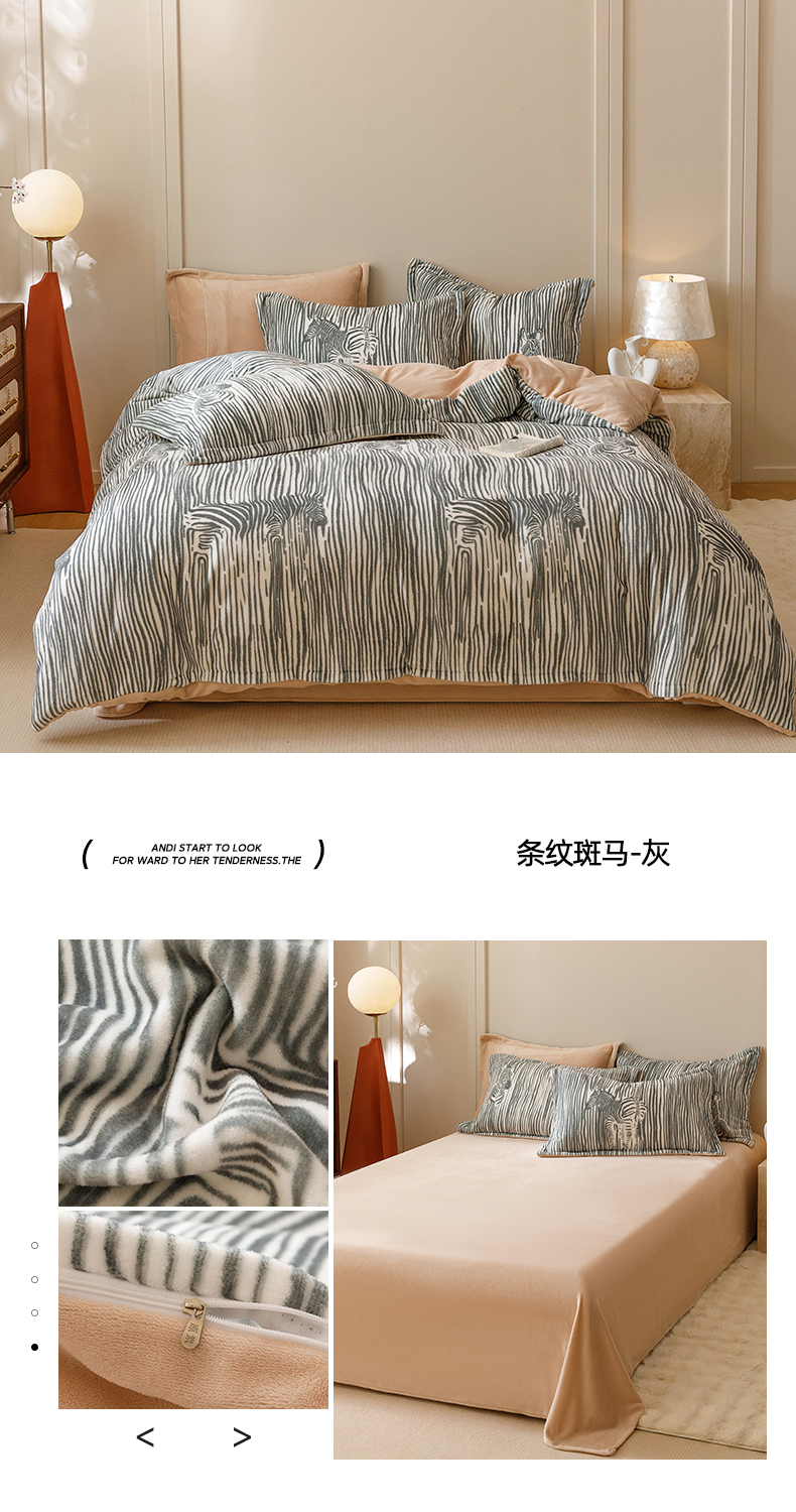 商品名称:卡派 2024新款轻奢肌理纹雕花工艺款230克加厚牛奶绒四件套(提供买家秀 ) 条纹斑马-灰
