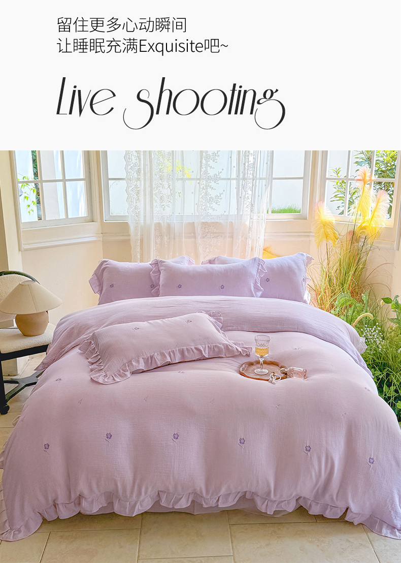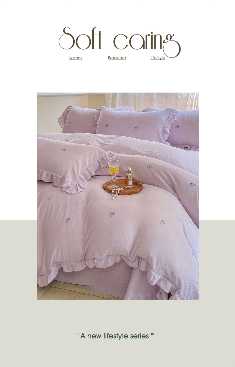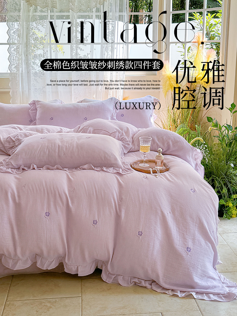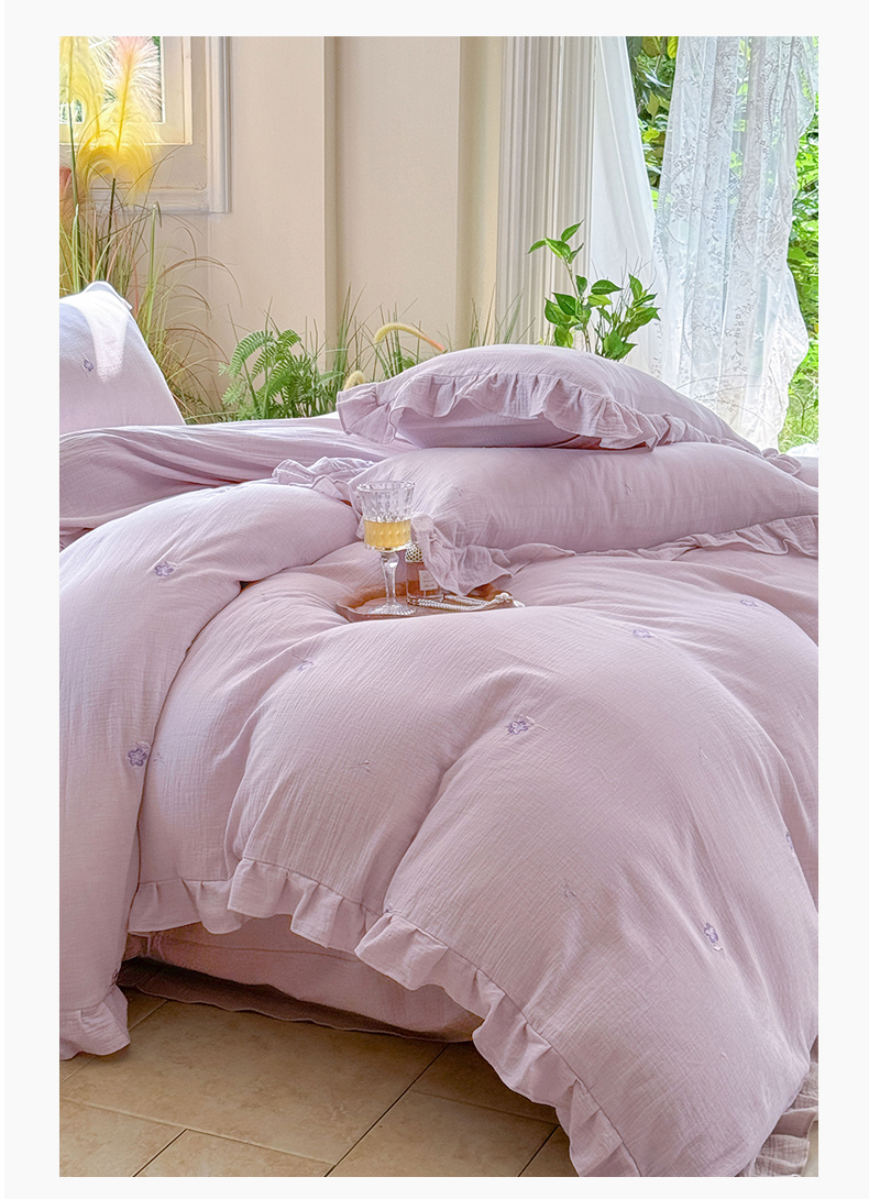 2025新品全棉色织皱皱纱刺绣款四件套 樱花草