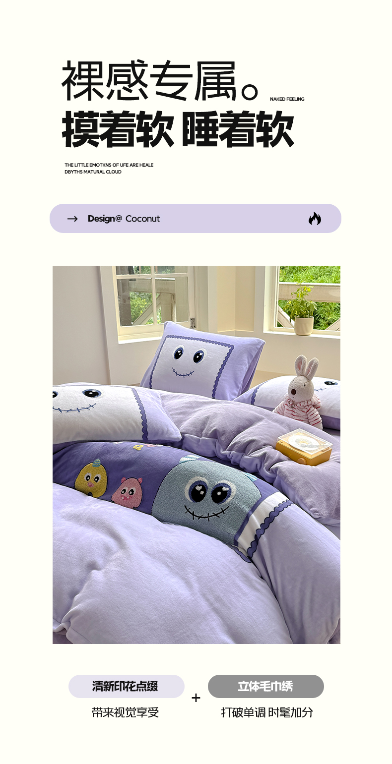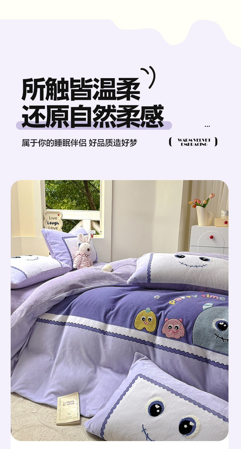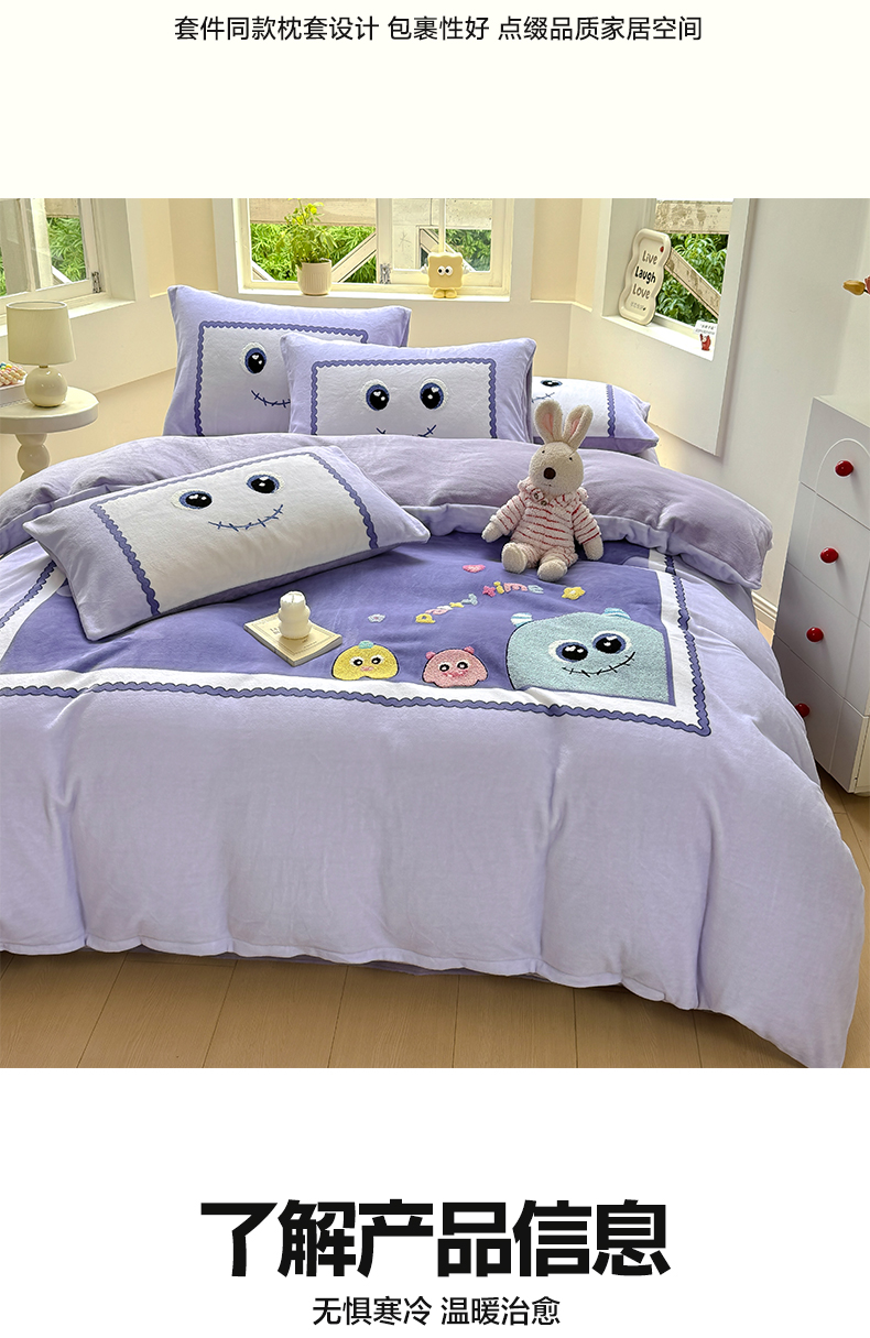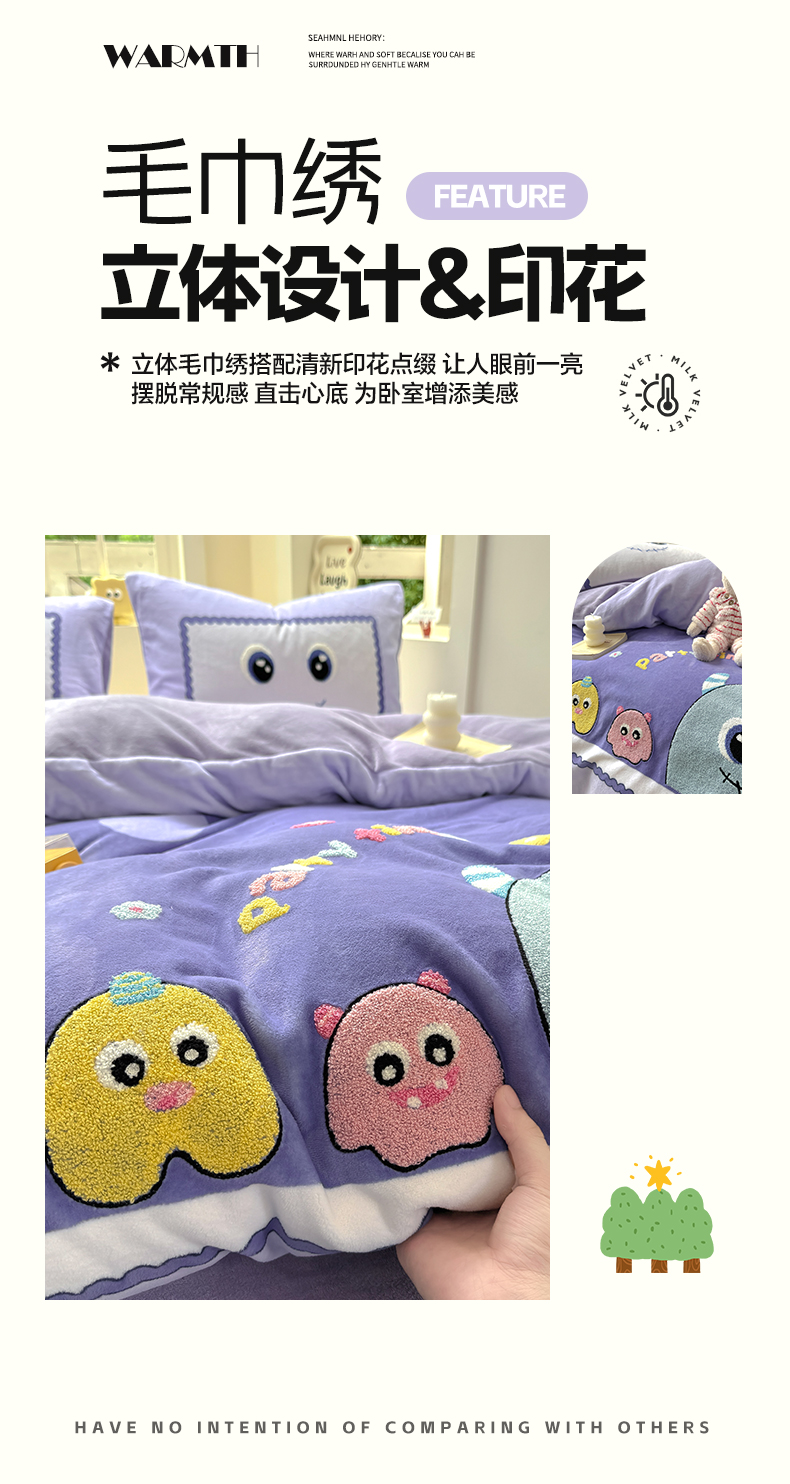 (总)帅露家纺 2025新款A类高克重加厚保暖牛奶绒毛巾绣卡通四件套,背包熊,波点兔,果乐团子,快乐企鹅,懒懒熊,雷欧,猫咪日记,萌宠鸭,梦龙,蘑菇林,暮色星月,南瓜精灵,柠乐乐,桃乐乐