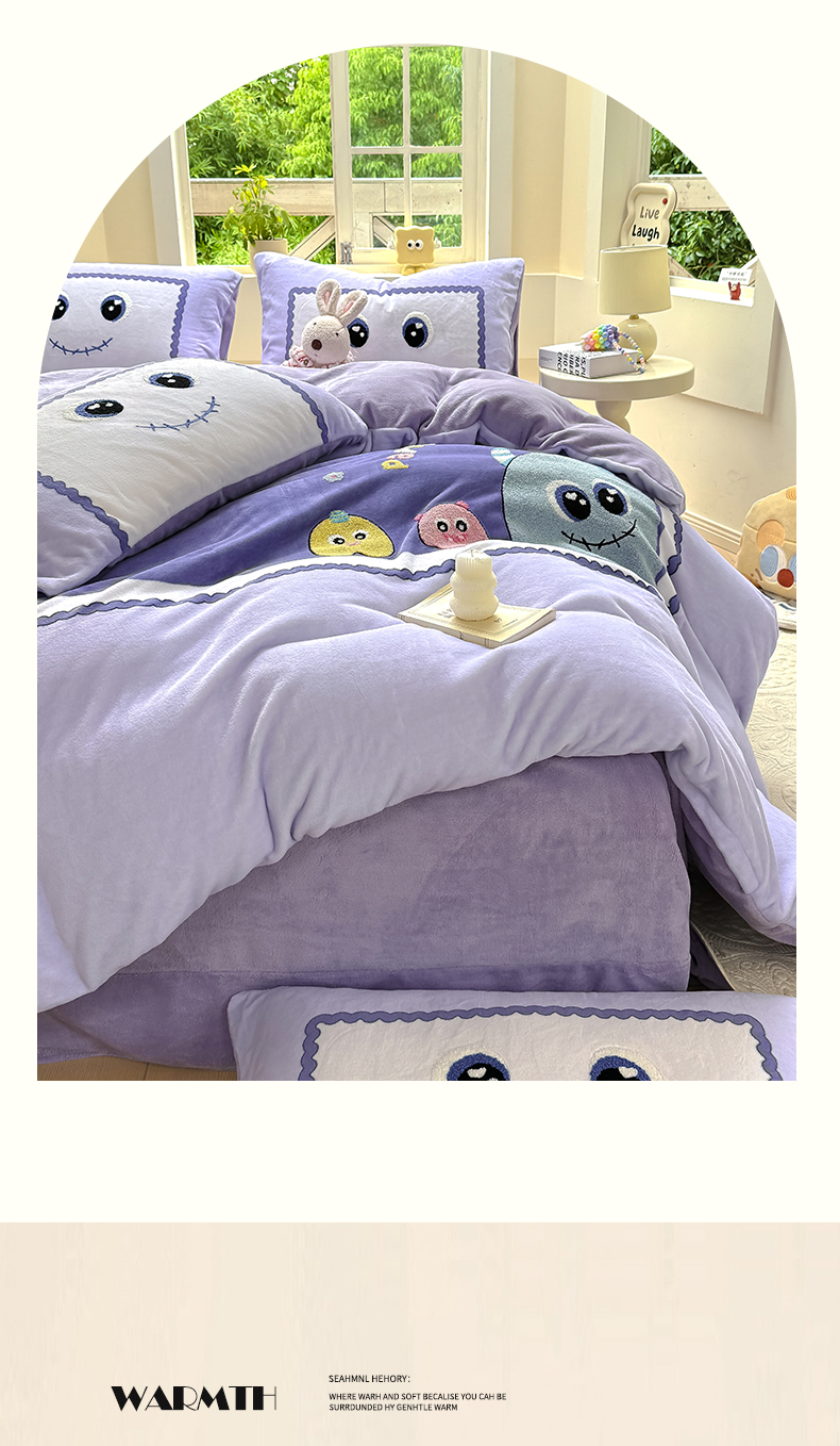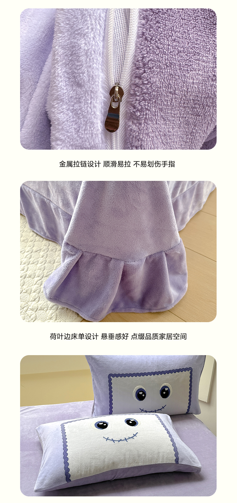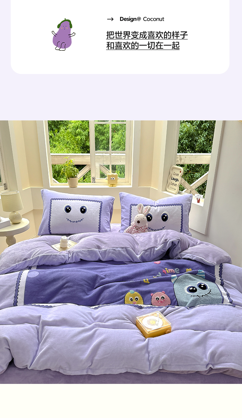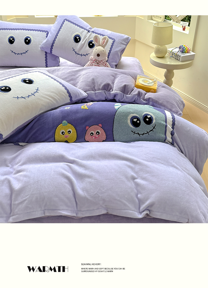 (总)帅露家纺 2025新款A类高克重加厚保暖牛奶绒毛巾绣卡通四件套,背包熊,波点兔,果乐团子,快乐企鹅,懒懒熊,雷欧,猫咪日记,萌宠鸭,梦龙,蘑菇林,暮色星月,南瓜精灵,柠乐乐,桃乐乐