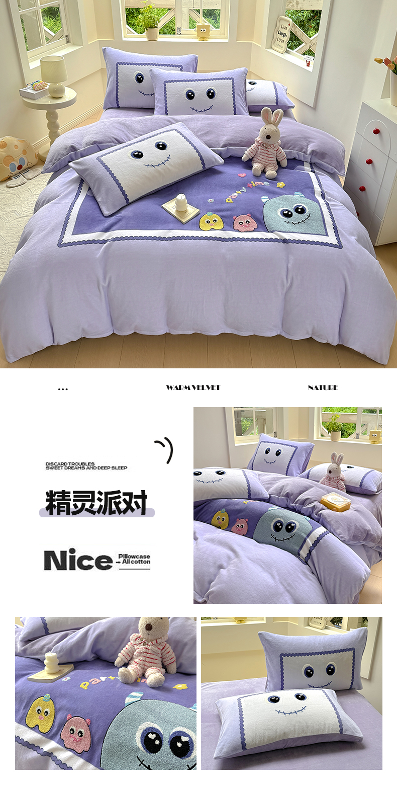 商品名称:帅露家纺 2024新款高克重牛奶绒数码印花毛巾绣四件套 精灵派对