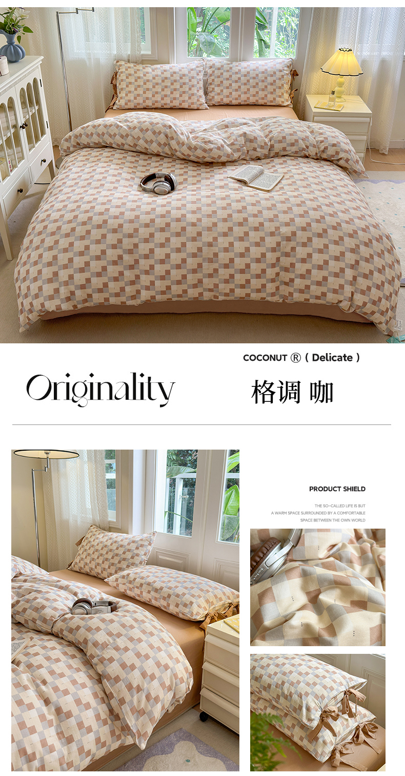 当前位置: 91家纺网 > 商品网购 > 床品套件 > 四件套 > 全棉普通四件套 > 2024秋冬新款系带格子双层纱四件套 格调 咖