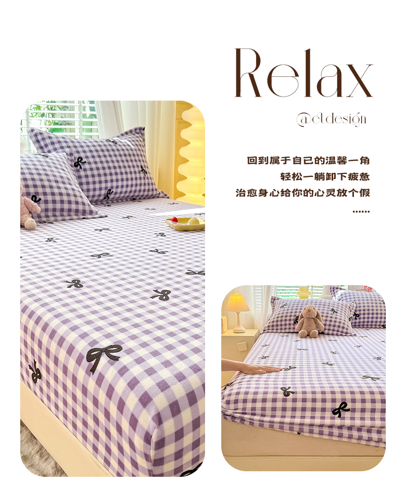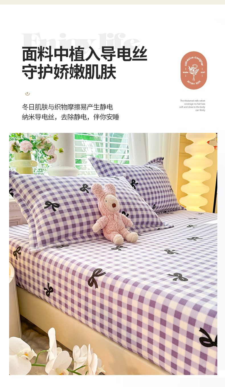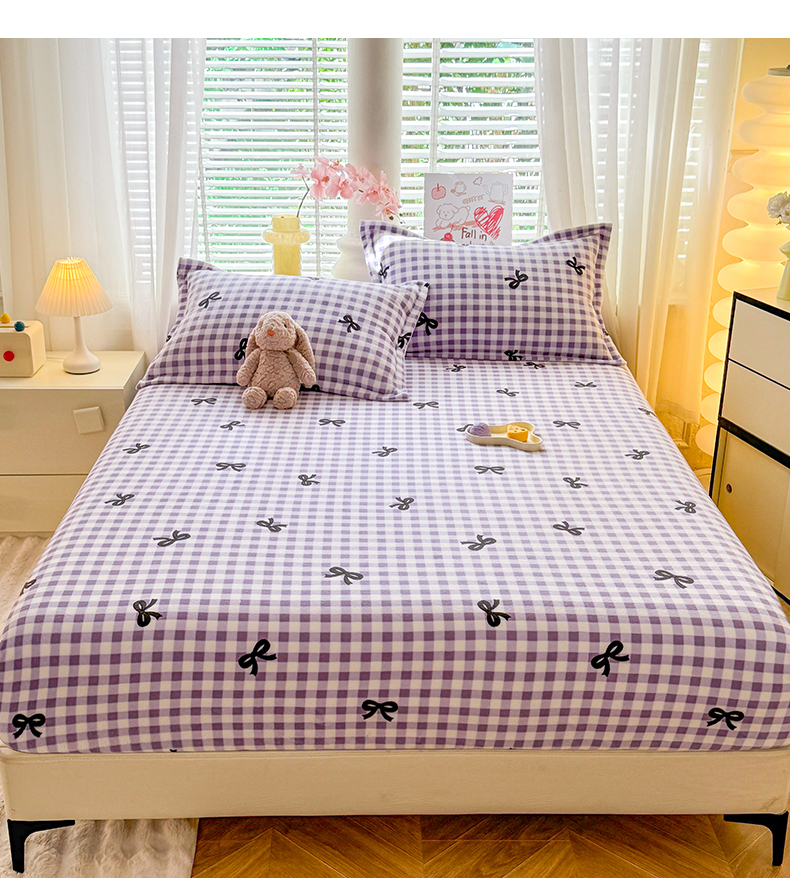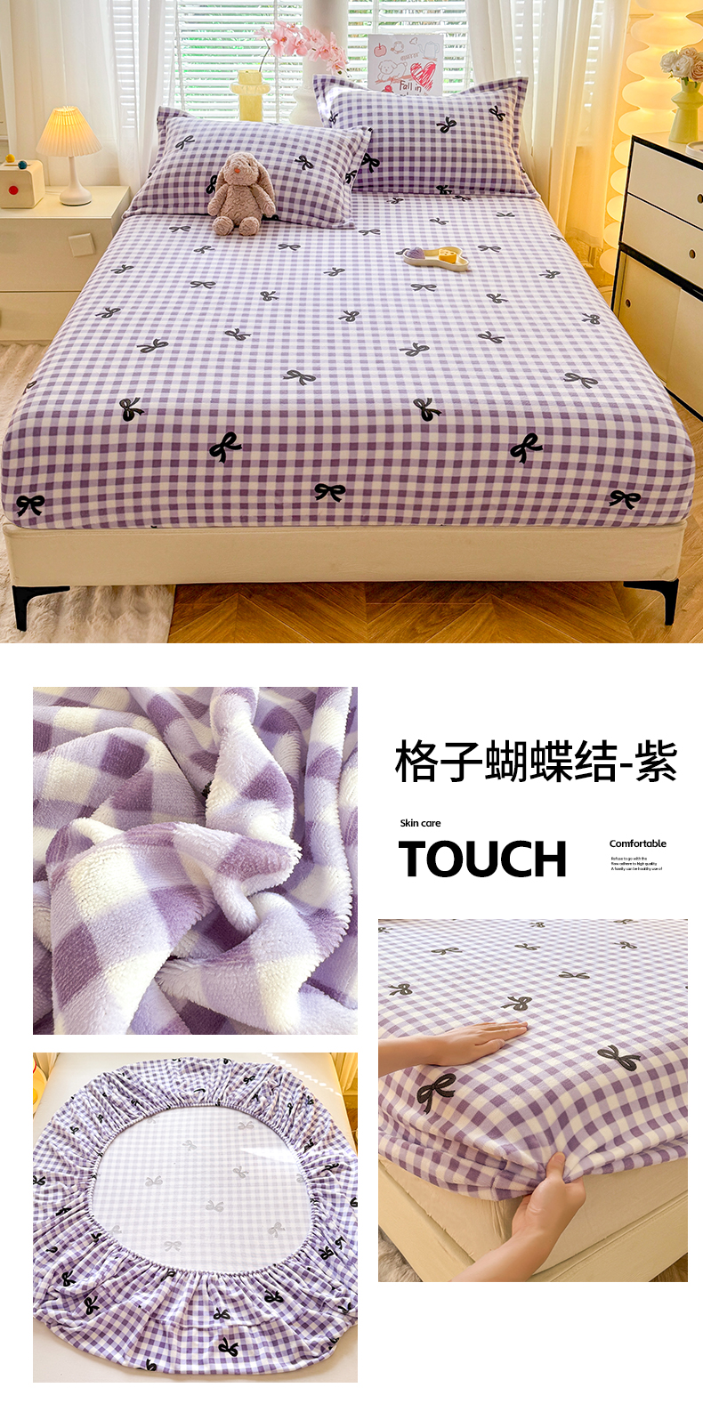 妖妖家纺 2024新款200克牛奶绒单床笠 格子蝴蝶结-紫