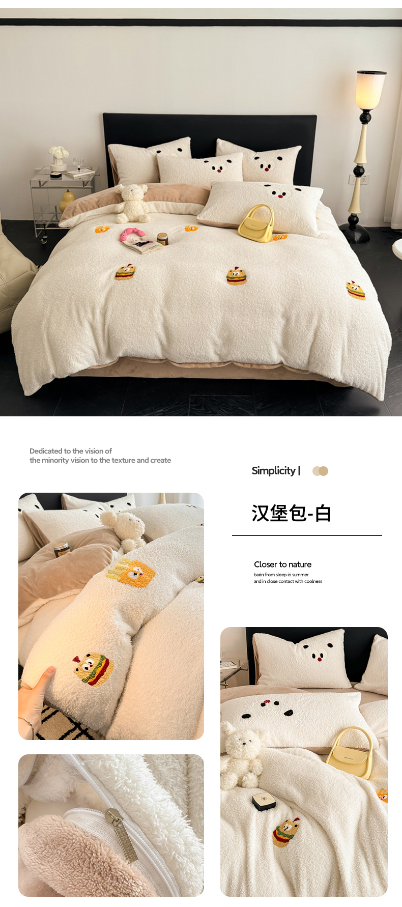 沐辰 2024新款小元素绣花米粒绒牛奶绒四件套 汉堡包-米白