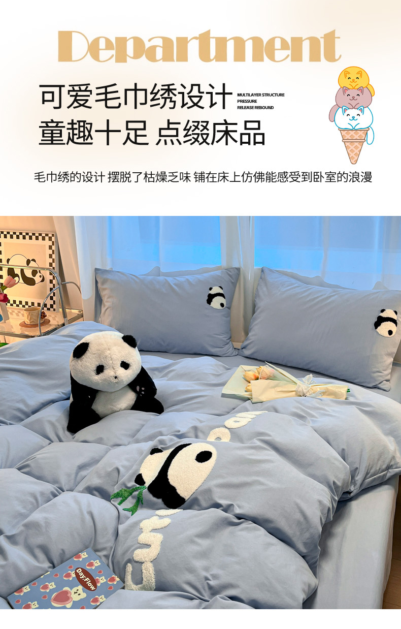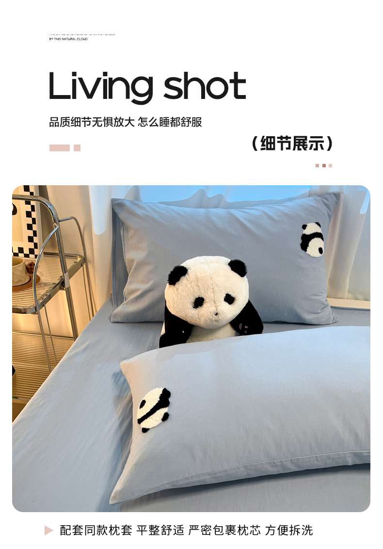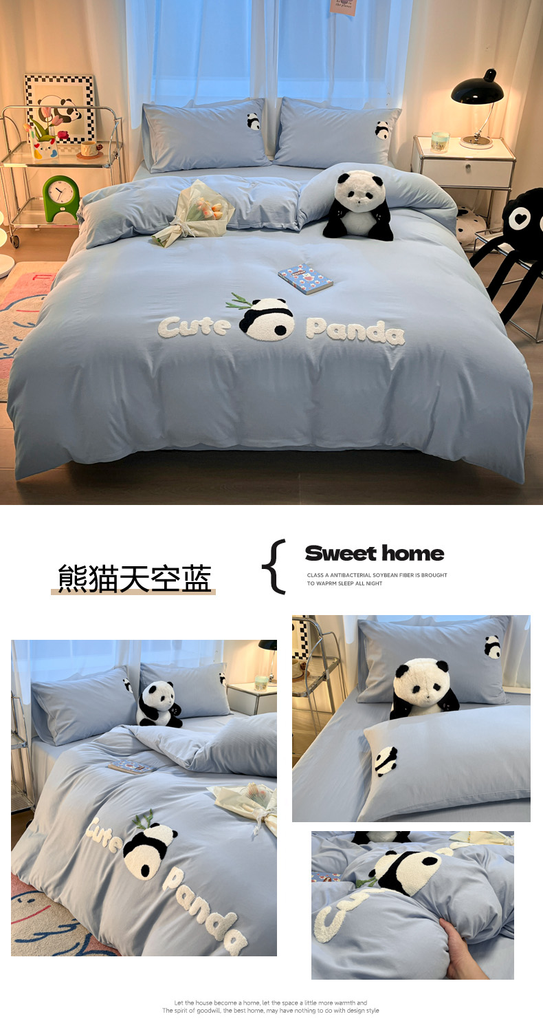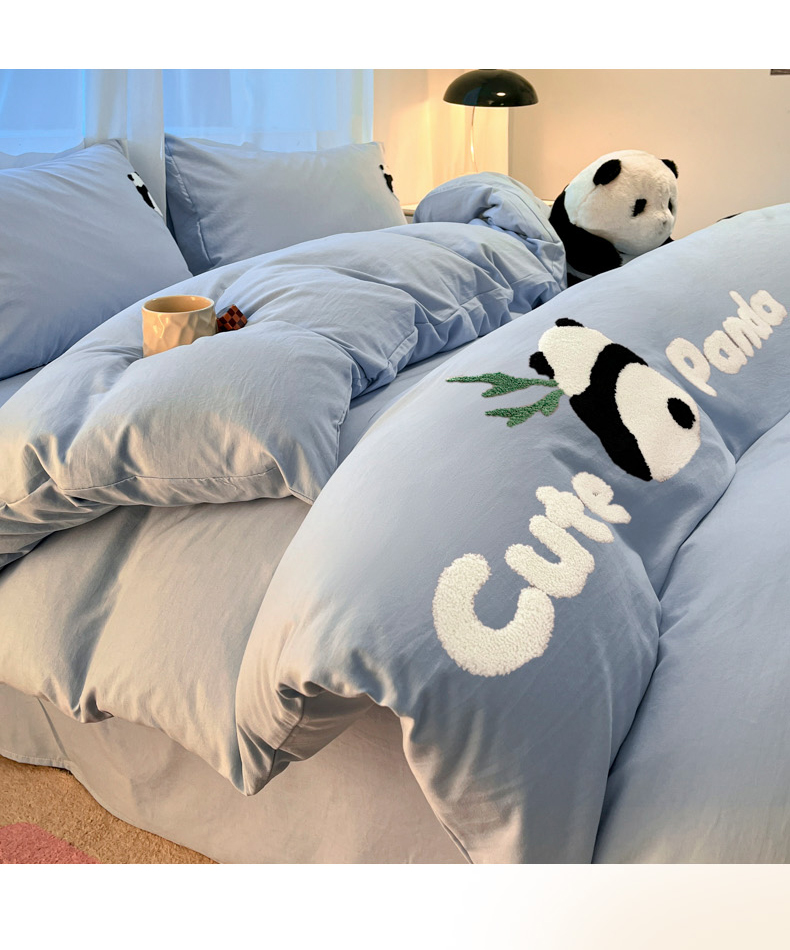 当前位置: 91家纺网 > 商品网购 > 床品套件 > 四件套 > 水洗棉四件套 > 葡萄家 2024新款超柔水洗棉毛巾绣四件套熊猫天空蓝