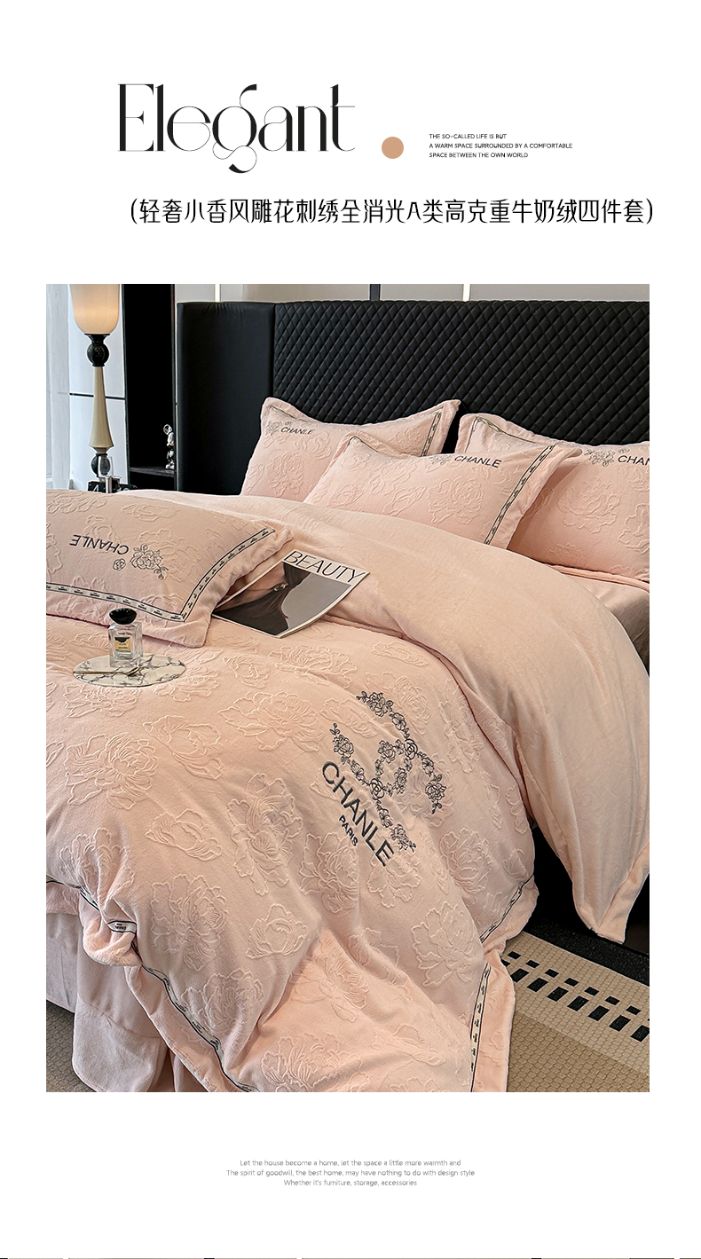 (总)宅家居 2025新款轻奢小香风雕花刺绣全消光A类高克重牛奶绒四件套-小香牡丹