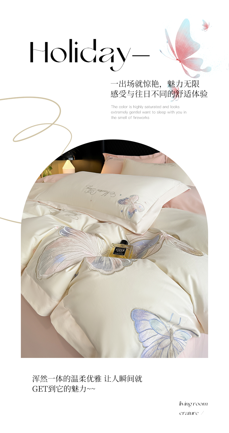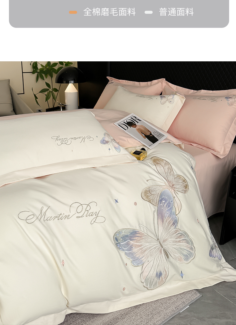 理想家家纺 2024新款纯棉磨毛刺绣四件套-梦蝶 梦蝶-白