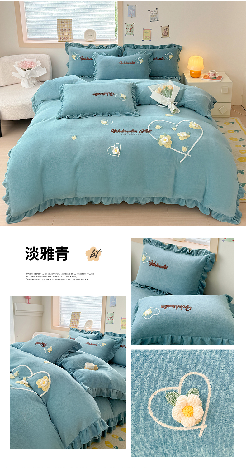 商品名称:金米诺 2024新款牛奶绒毛巾绣四件套 淡雅青