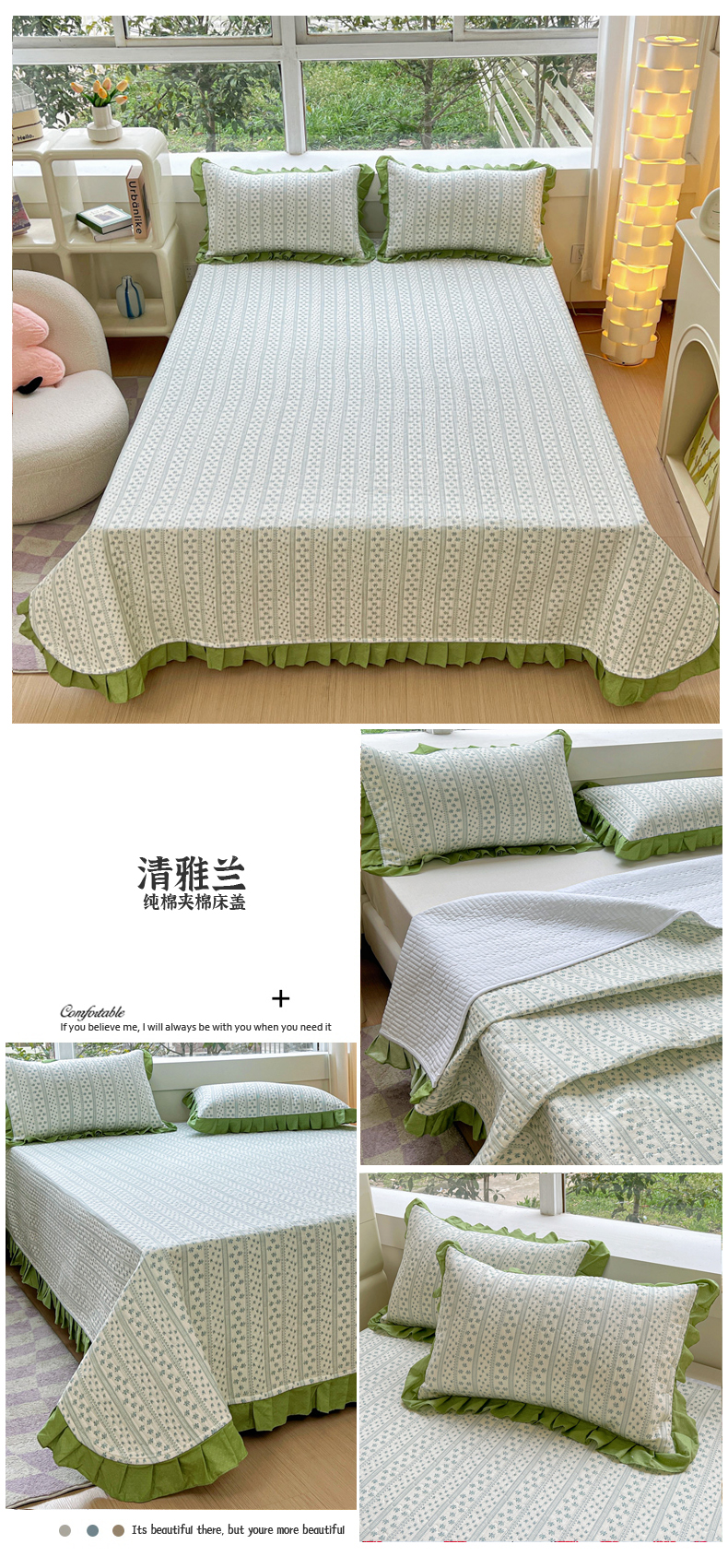 2024新款13372全棉斜纹夹棉绗缝纯棉花边床盖 清雅兰