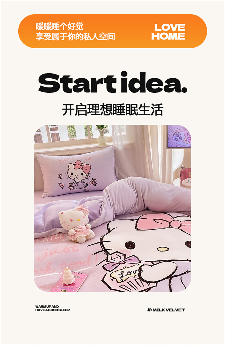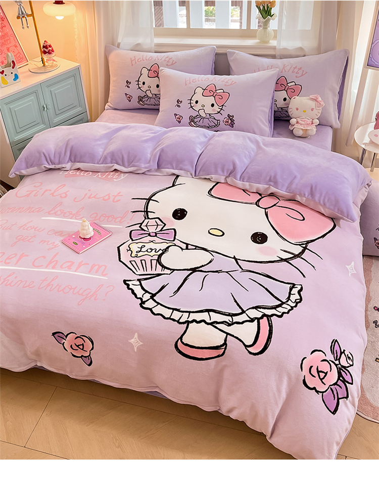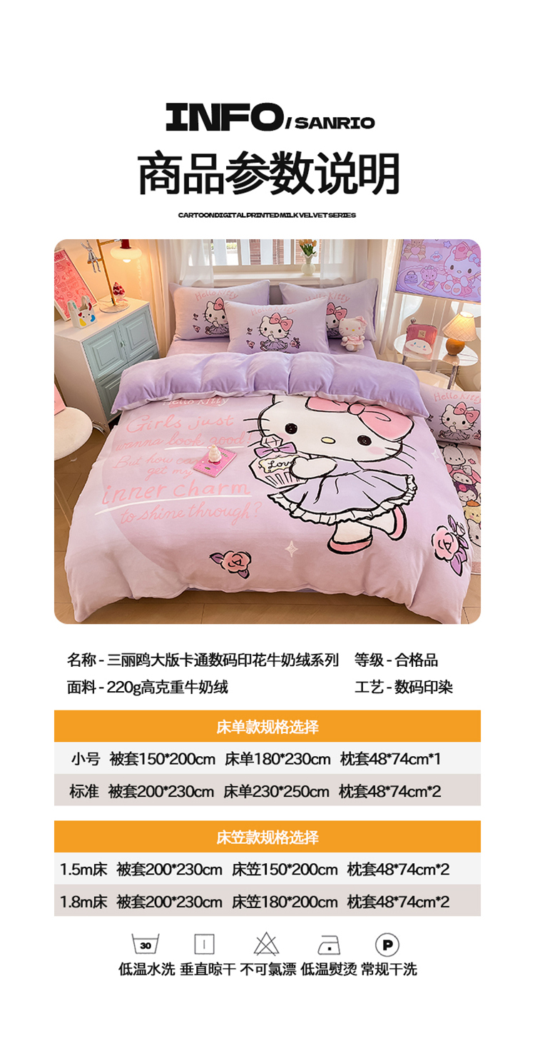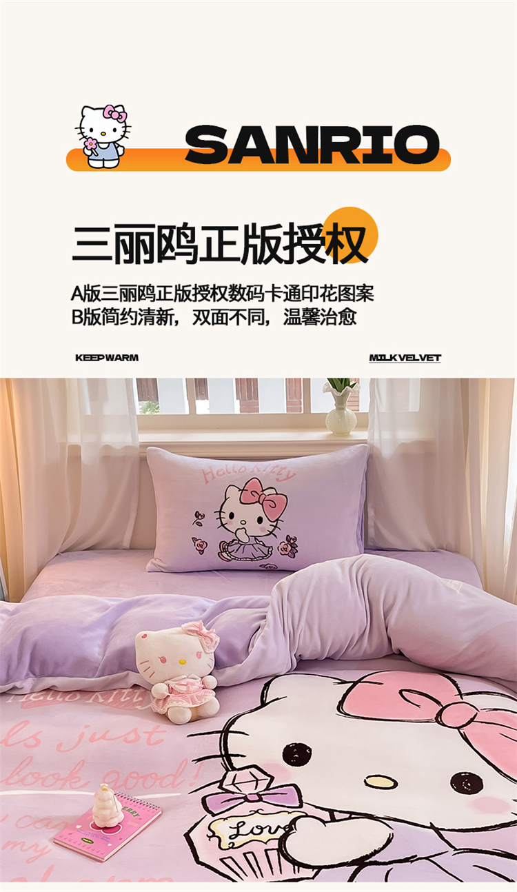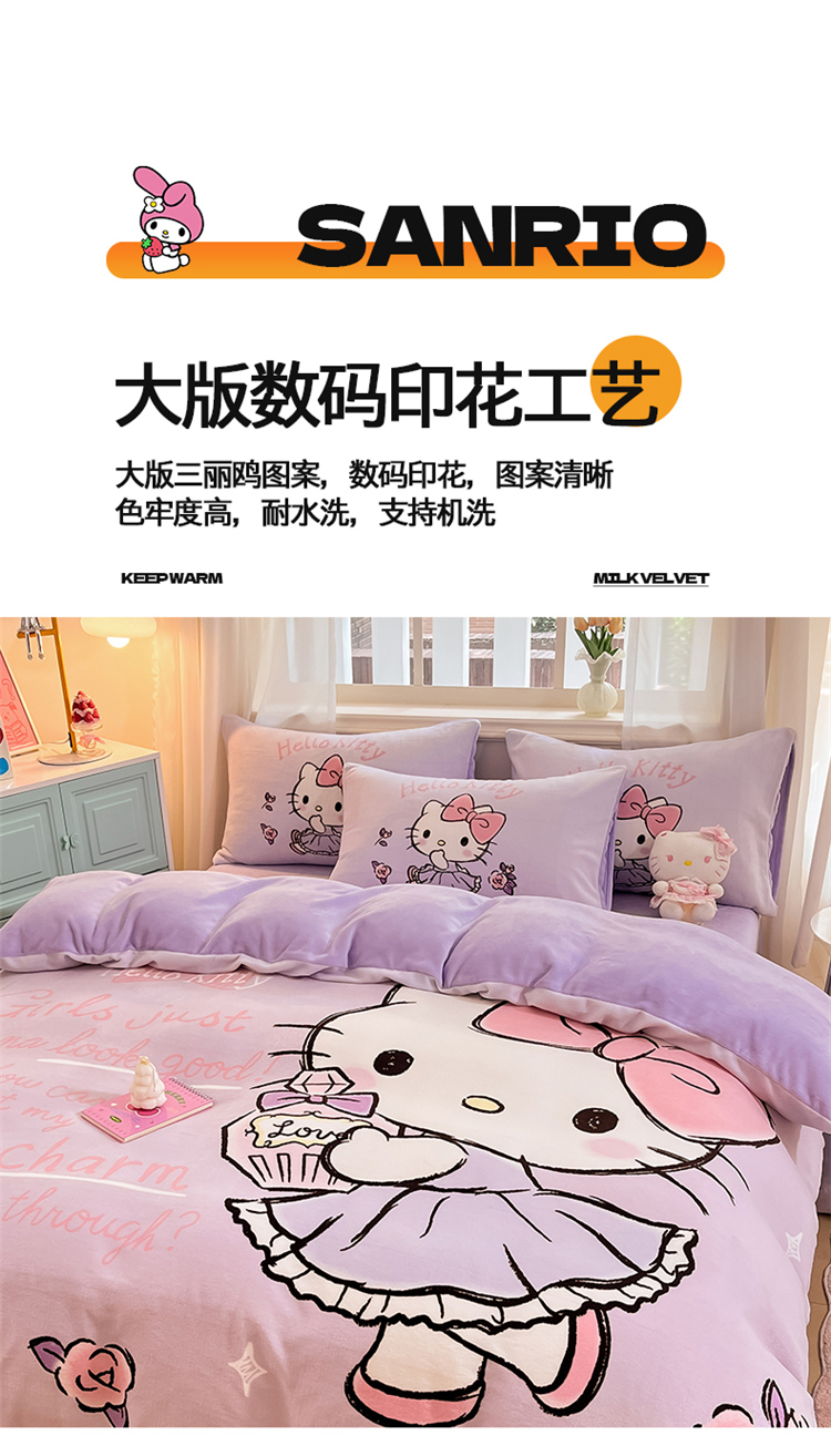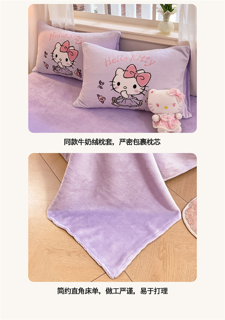 当前位置: 91家纺网 > 商品网购 > 床品套件 > 四件套 > 牛奶绒四件套 > A类母婴级库洛米美乐蒂三丽鸥正版授权卡通儿童牛奶绒双面牛奶绒四件套珊瑚绒四件套 绒大版-R玫瑰香水kitty