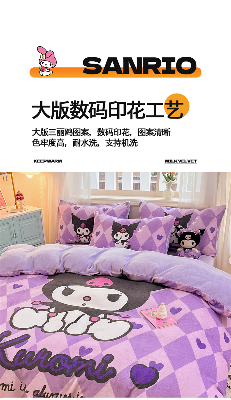 当前位置: 91家纺网 > 商品网购 > 床品套件 > 四件套 > 牛奶绒四件套 > A类母婴级库洛米美乐蒂三丽鸥正版授权卡通儿童牛奶绒双面牛奶绒四件套珊瑚绒四件套 绒大版-R桃心美美库洛米