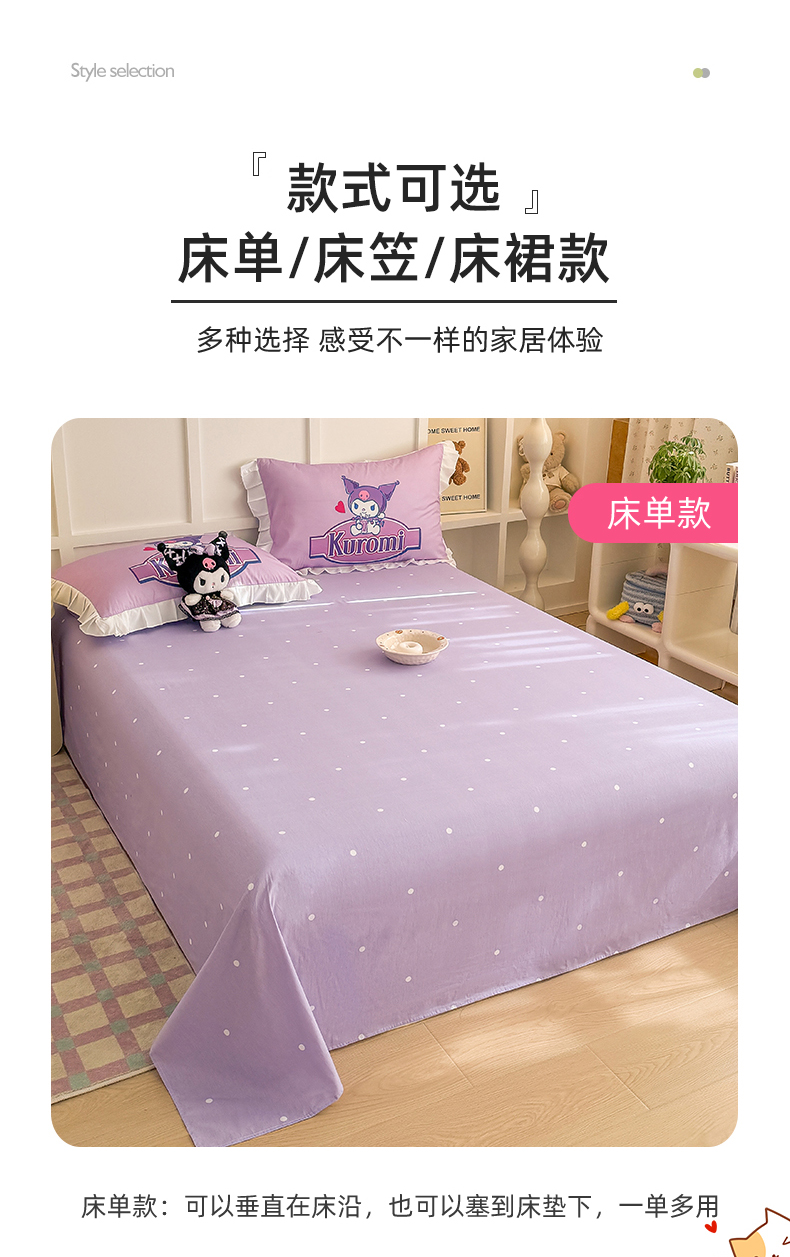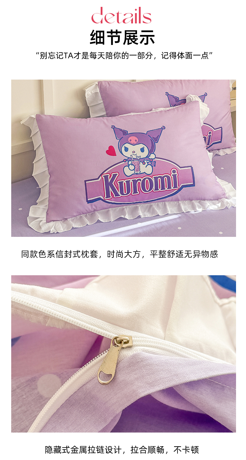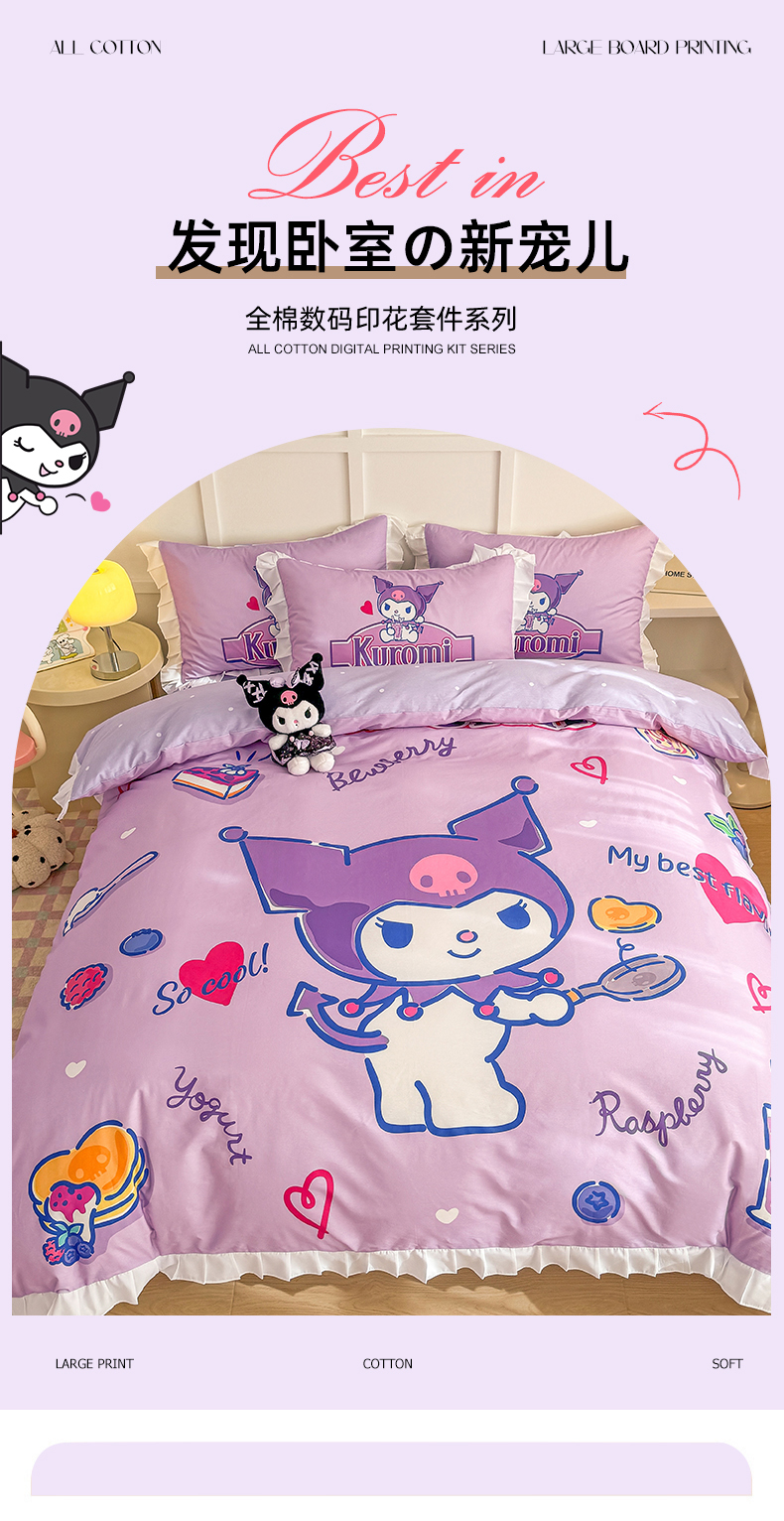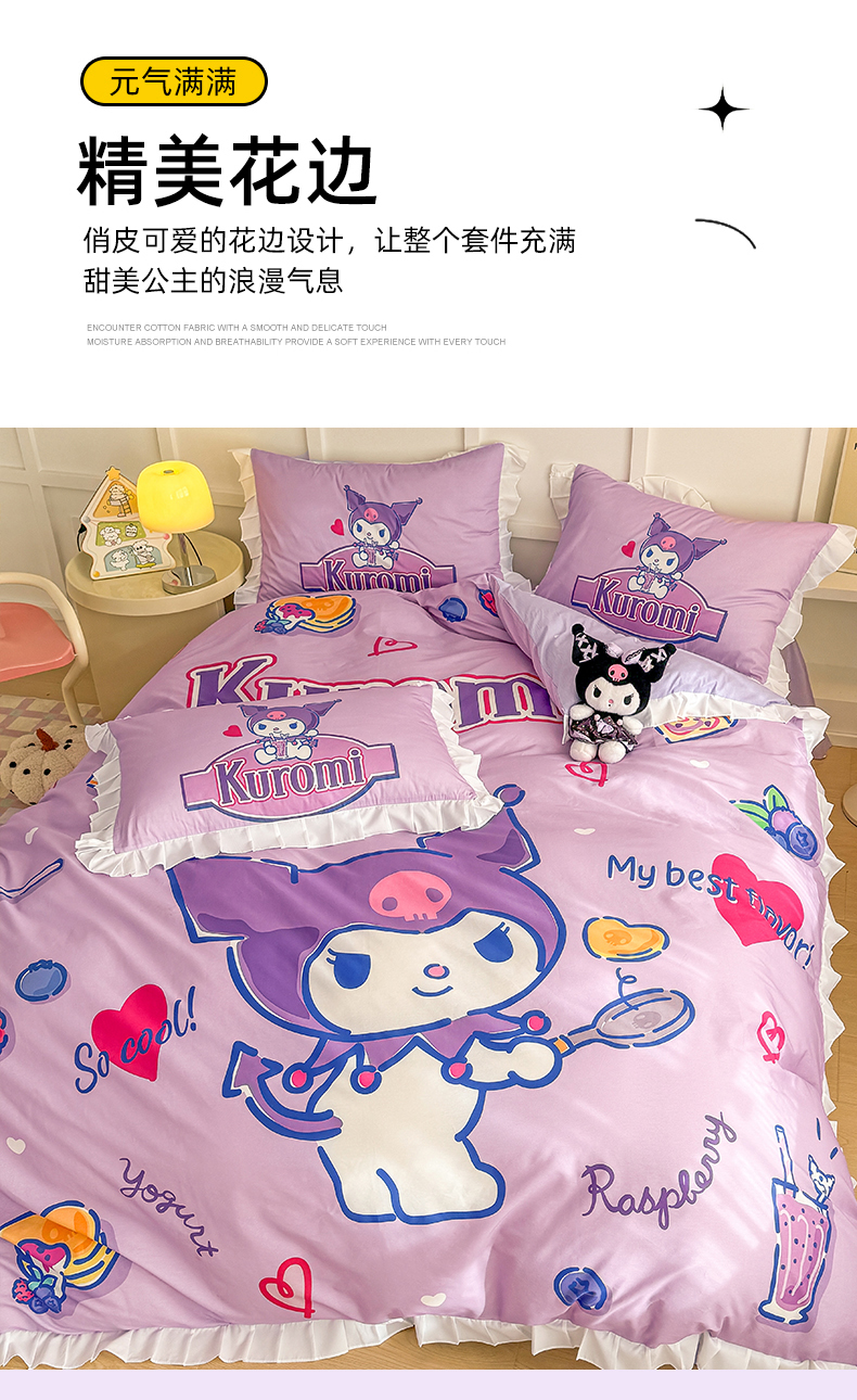 当前位置: 91家纺网 > 商品网购 > 床品套件 > 四件套 > 全棉普通四件套 > 玉元坊 2025年新款三丽鸥系列数码印花纯棉全棉床裙三件套四件套-花边款式 大版花边-蓝莓库洛米