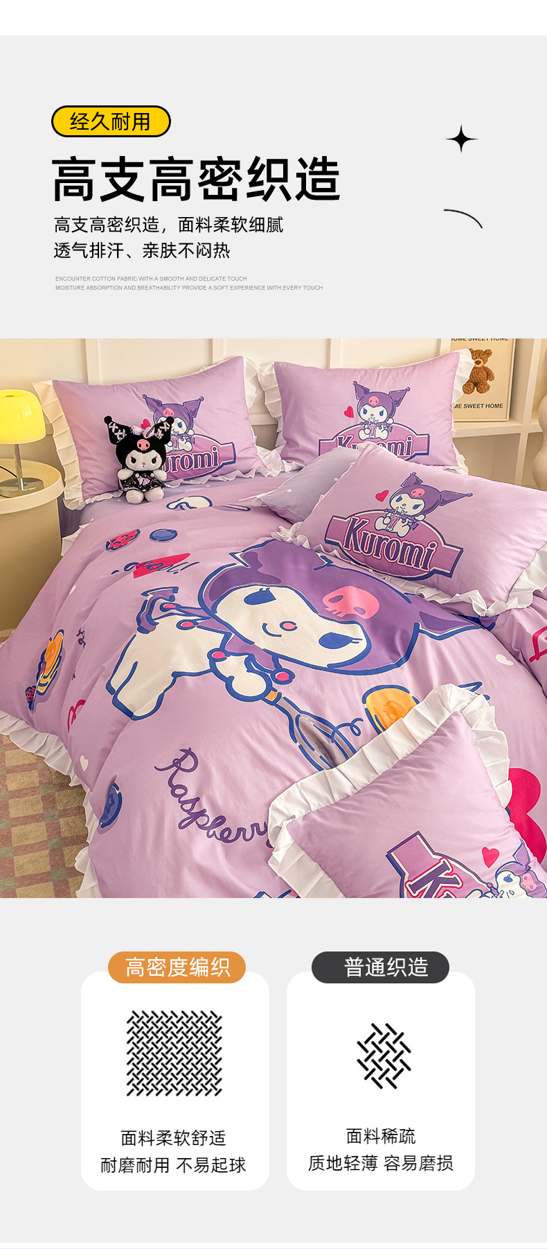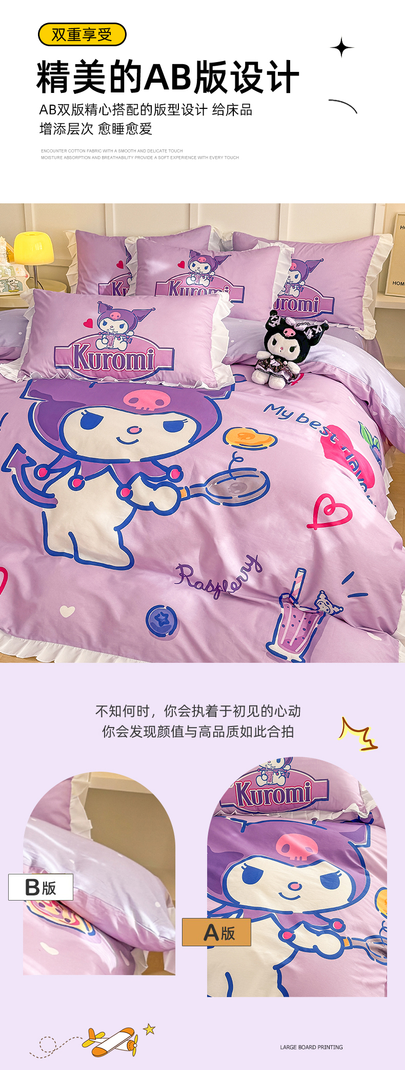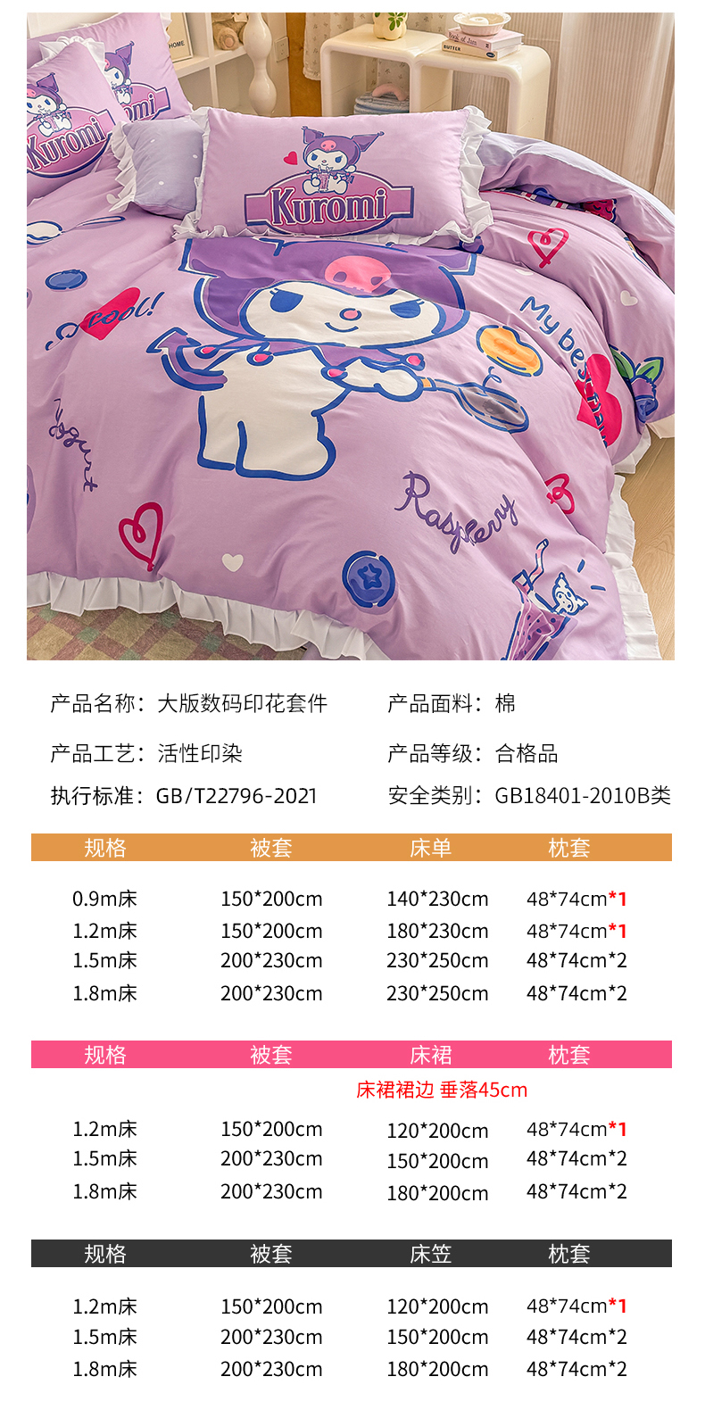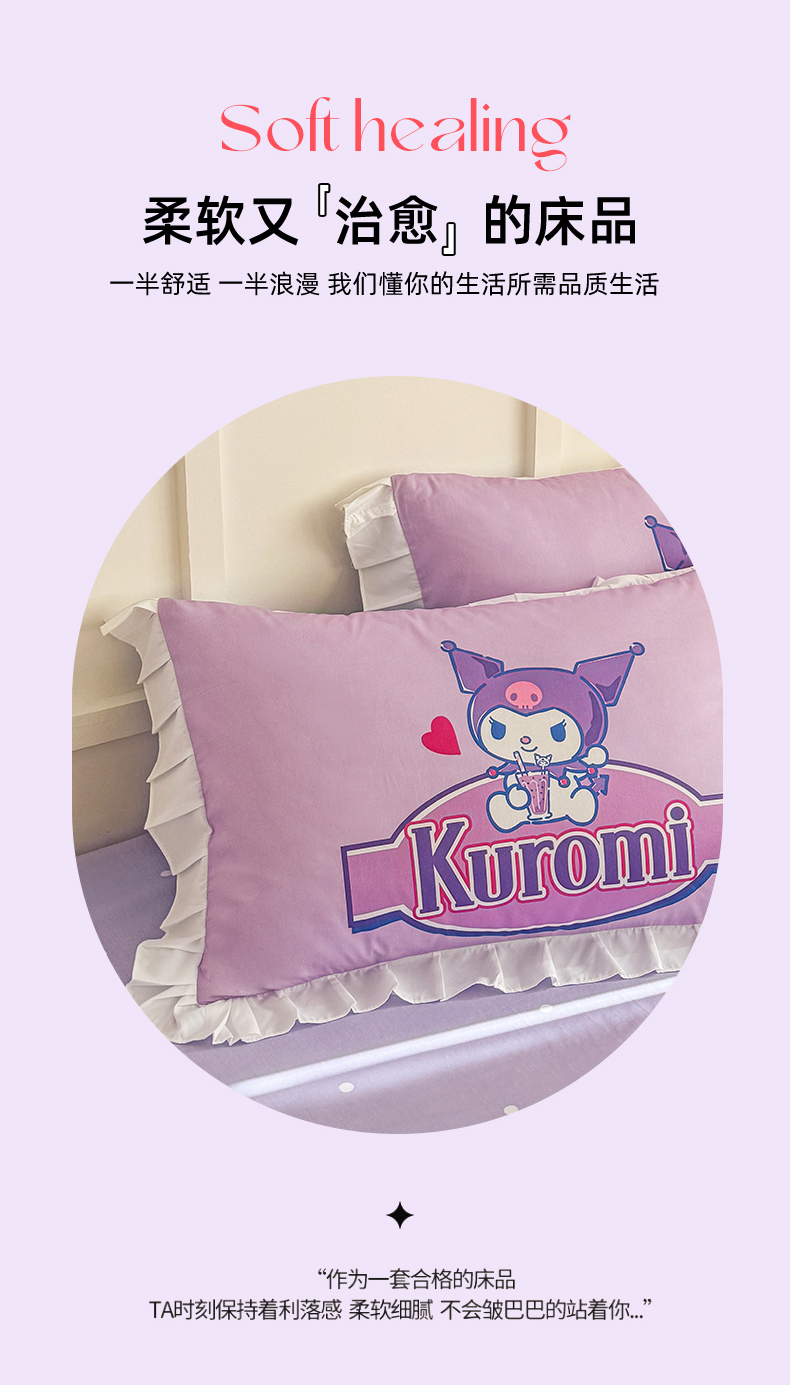 当前位置: 91家纺网 > 商品网购 > 床品套件 > 四件套 > 全棉普通四件套 > 玉元坊 2025年新款三丽鸥系列数码印花纯棉全棉床裙三件套四件套-花边款式 大版花边-蓝莓库洛米