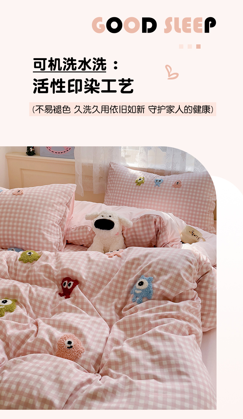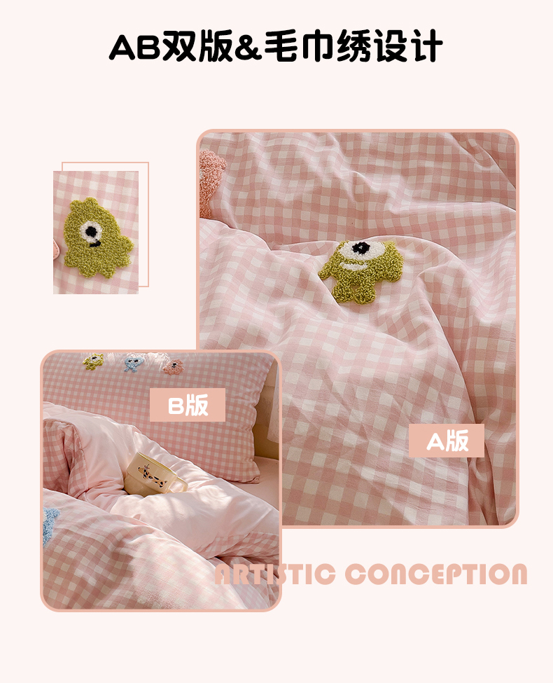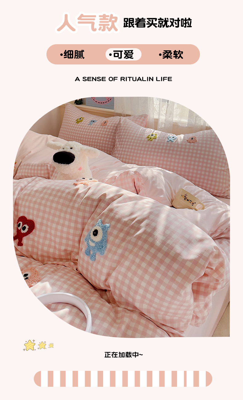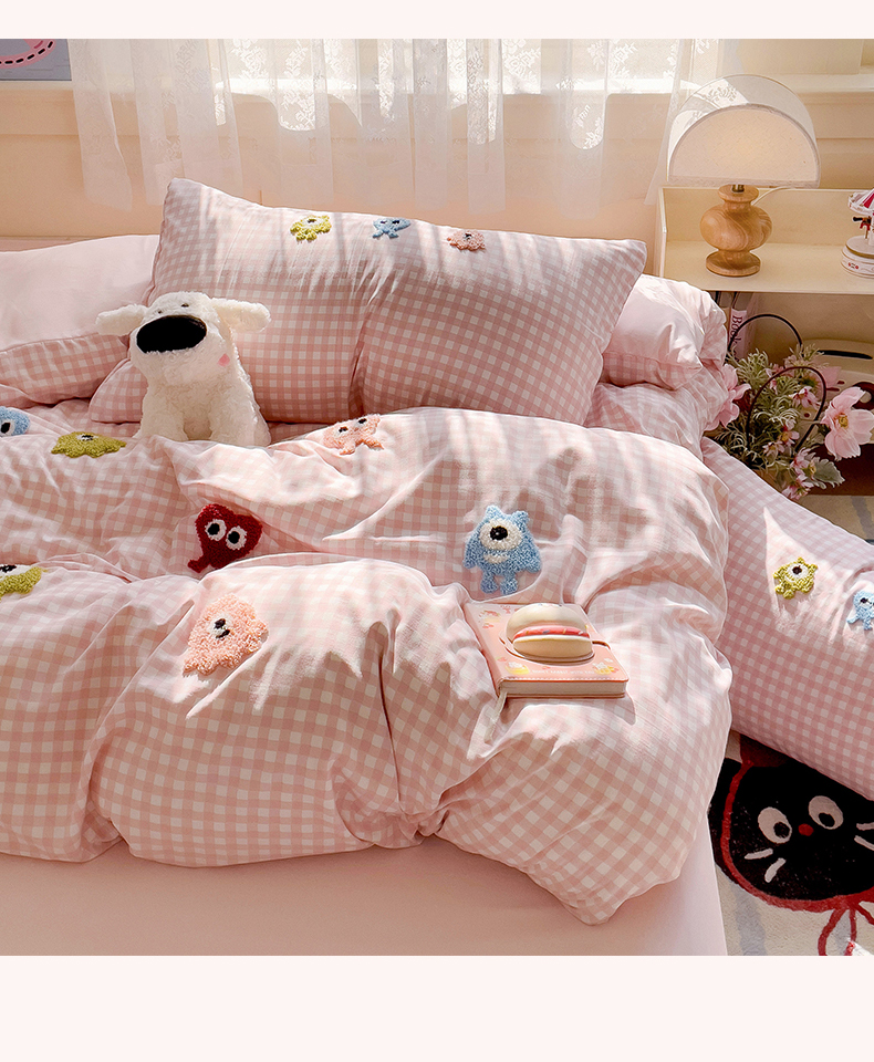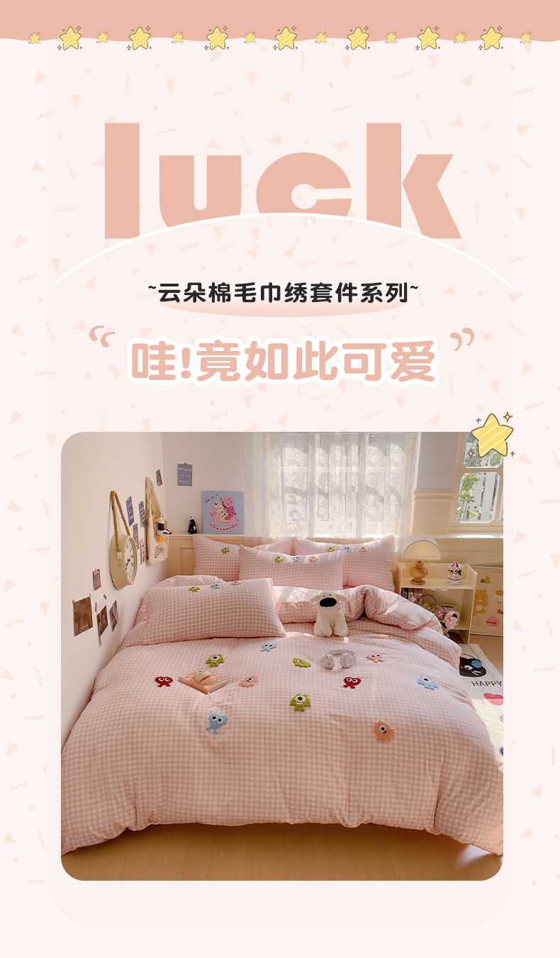当前位置: 91家纺网 > 商品网购 > 床品套件 > 四件套 > 其它四件套 > 梦之岛 2025新款多巴胺ins云朵棉小怪兽可爱毛巾绣四件套 格子小怪兽-粉
