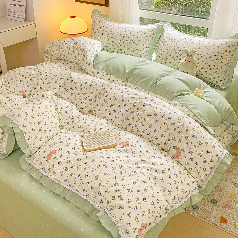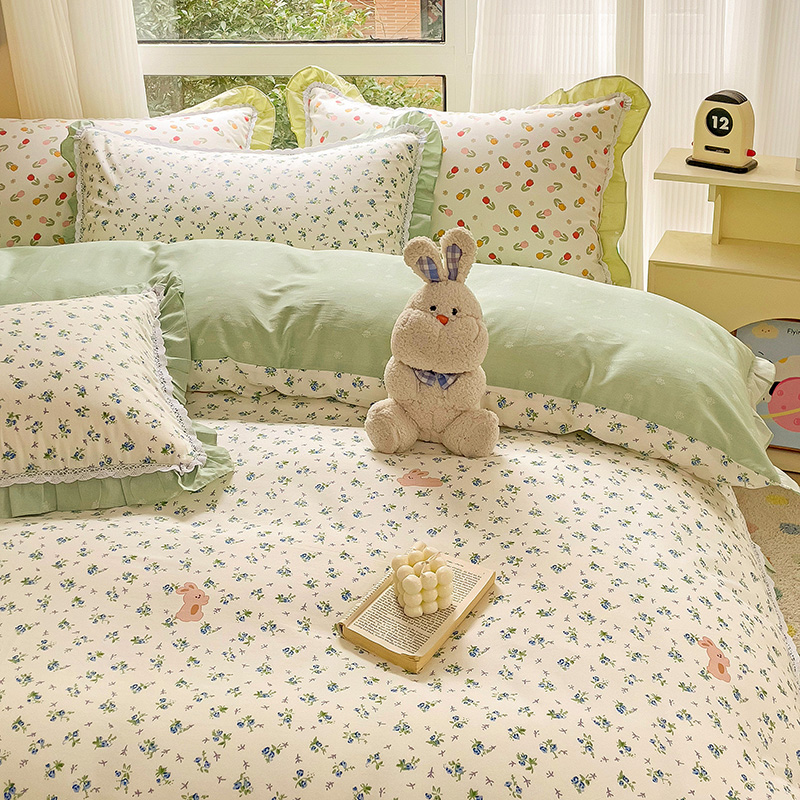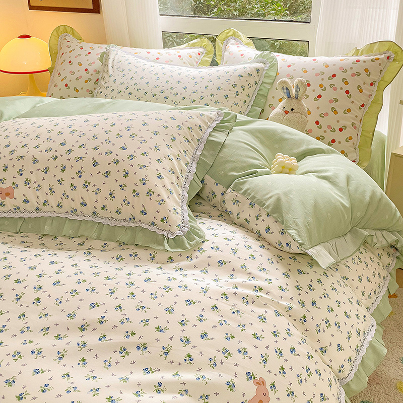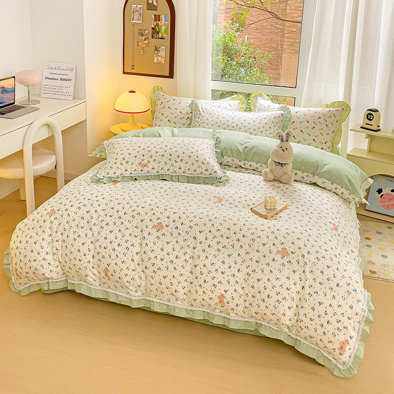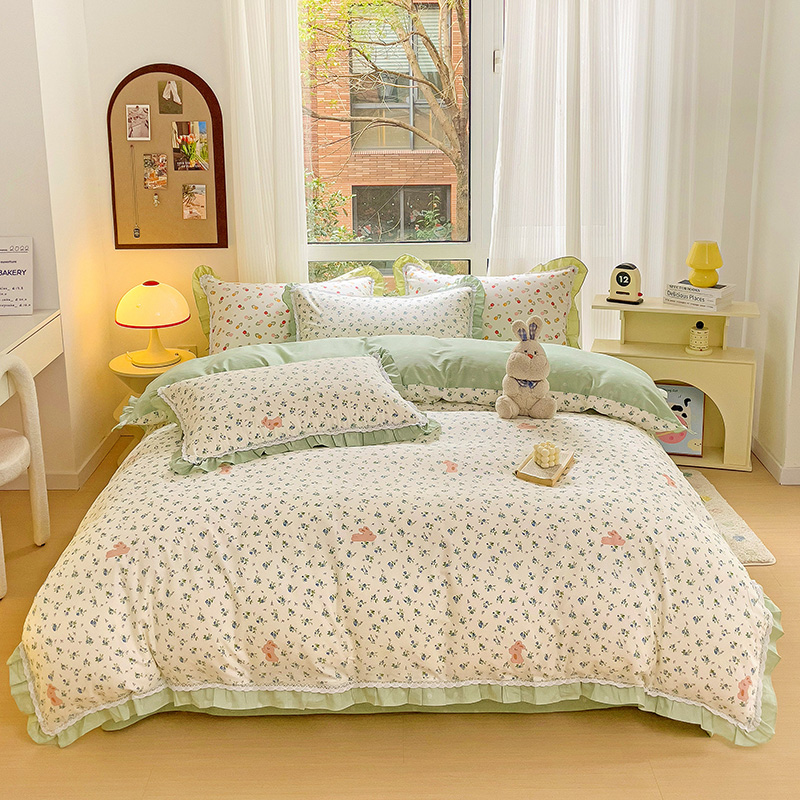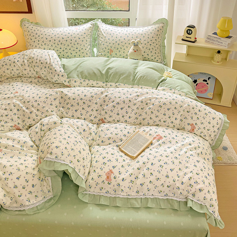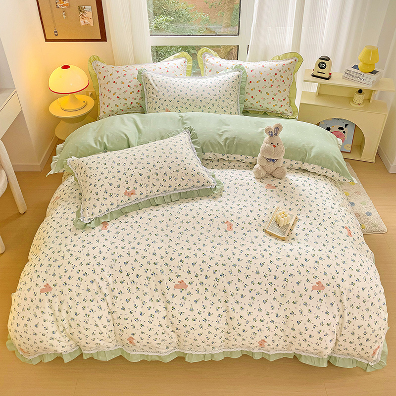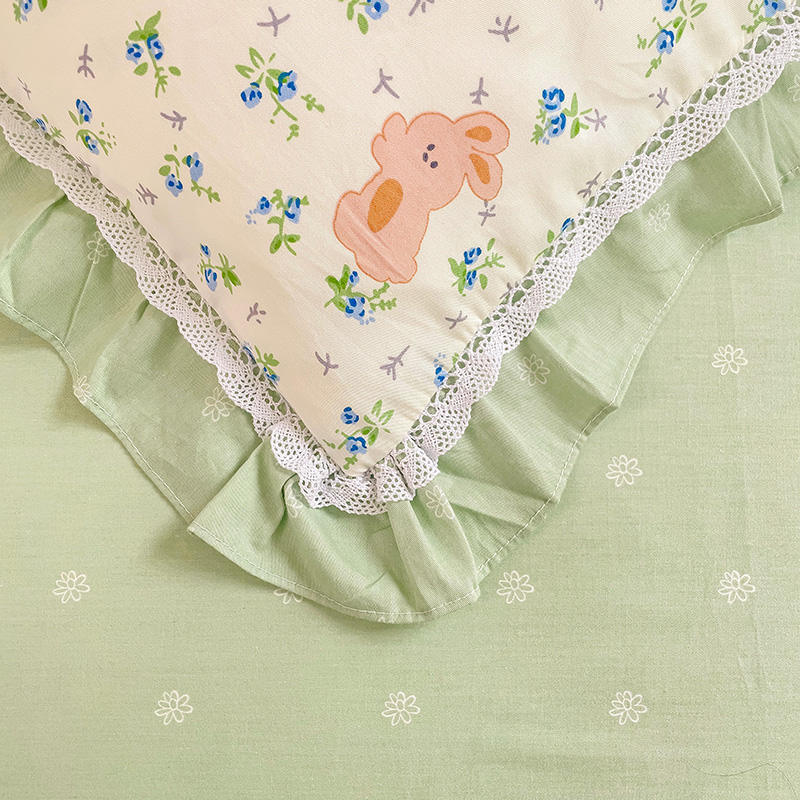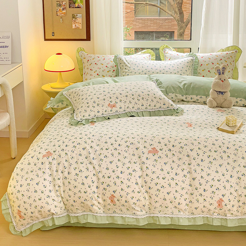 棉生活家纺 2025新款全棉小清新花边款蕾丝四件套 花海小兔