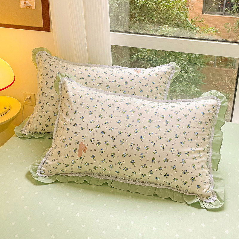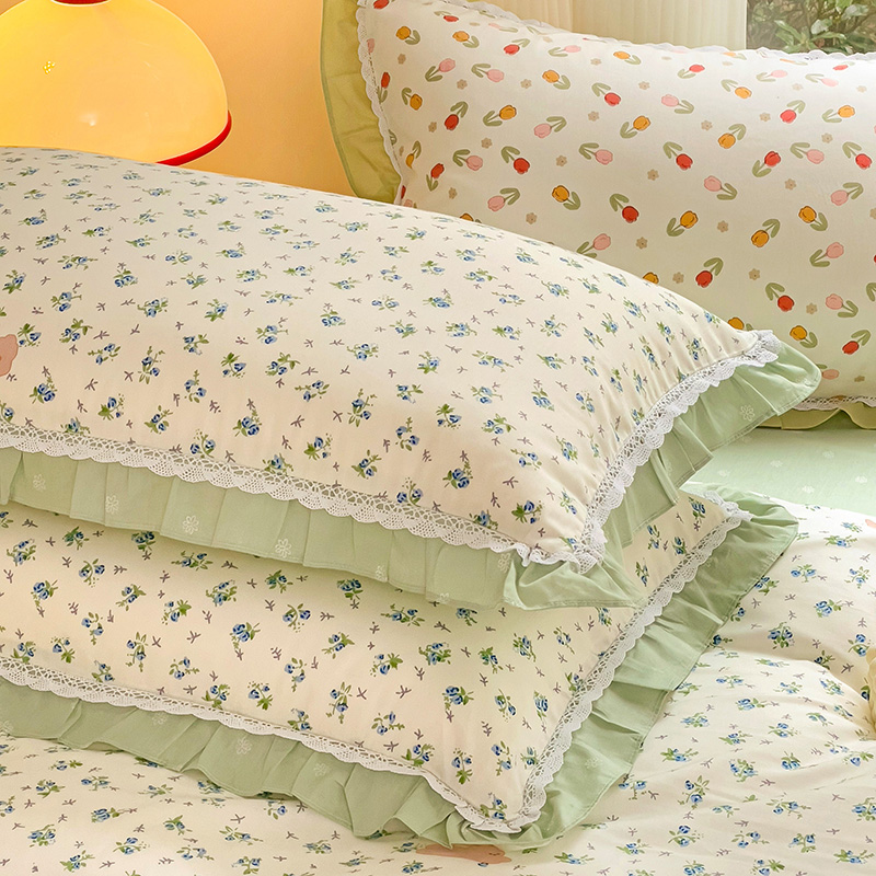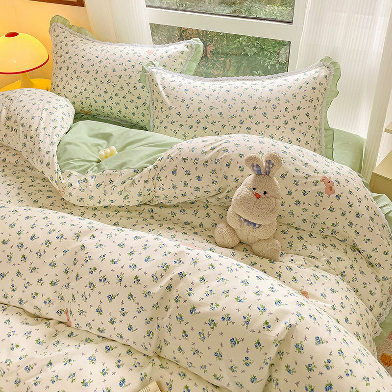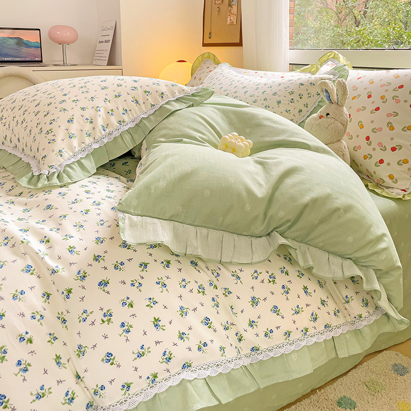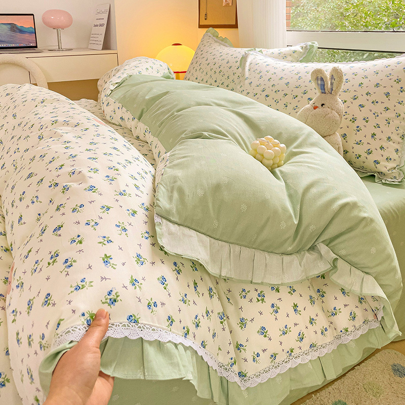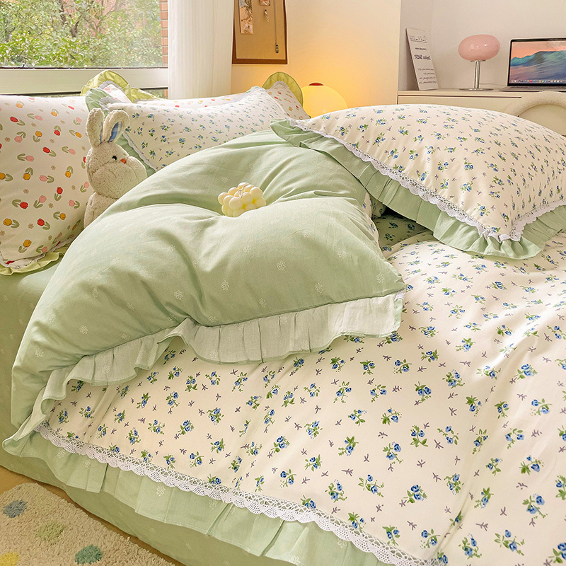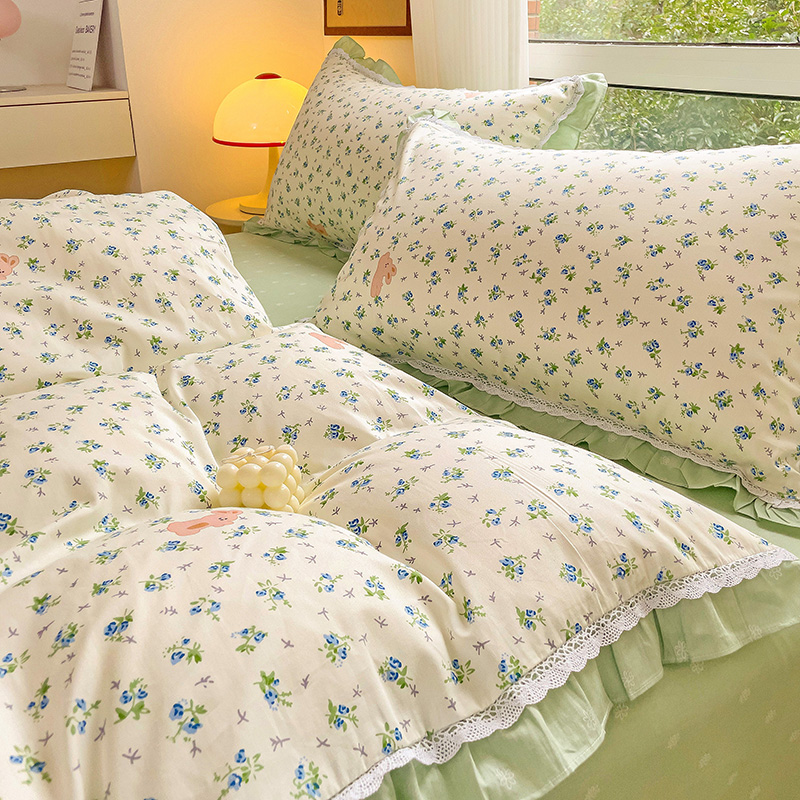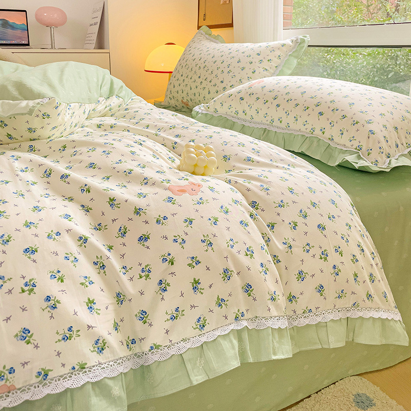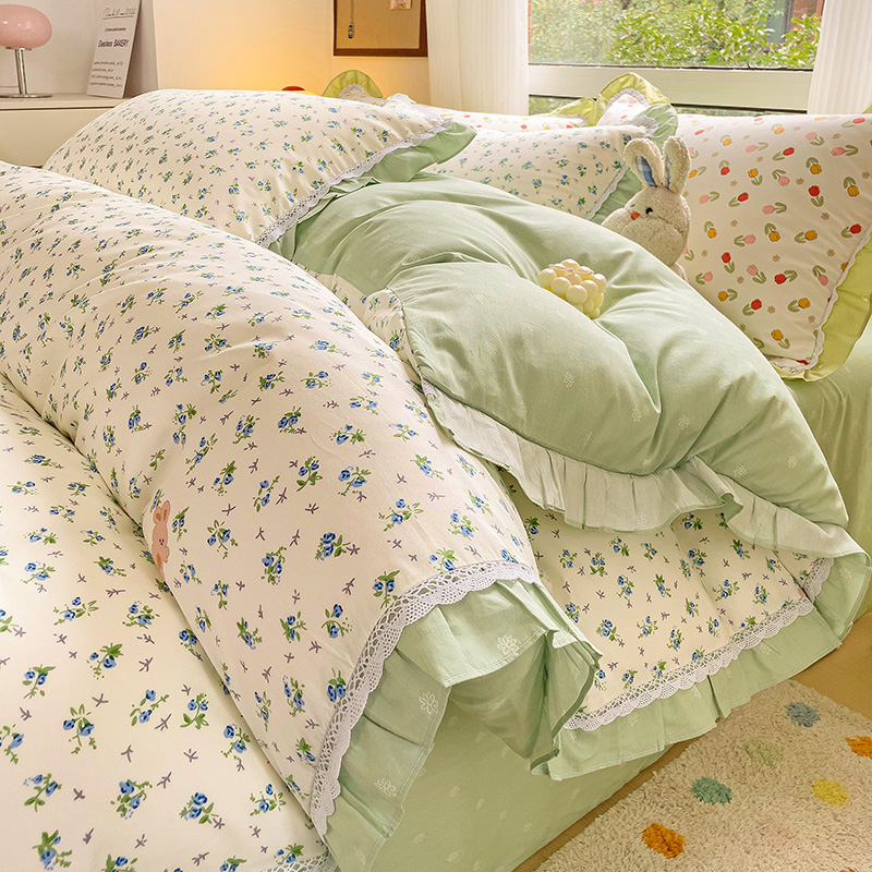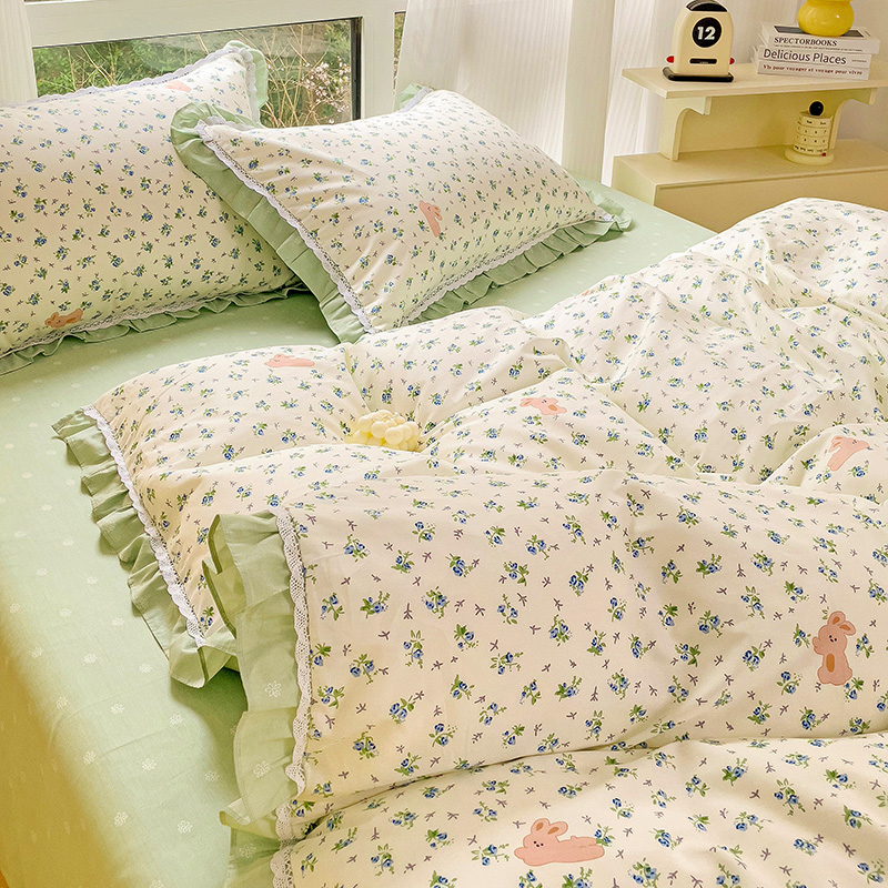 棉生活家纺 2025新款全棉小清新花边款蕾丝四件套 花海小兔
