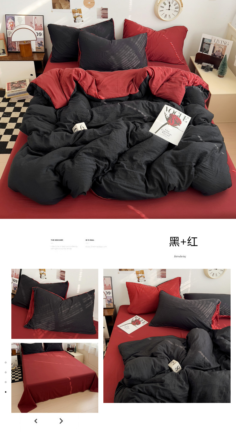 当前位置: 91家纺网 > 商品网购 > 床品套件 > 四件套 > 普通磨毛四件套 > 花伞家居 2025新款纯色拼色柔软亲肤水洗棉简约四件套 黑+红