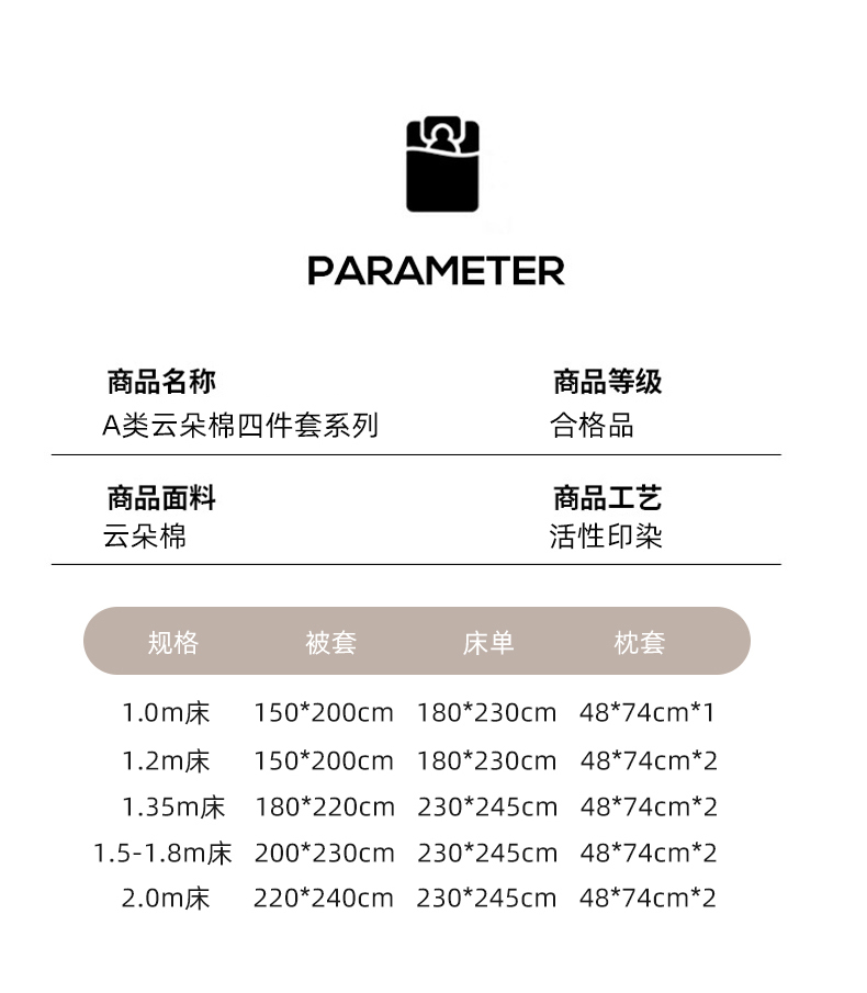 1.8床笠款四件套 被套200X230cm 床笠180X200cm 枕套48X74X2只 | ¥55.00 |