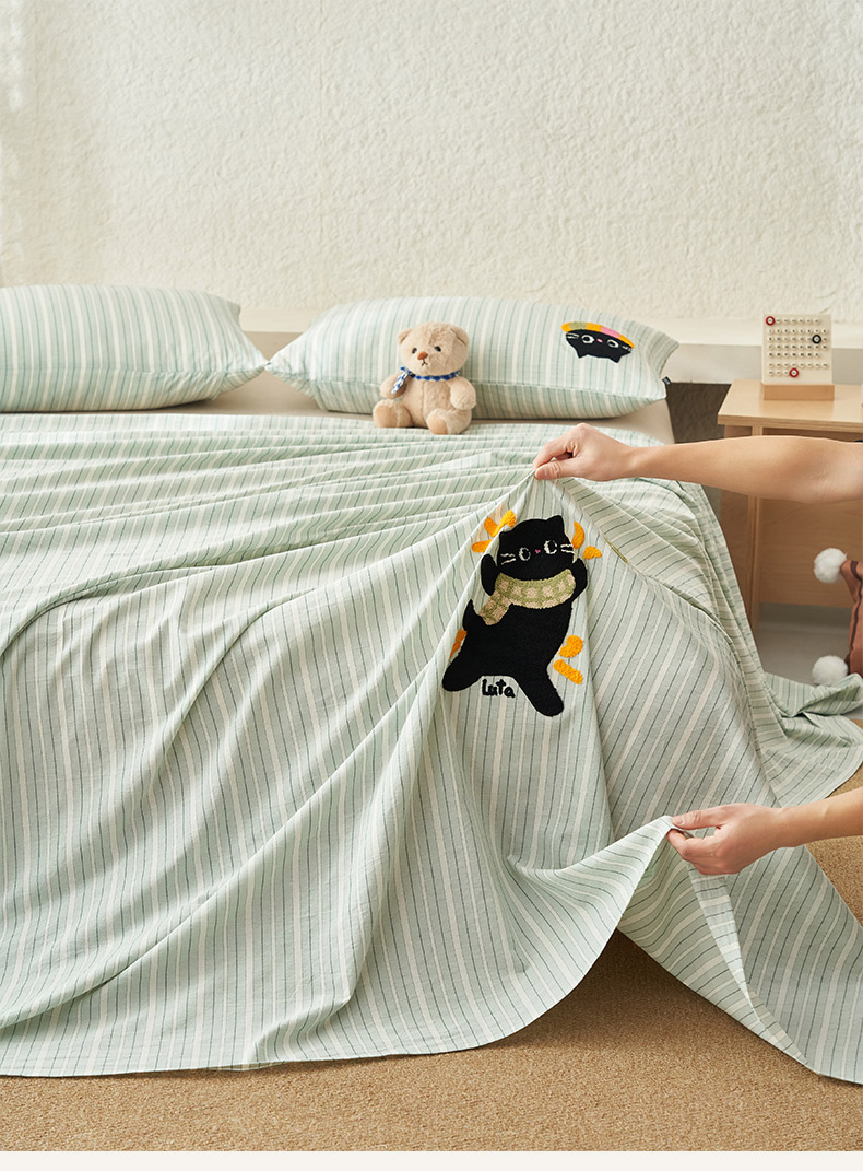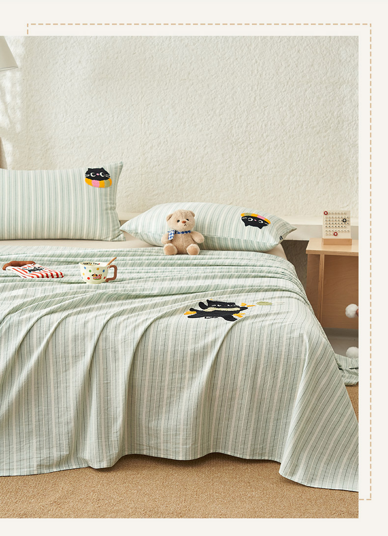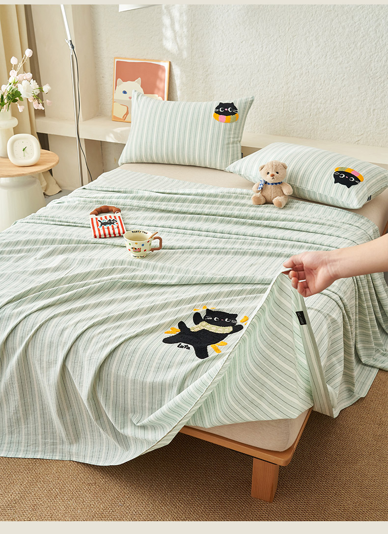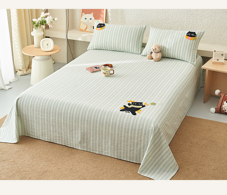 寐绸家纺 2025新款纯棉色织水洗棉竖条单床单 水洗棉竖条床单-粗条浅蓝