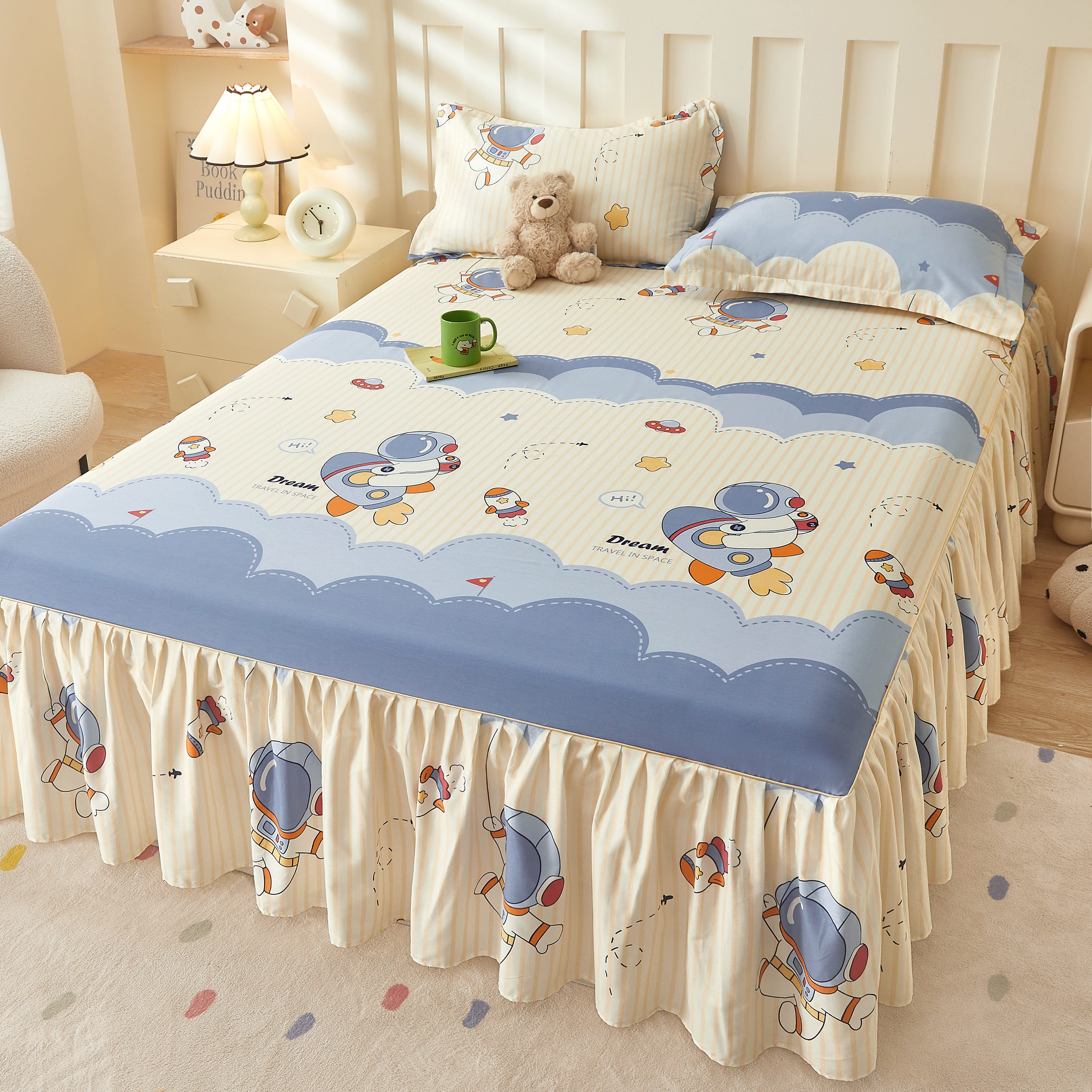 (总)名优家纺 2025新款A类13070全棉纯棉韩版印花床裙,北野,布里克,乘风宇宙,橙心如意,红星小熊,季夏,空谷幽兰,恐龙小霸王,漫春,梦柔-兰,酸甜樱桃,熙悦-黄,小欣喜
