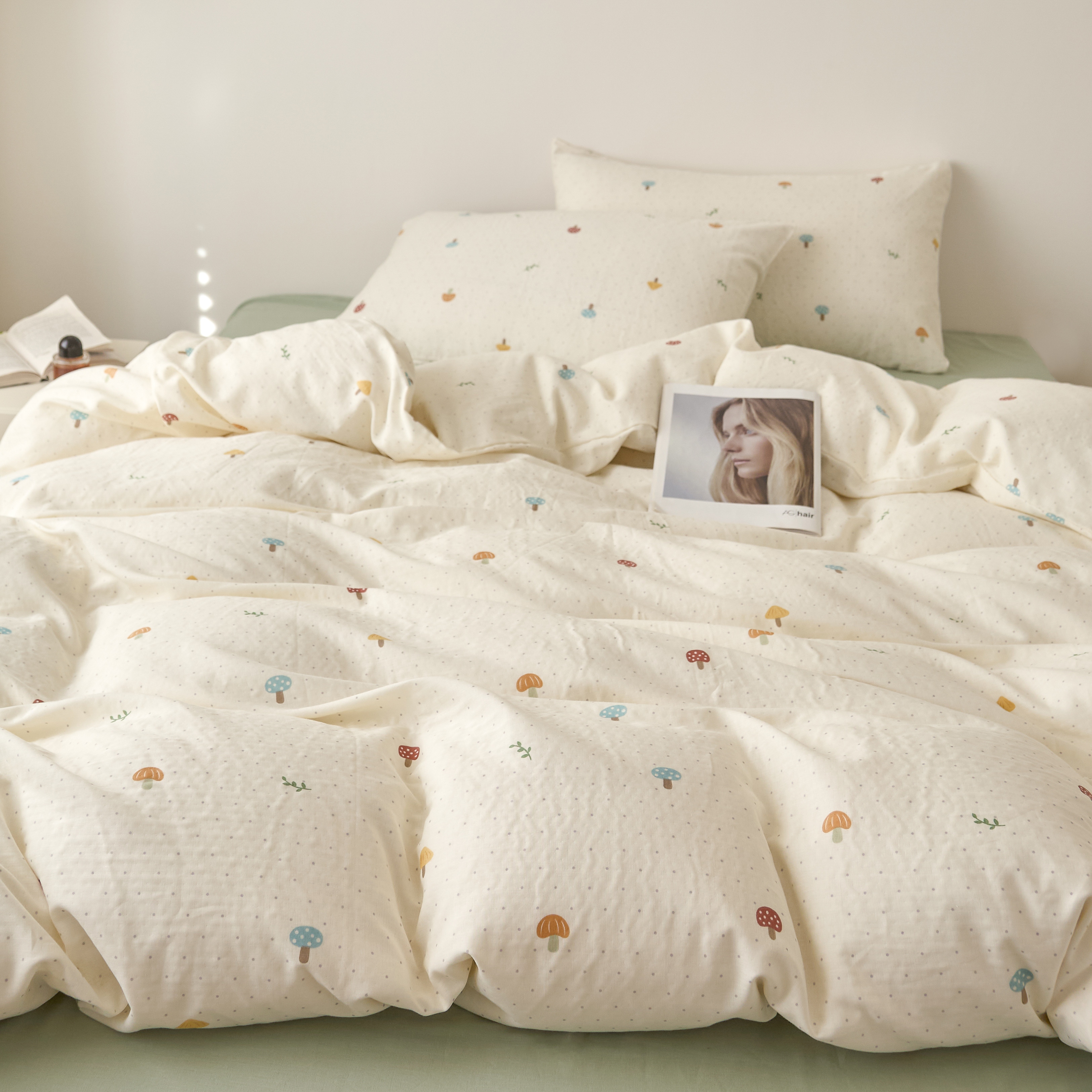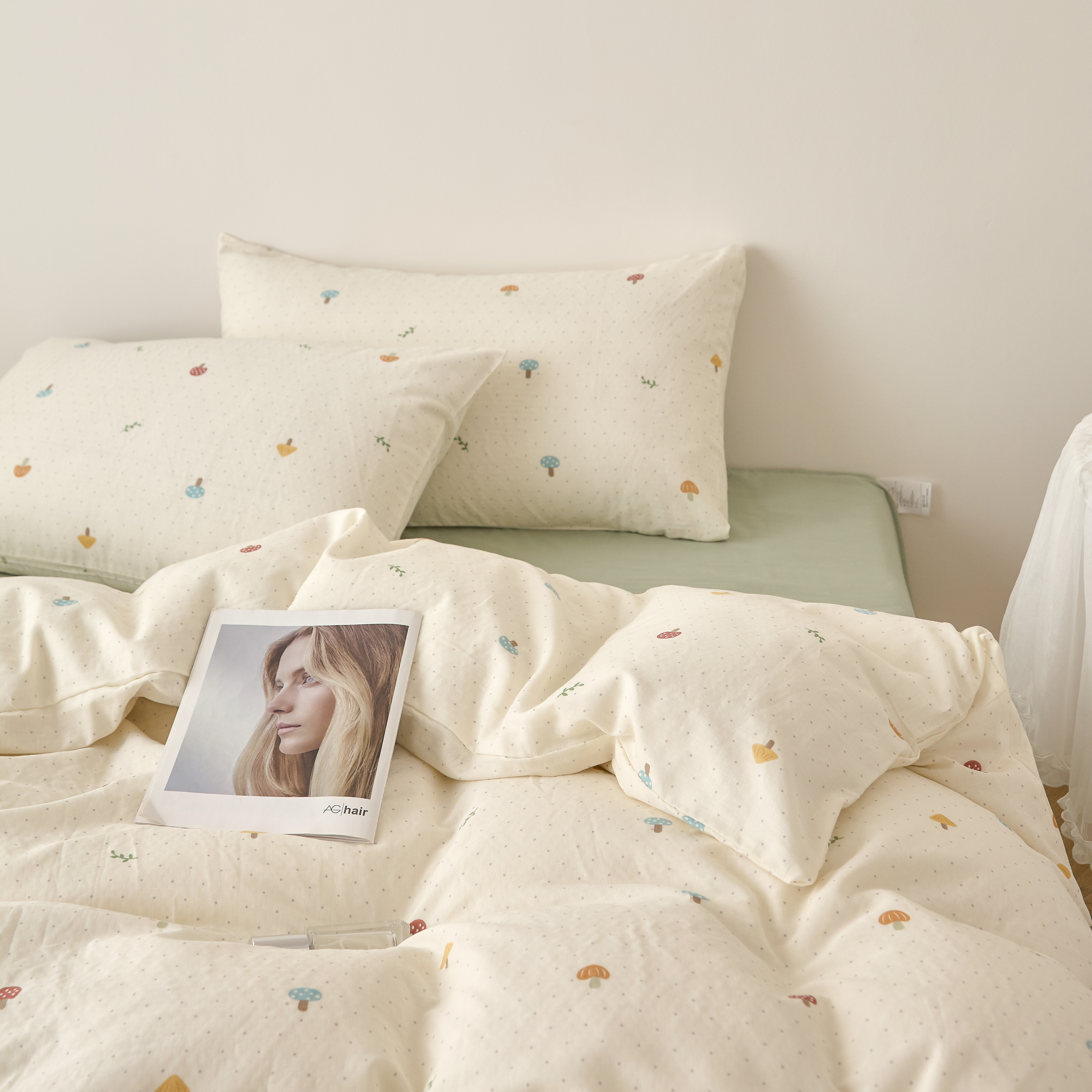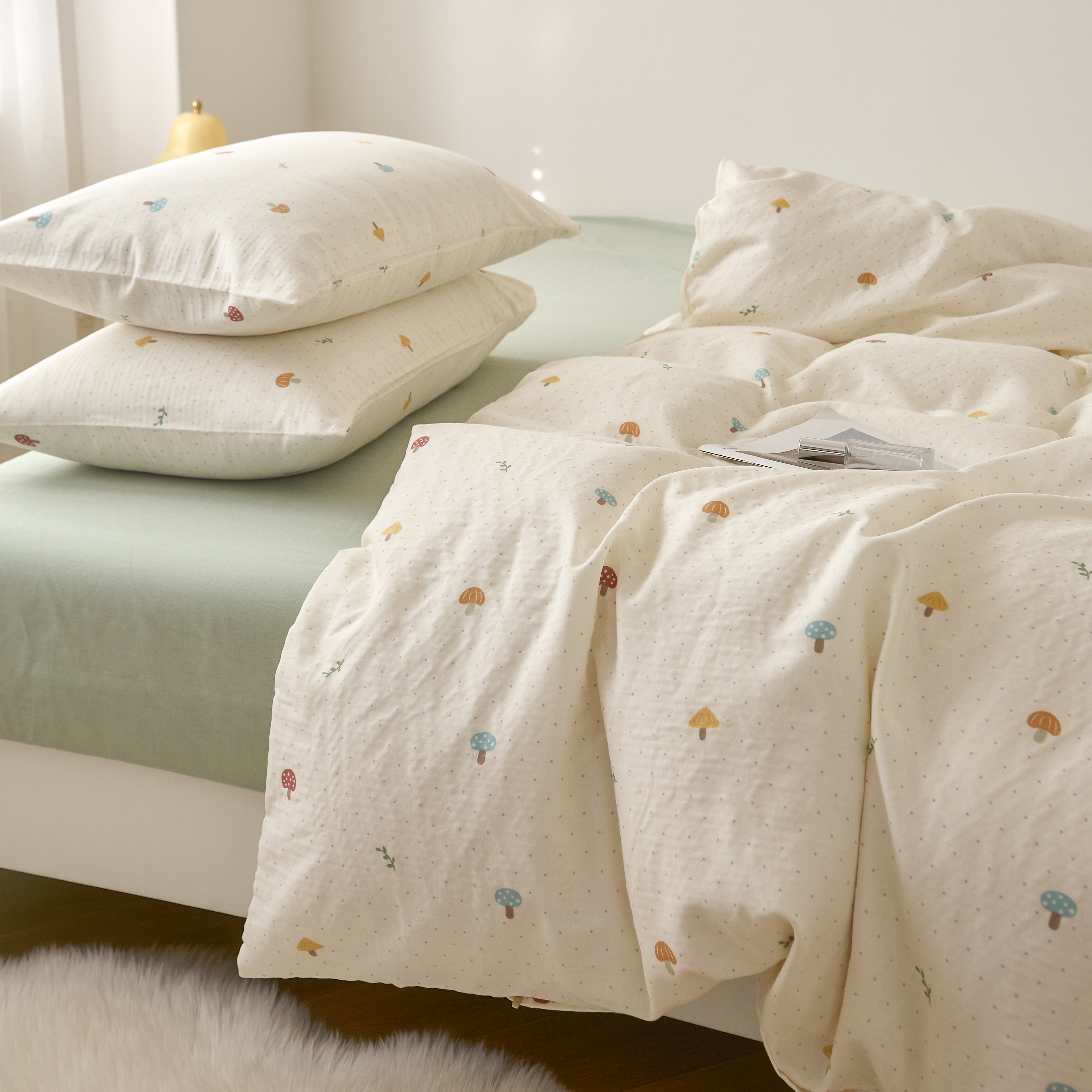 商品名称:嘉汀兰家居 2025新款圆角花边款全棉纯棉A类母婴级有氧全棉双层纱亲肤全棉小清新印花四件套 蘑菇乐园