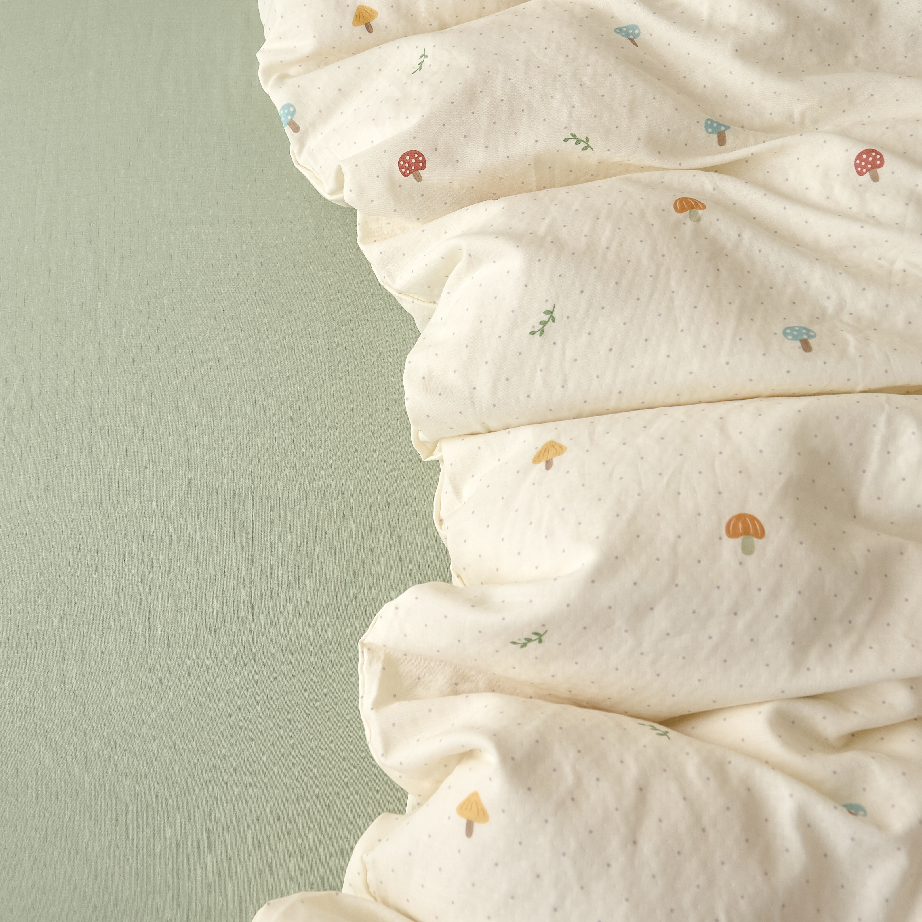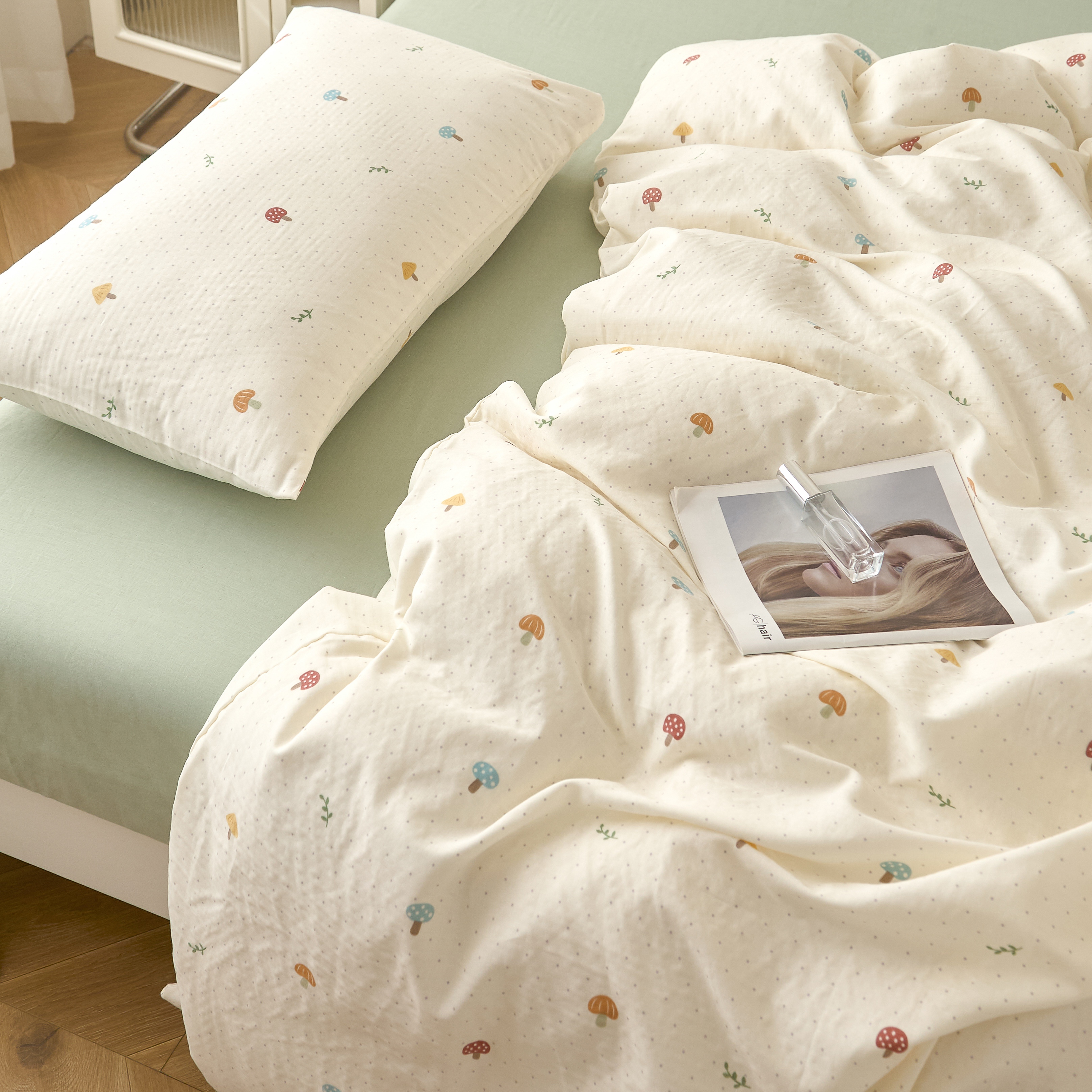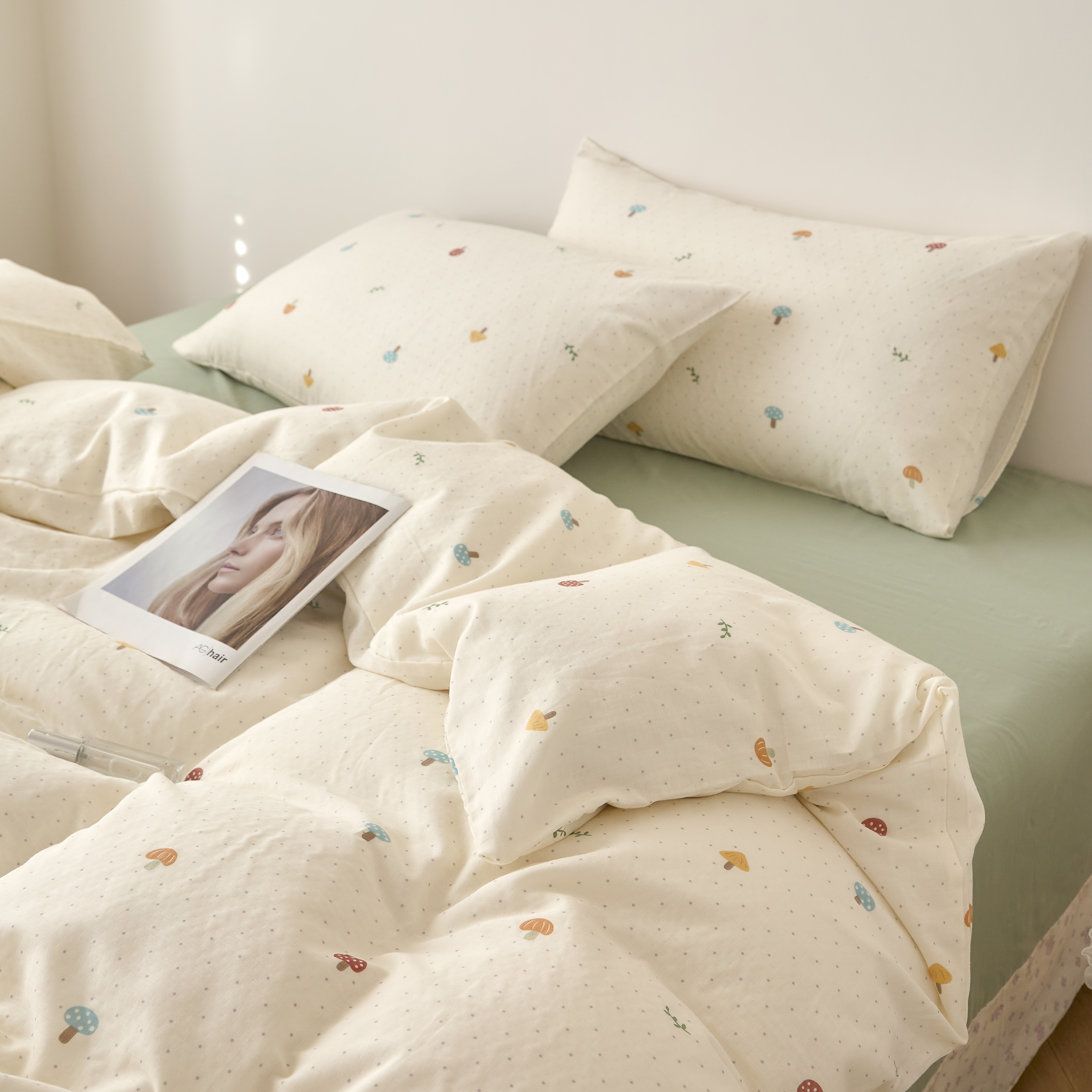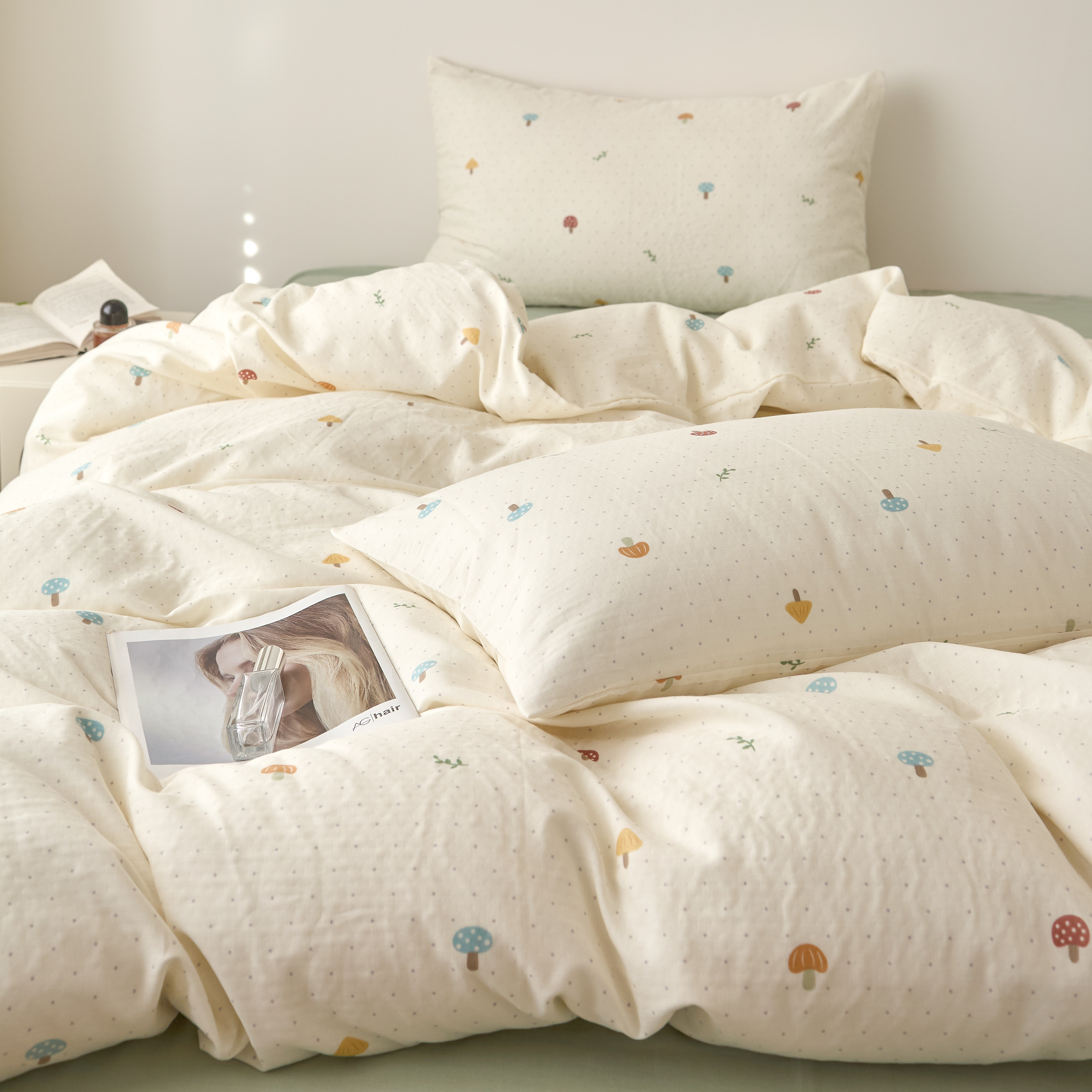 商品名称:嘉汀兰家居 2025新款圆角花边款全棉纯棉A类母婴级有氧全棉双层纱亲肤全棉小清新印花四件套 蘑菇乐园
