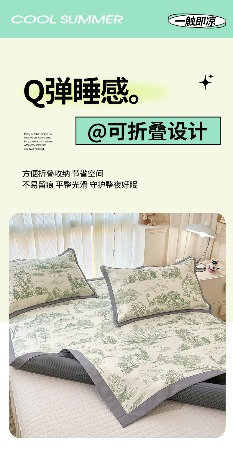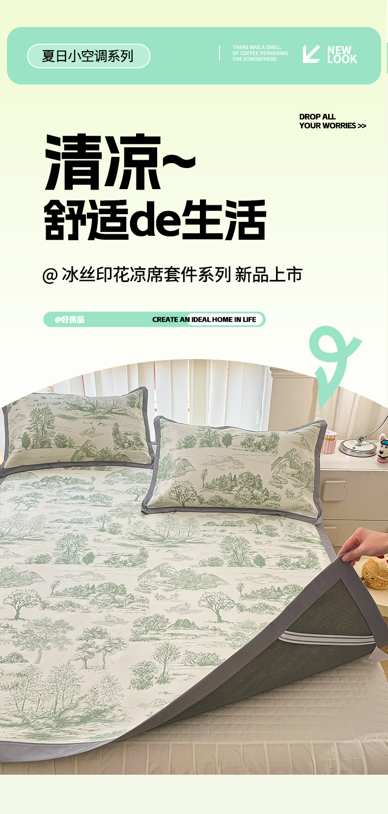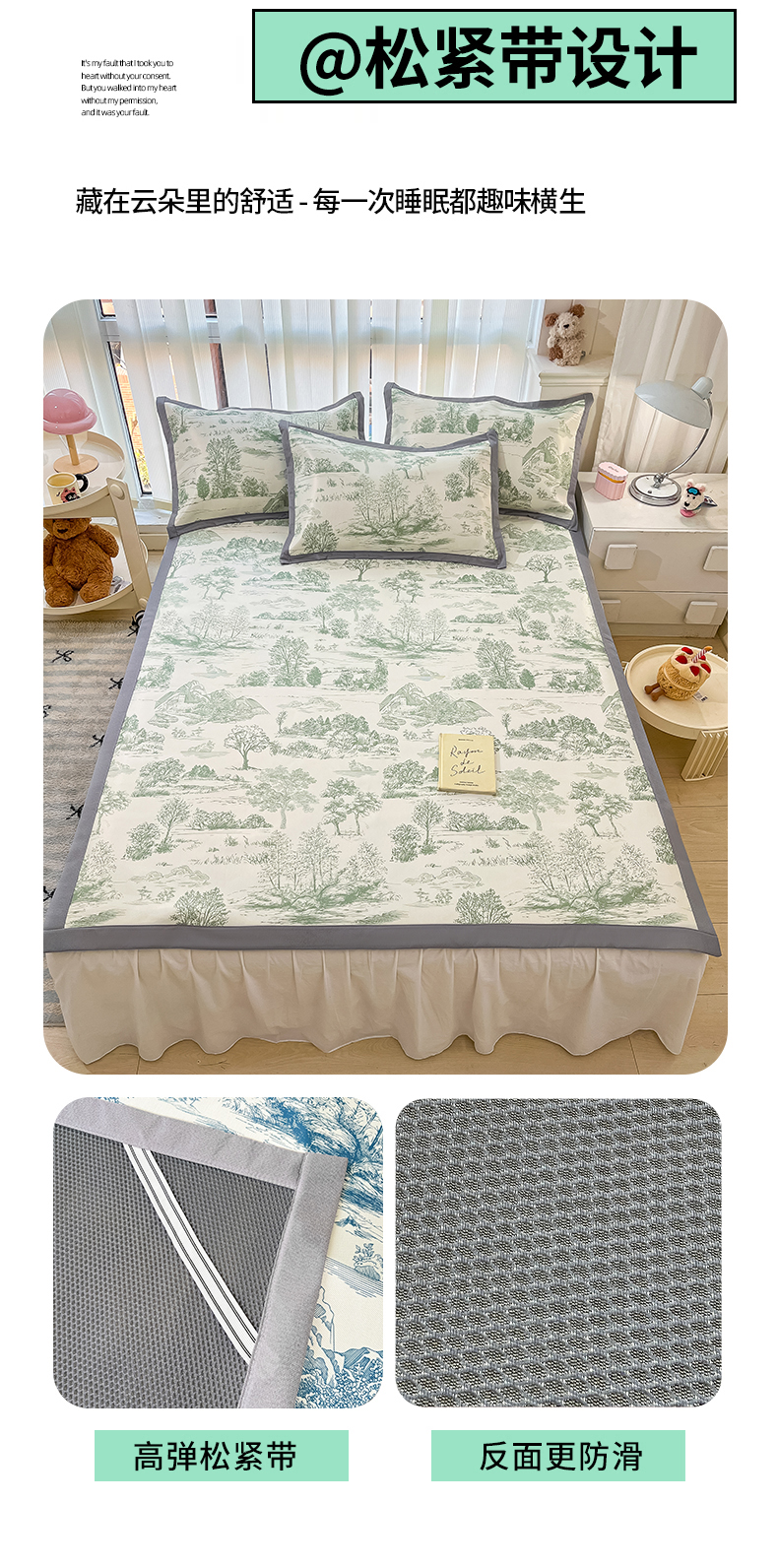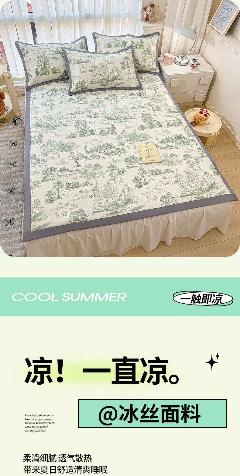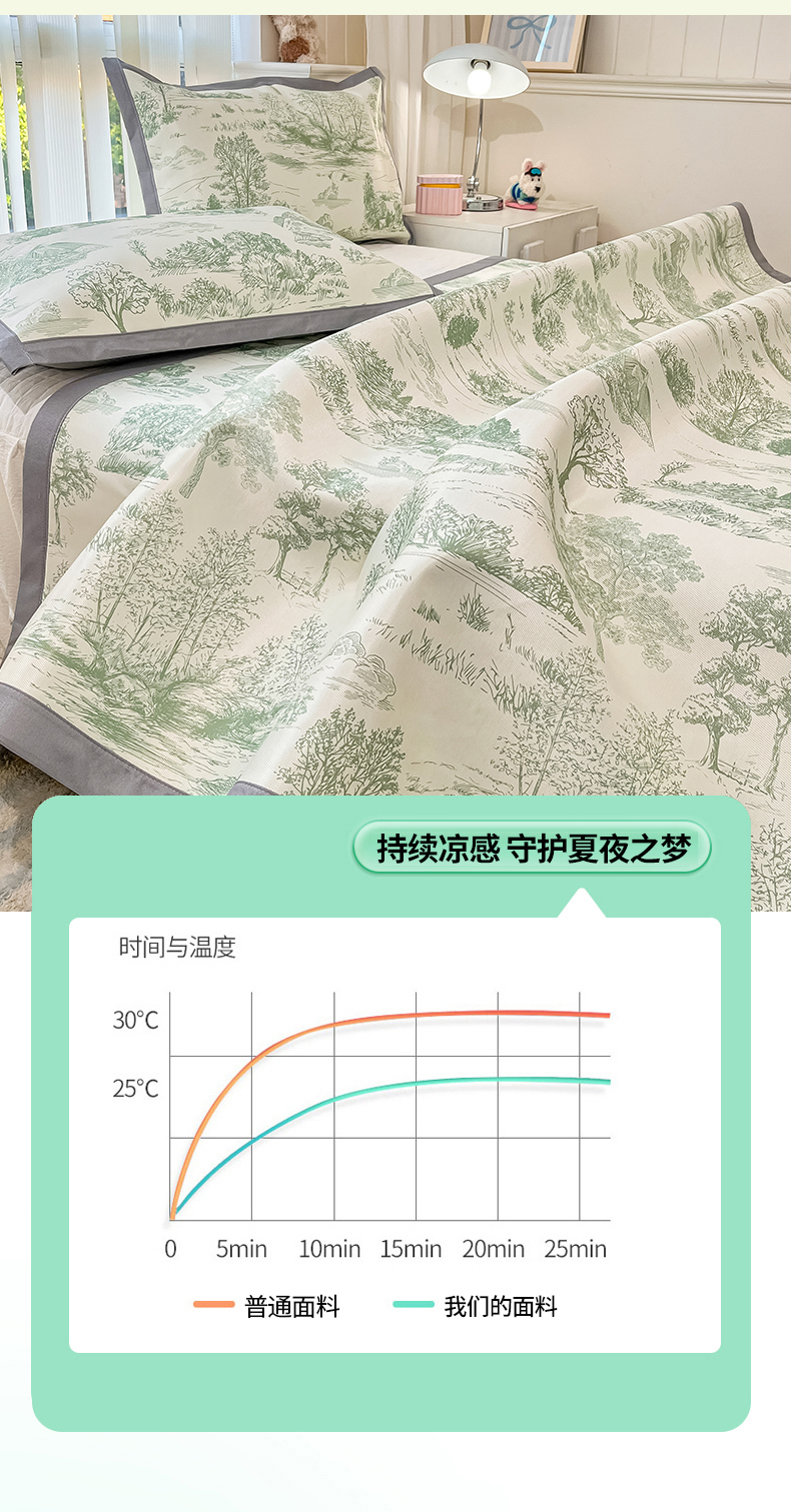 川悦生活 2025新款600D立体宽边冰丝印花凉席 复古欧庭-绿