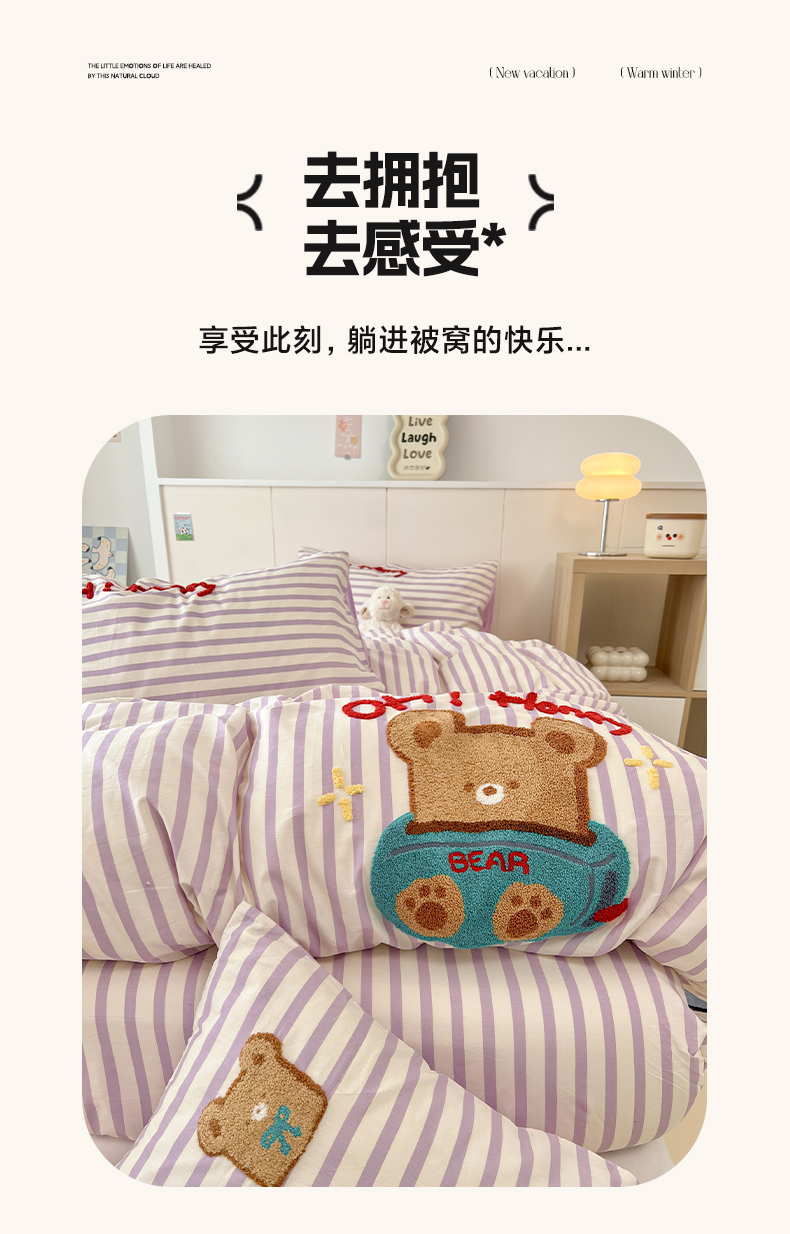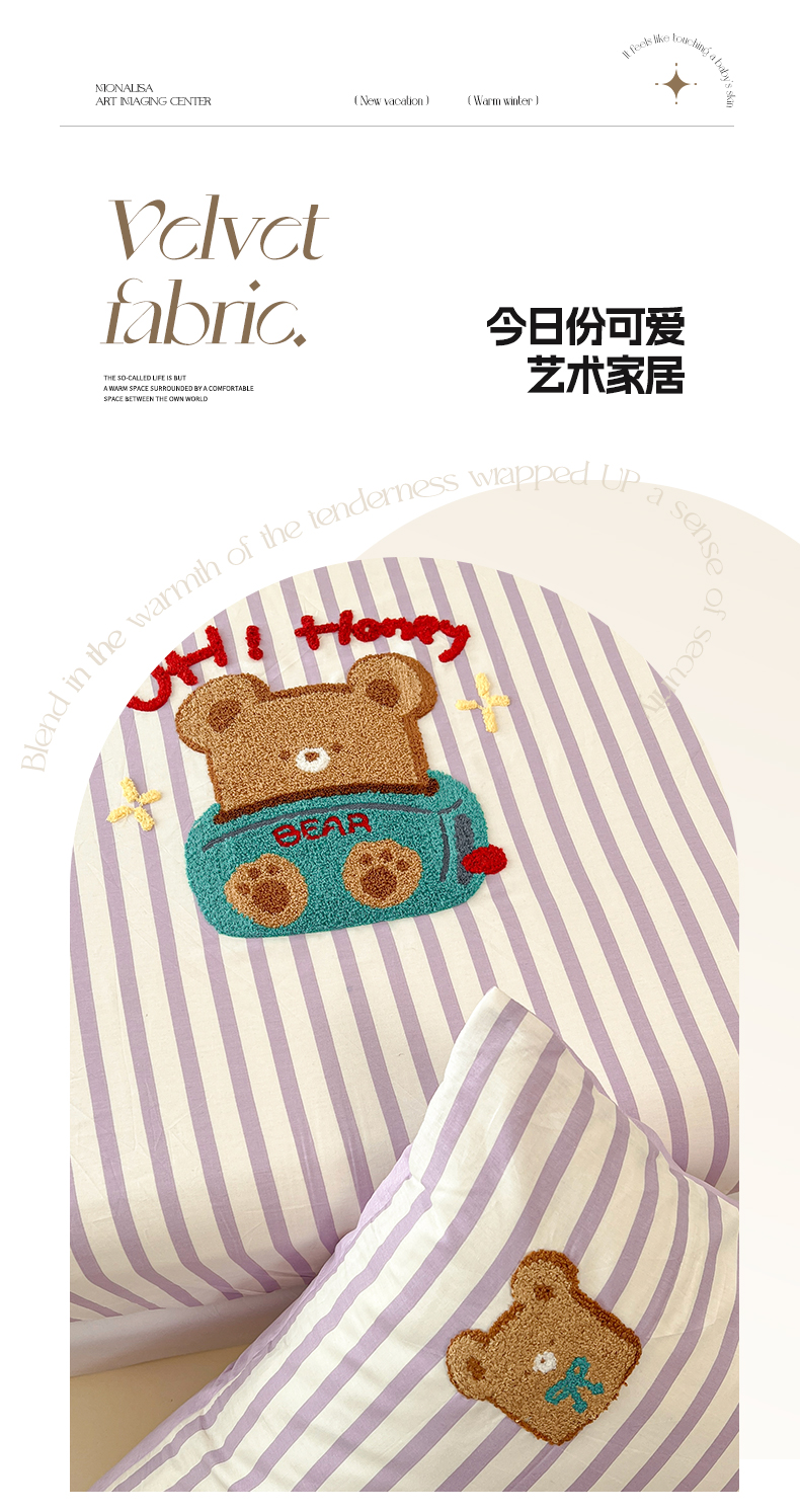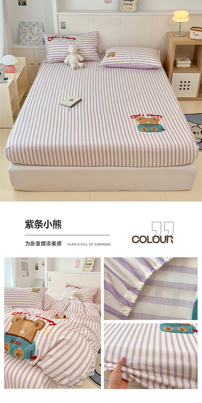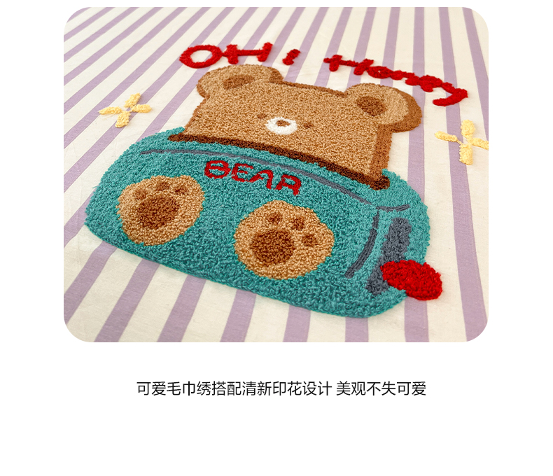 商品名称:雅居纺家纺 2025春夏新款全棉纯棉毛巾绣系列单床笠 床笠单件 紫条小熊