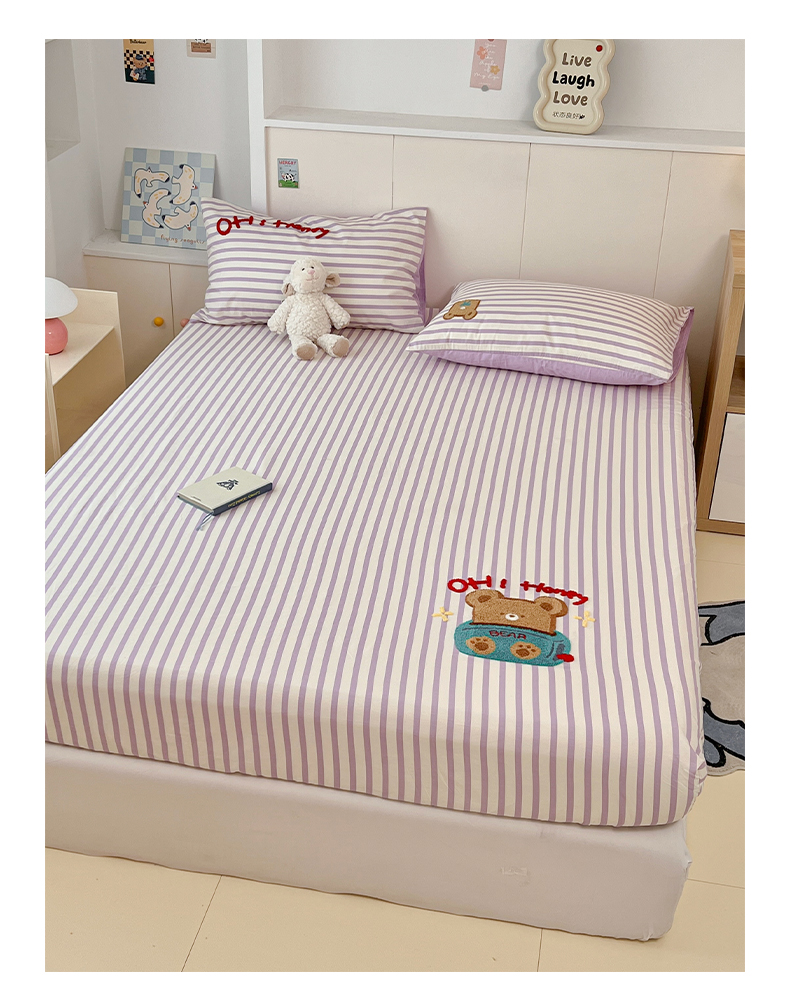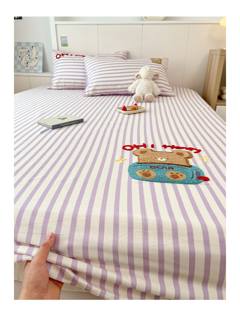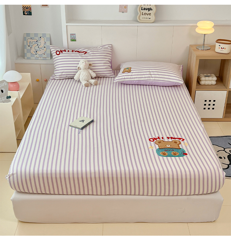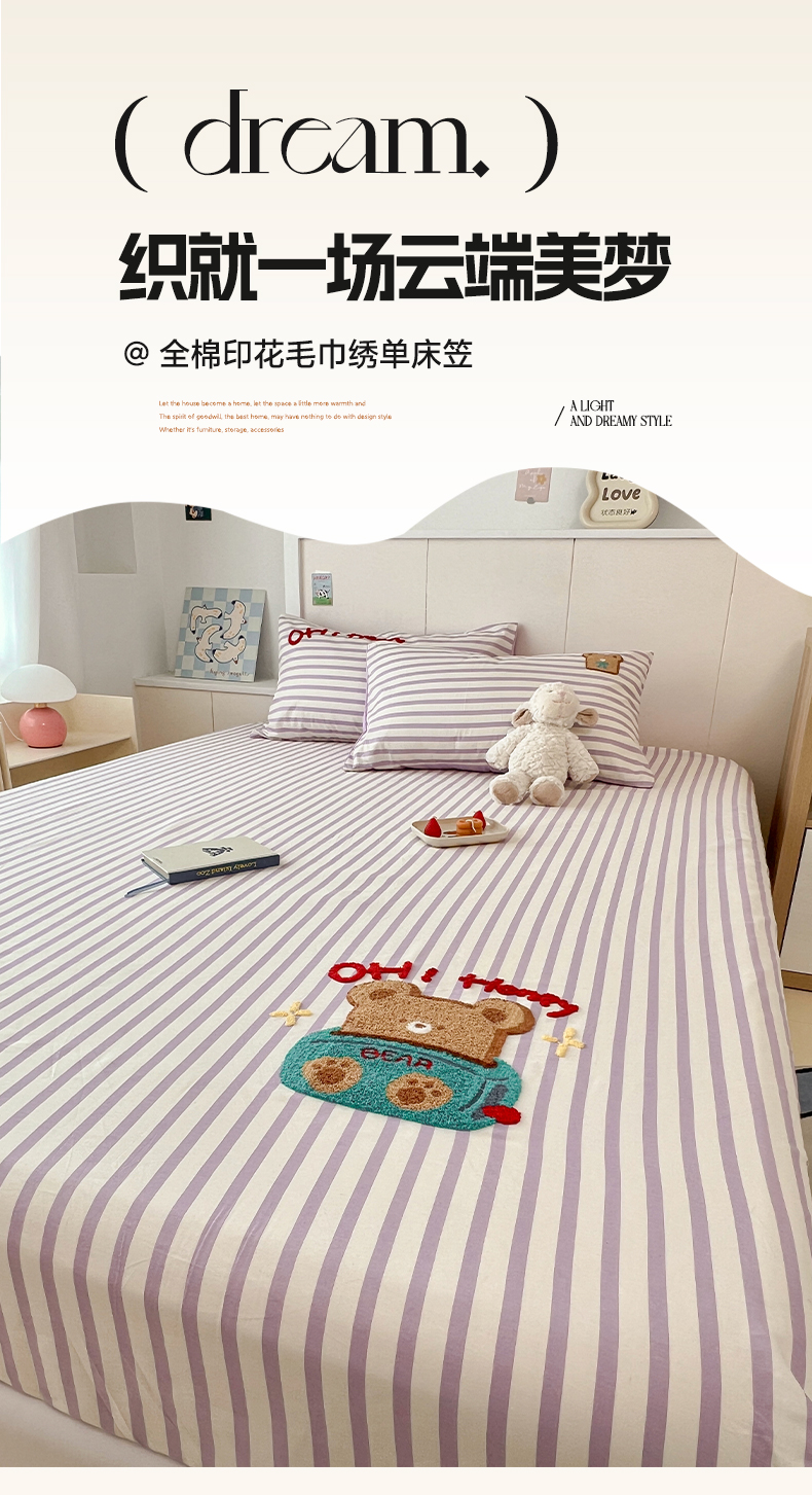 雅居纺家纺 2025春夏新款全棉纯棉毛巾绣系列单床笠 床笠单件 紫条小熊