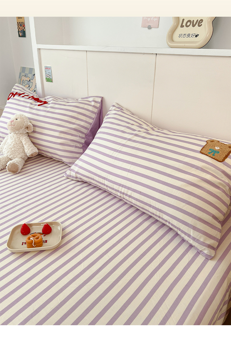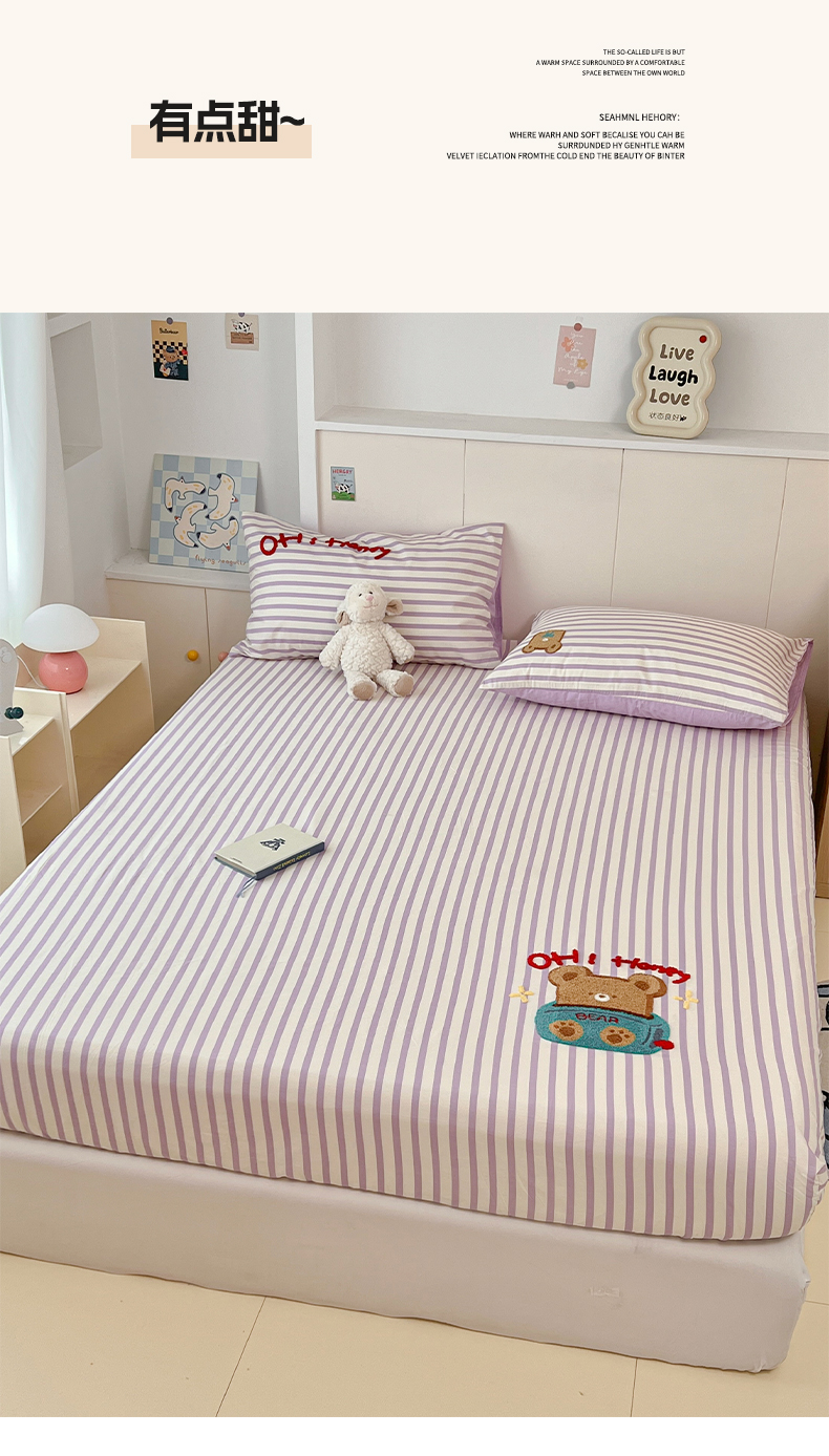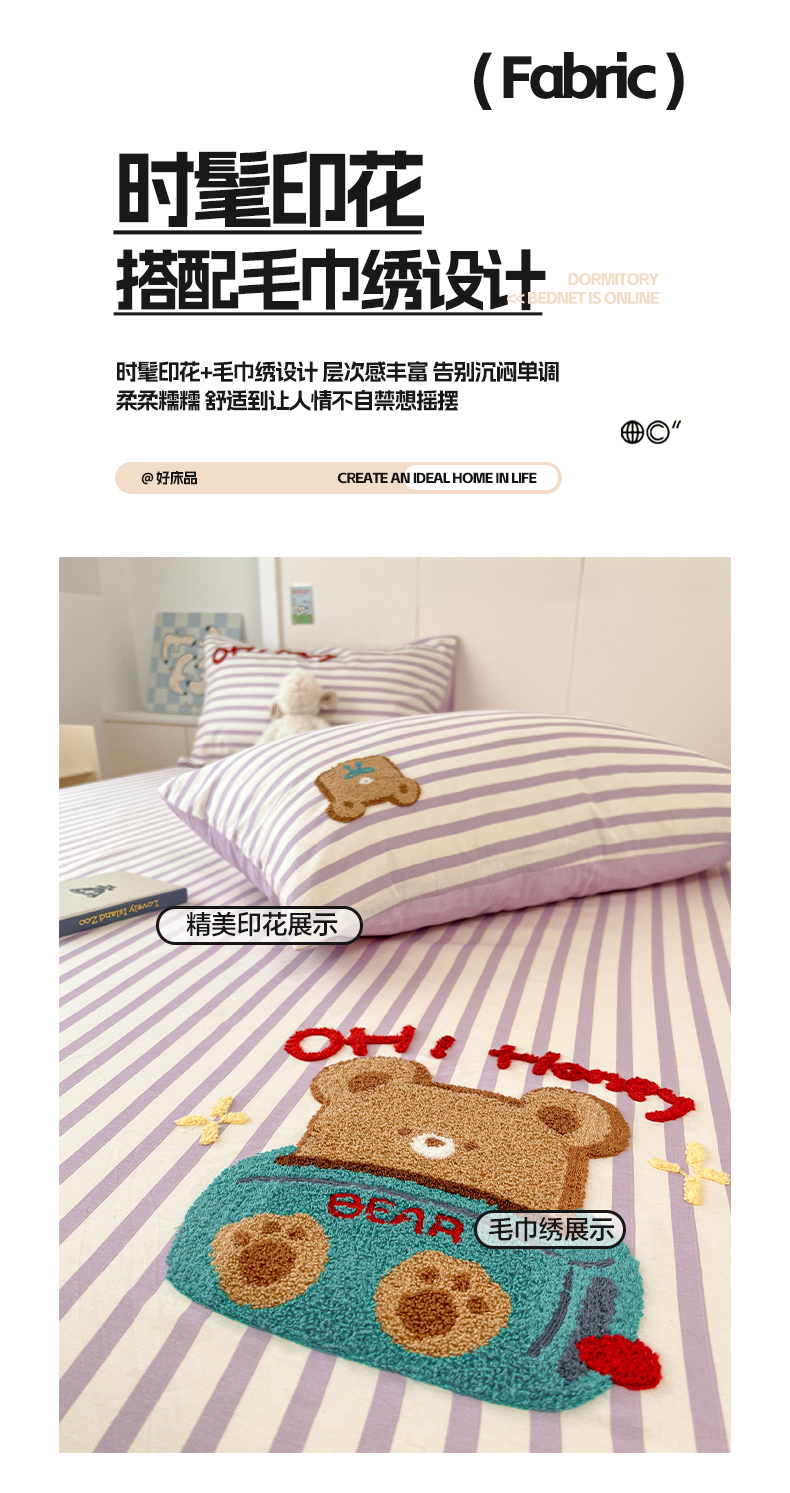 雅居纺家纺 2025春夏新款全棉纯棉毛巾绣系列单床笠 床笠单件 紫条小熊