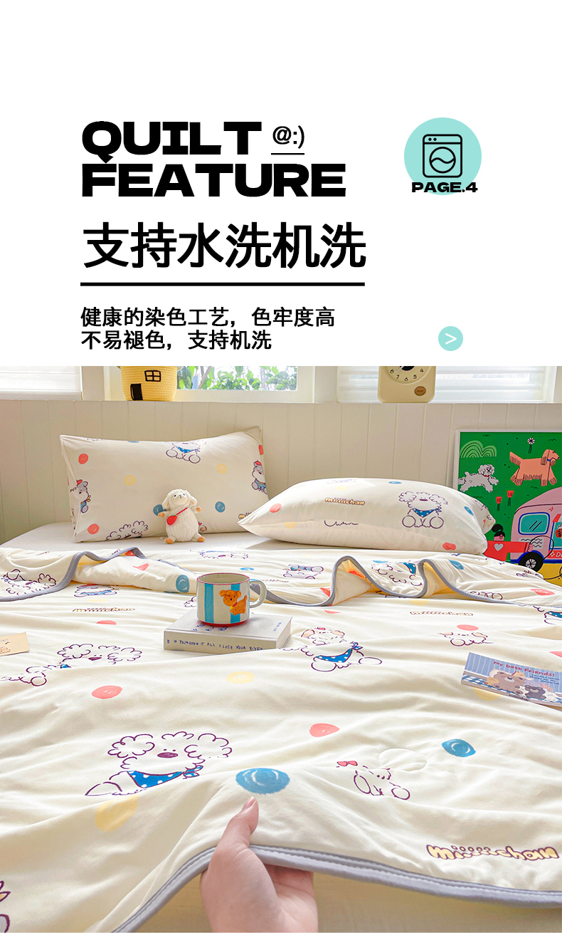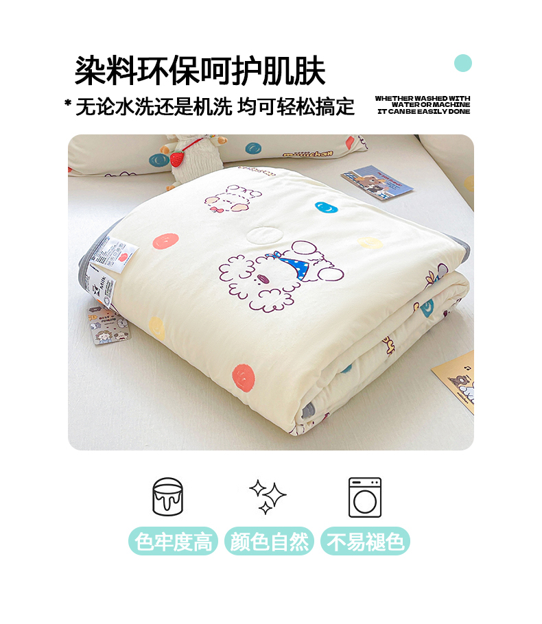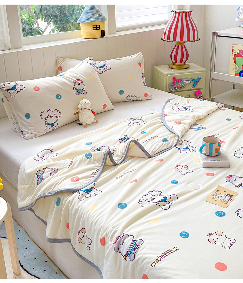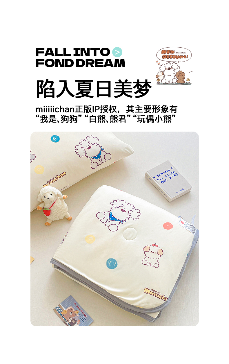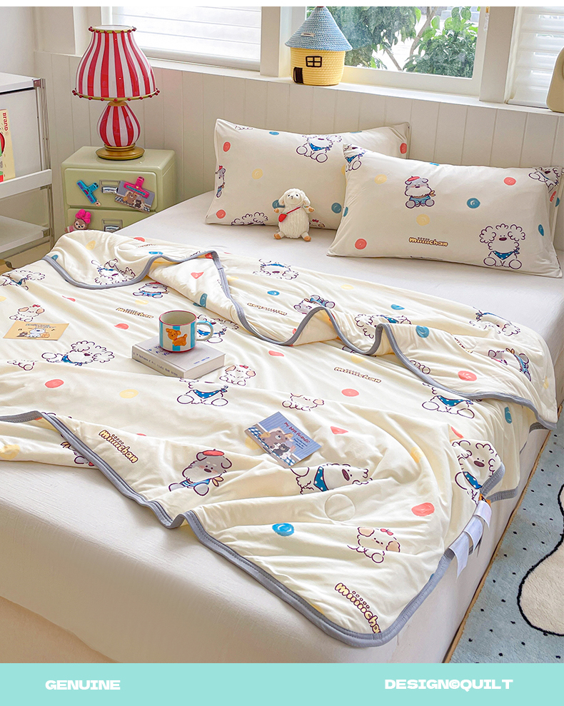 商品名称:桃子家居 2025新款A类高品质正版授权miiiiichan可爱卡通狗狗白熊女孩牛奶丝针织棉夏被夏凉被空调被 针织棉miiiiichan-彩点狗狗