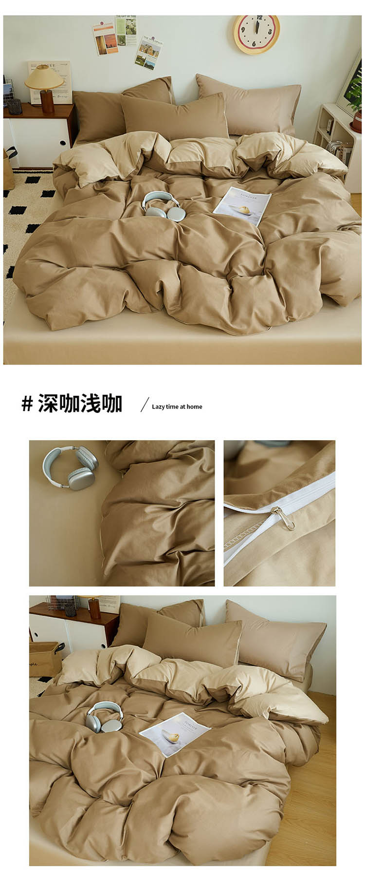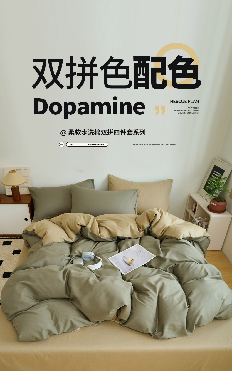 鑫琪莱家纺 2025双拼色水洗棉四件套浅灰浅咖