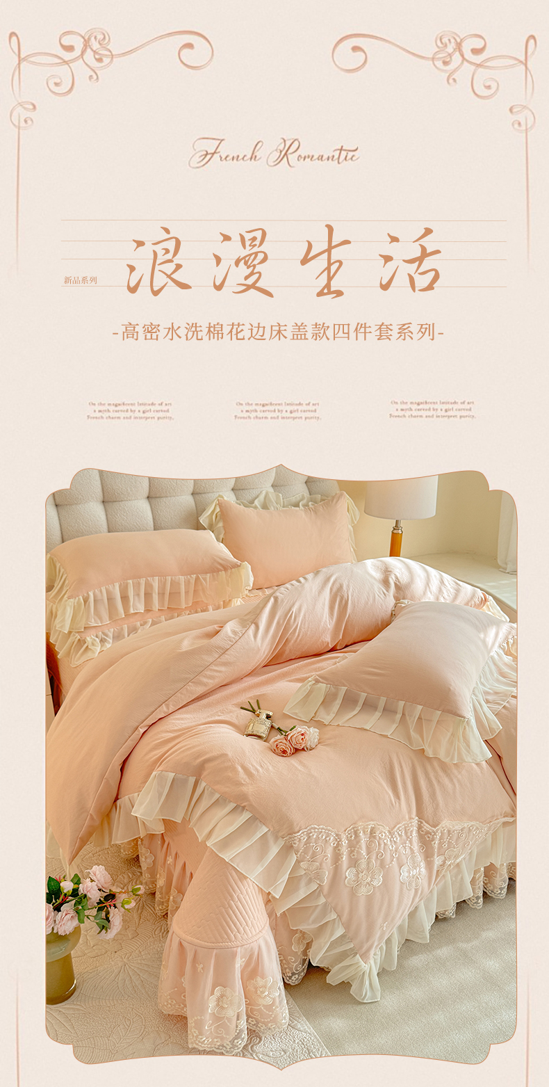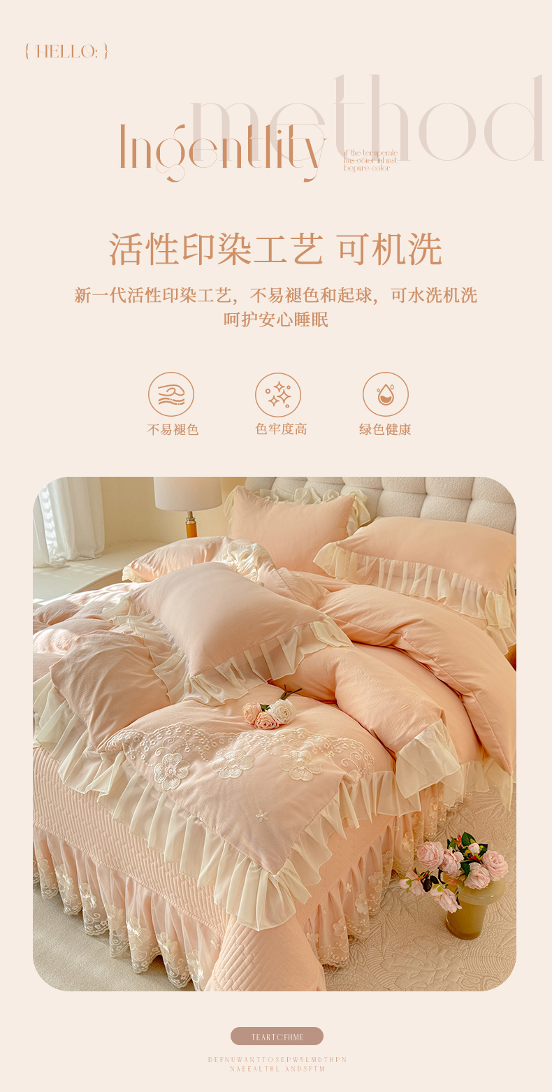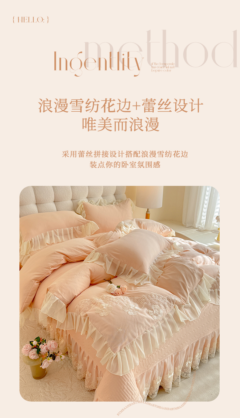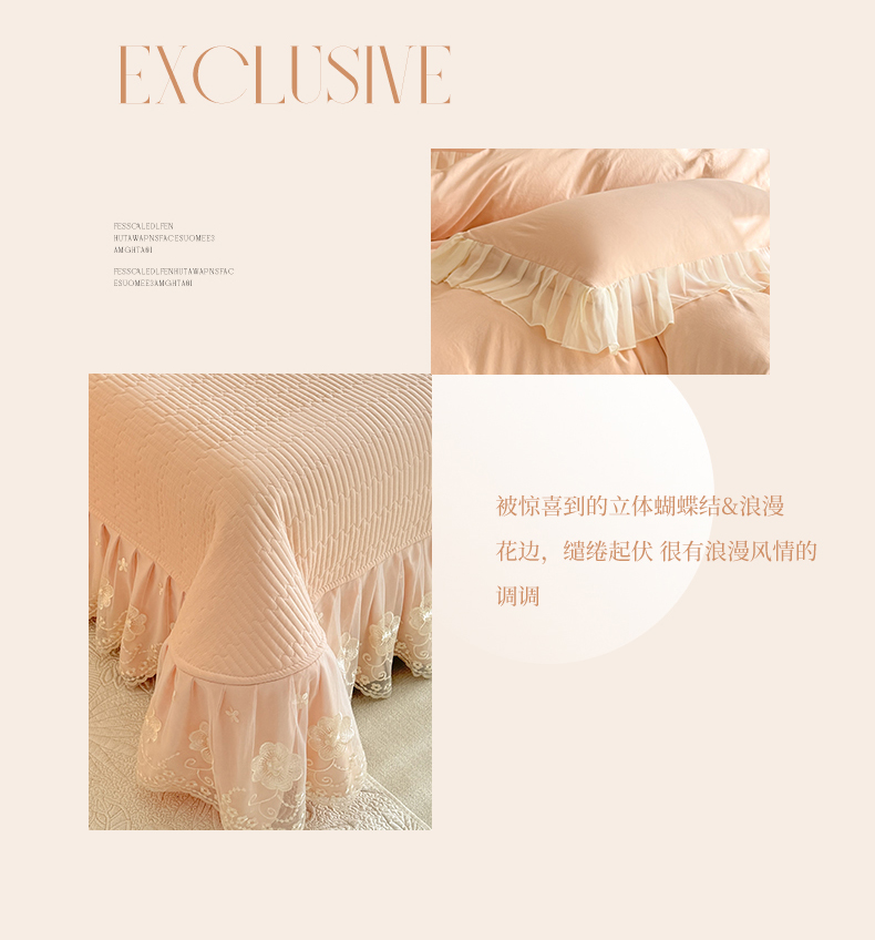 商品名称:迪梦姿家纺 2025新款简约纯色高密水洗棉花边床盖四件套-爱丽莎 爱丽莎-香玉
