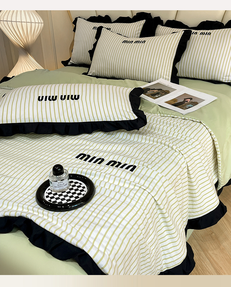 千希家纺 2025新款110克超柔水洗棉刺绣花边夏被夏凉被空调被四件套 小香风 青草绿