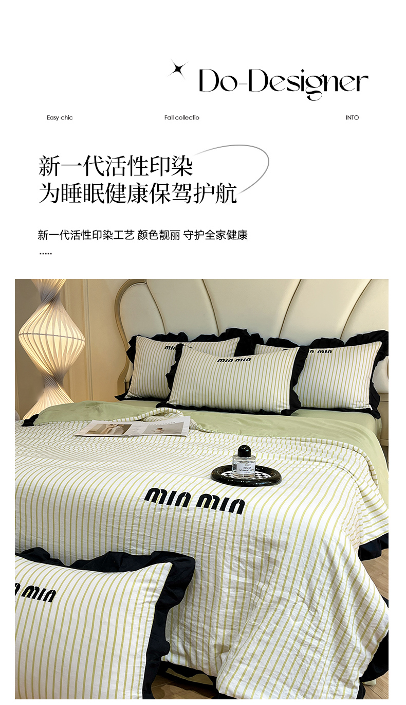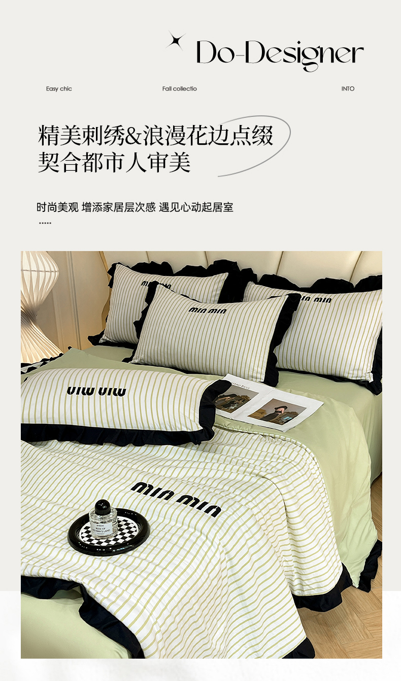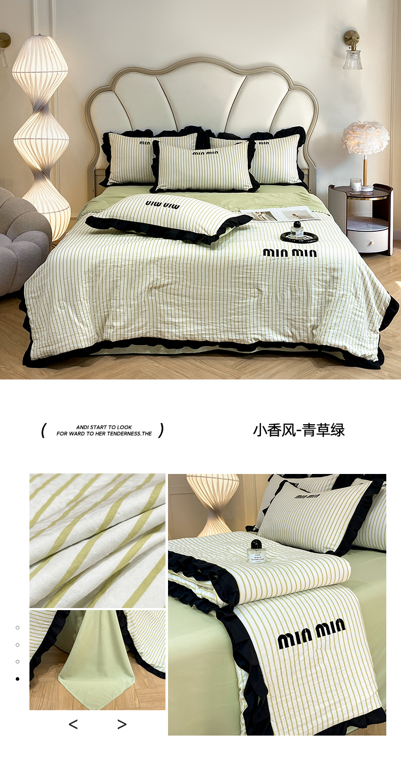 当前位置: 91家纺网 > 商品网购 > 被子 > 夏被 > 千希家纺 2025新款110克超柔水洗棉刺绣花边夏被夏凉被空调被四件套 小香风 青草绿
