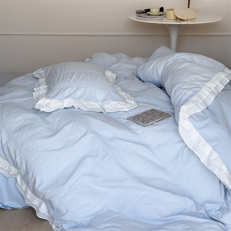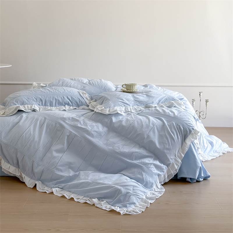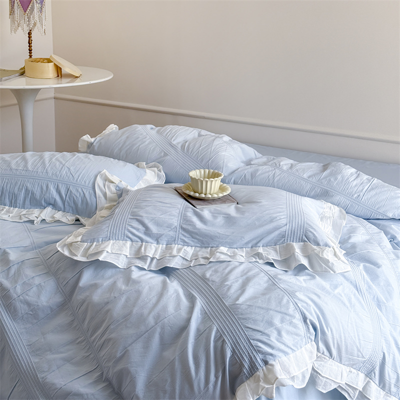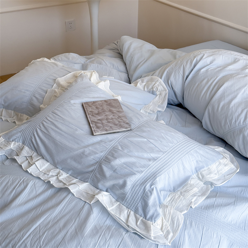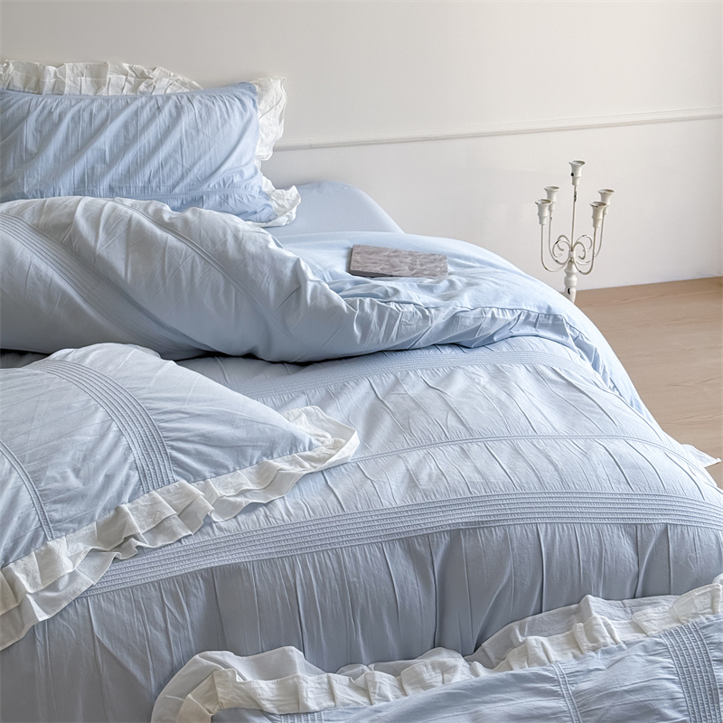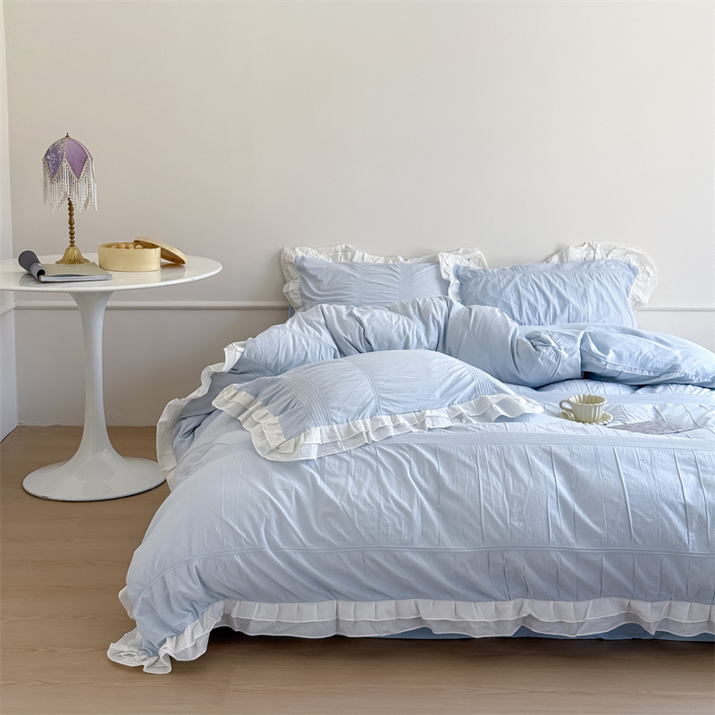 商品名称:尺素 2025纯棉双层花边韩式四件套全棉纯色ins风民宿被套纯色1.8床笠双人加大床单公主风床上用品 奶泡泡-也许雾蓝