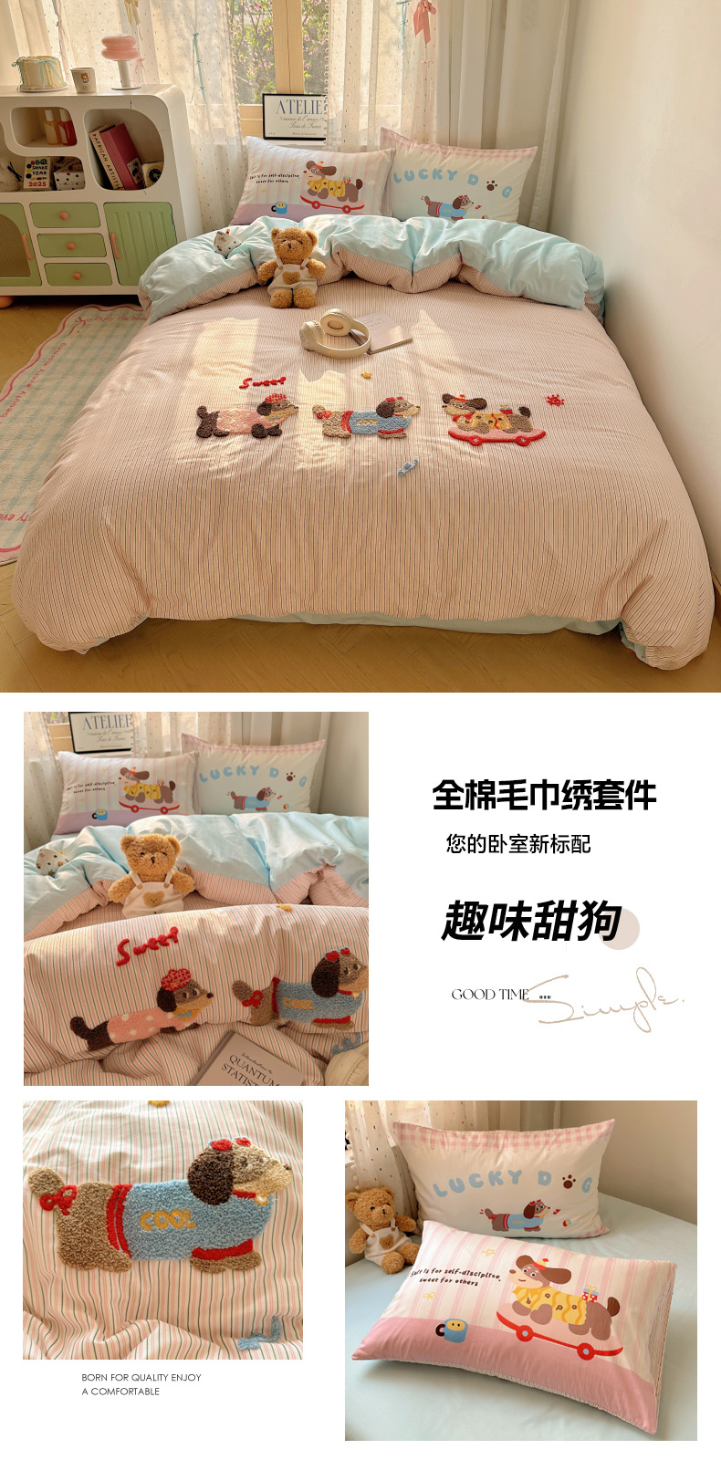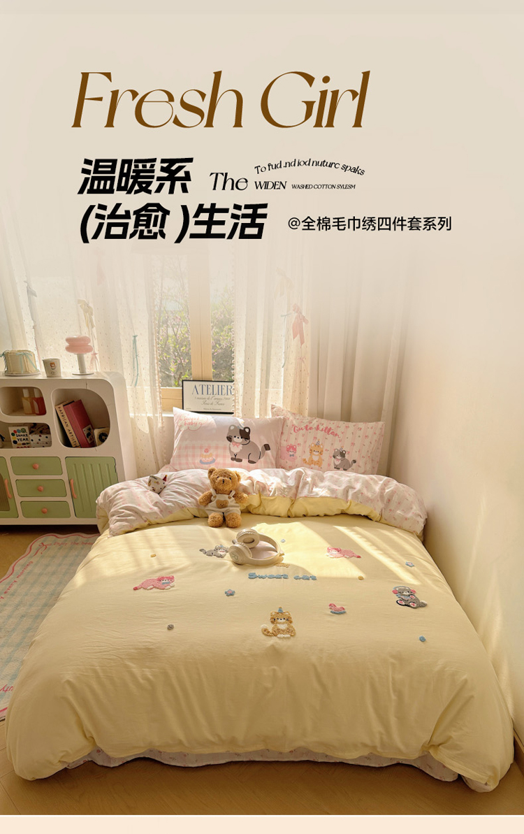 (总)丽涵家纺 2025新款全棉纯棉13372数码印花毛巾绣四件套,卡皮巴拉,萌喵时光,趣味甜狗,碎花小猫,甜品狗狗
