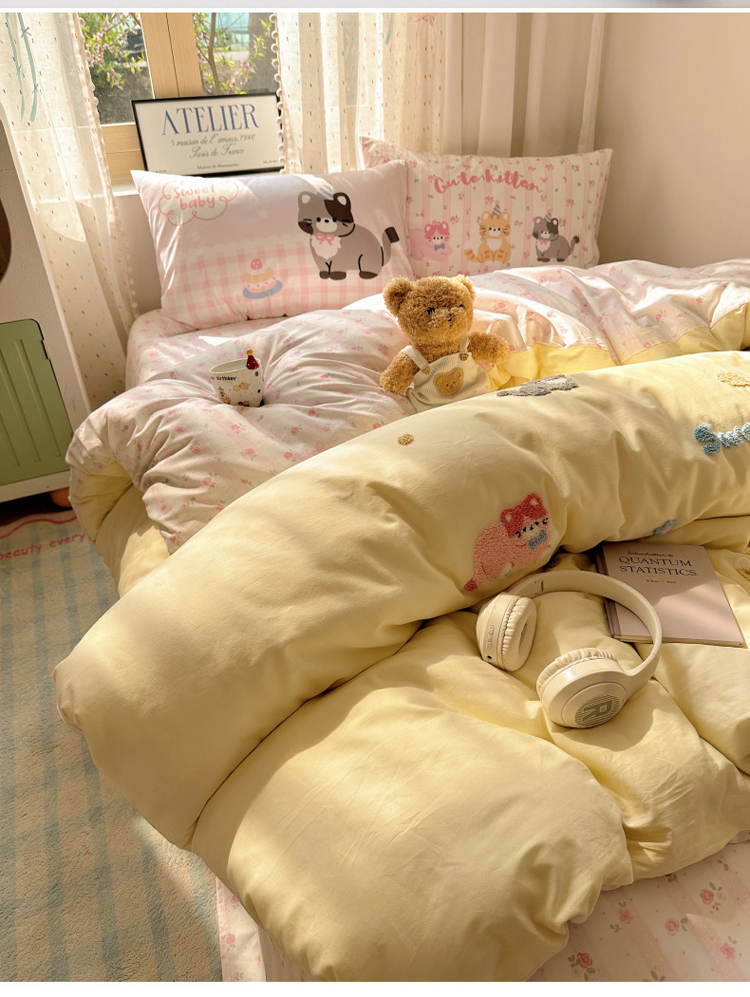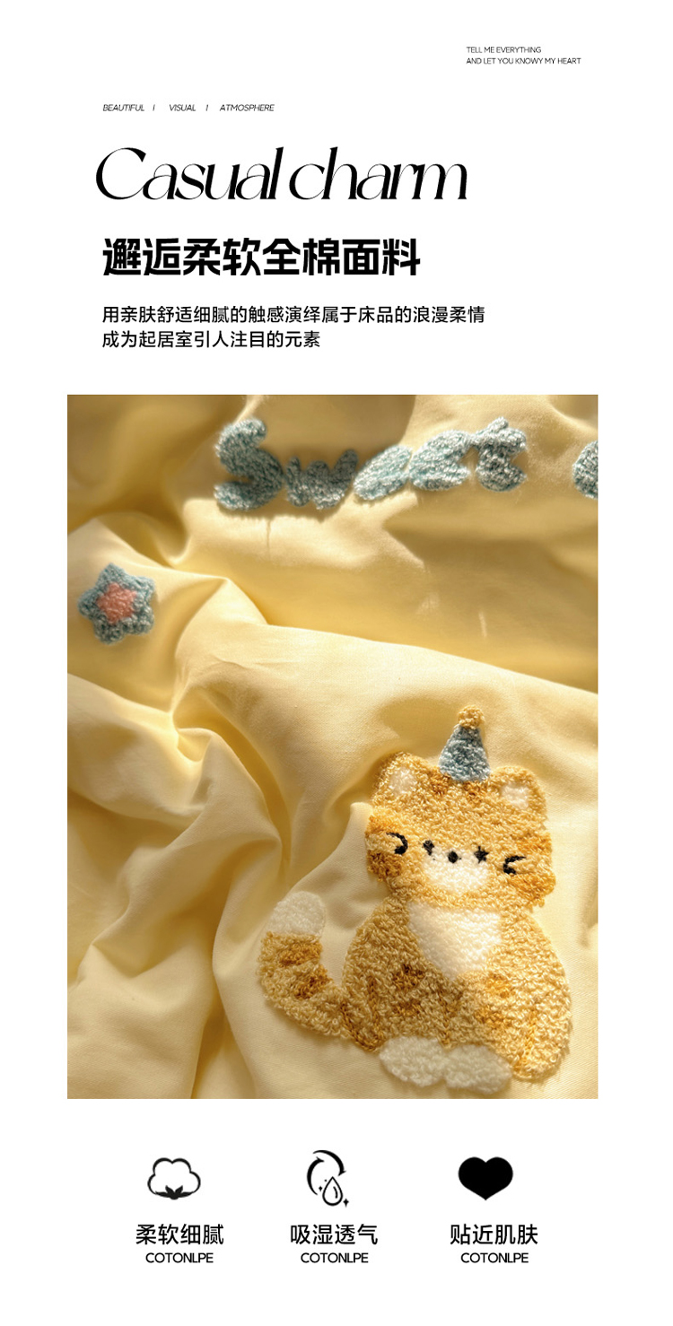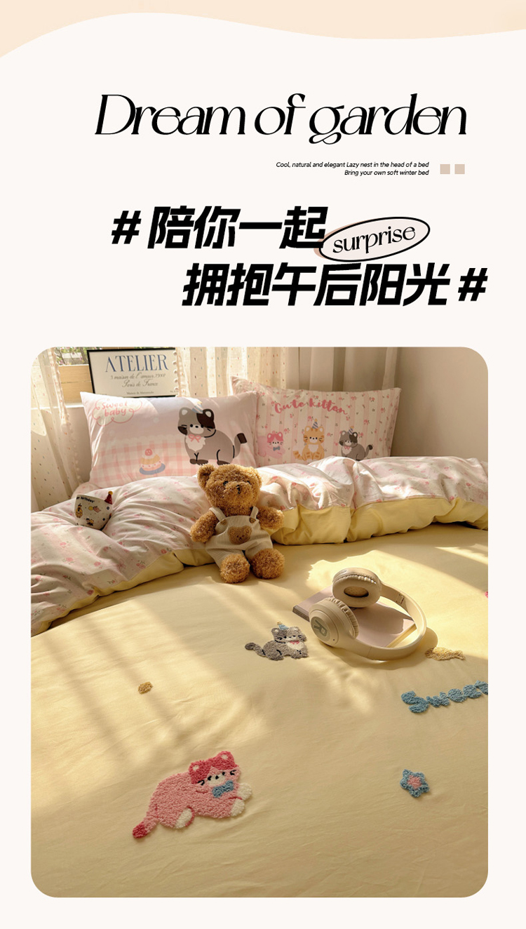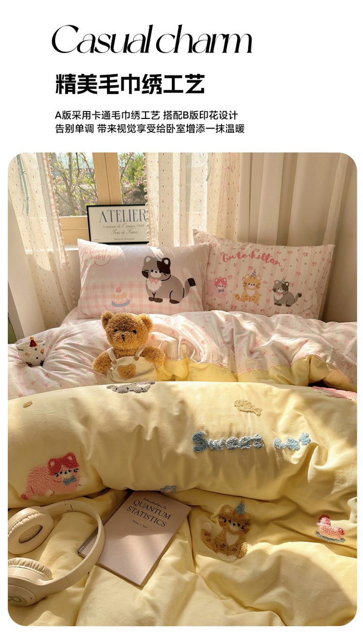 商品名称:丽涵家纺 2025新款全棉纯棉13372数码印花毛巾绣四件套 萌喵时光