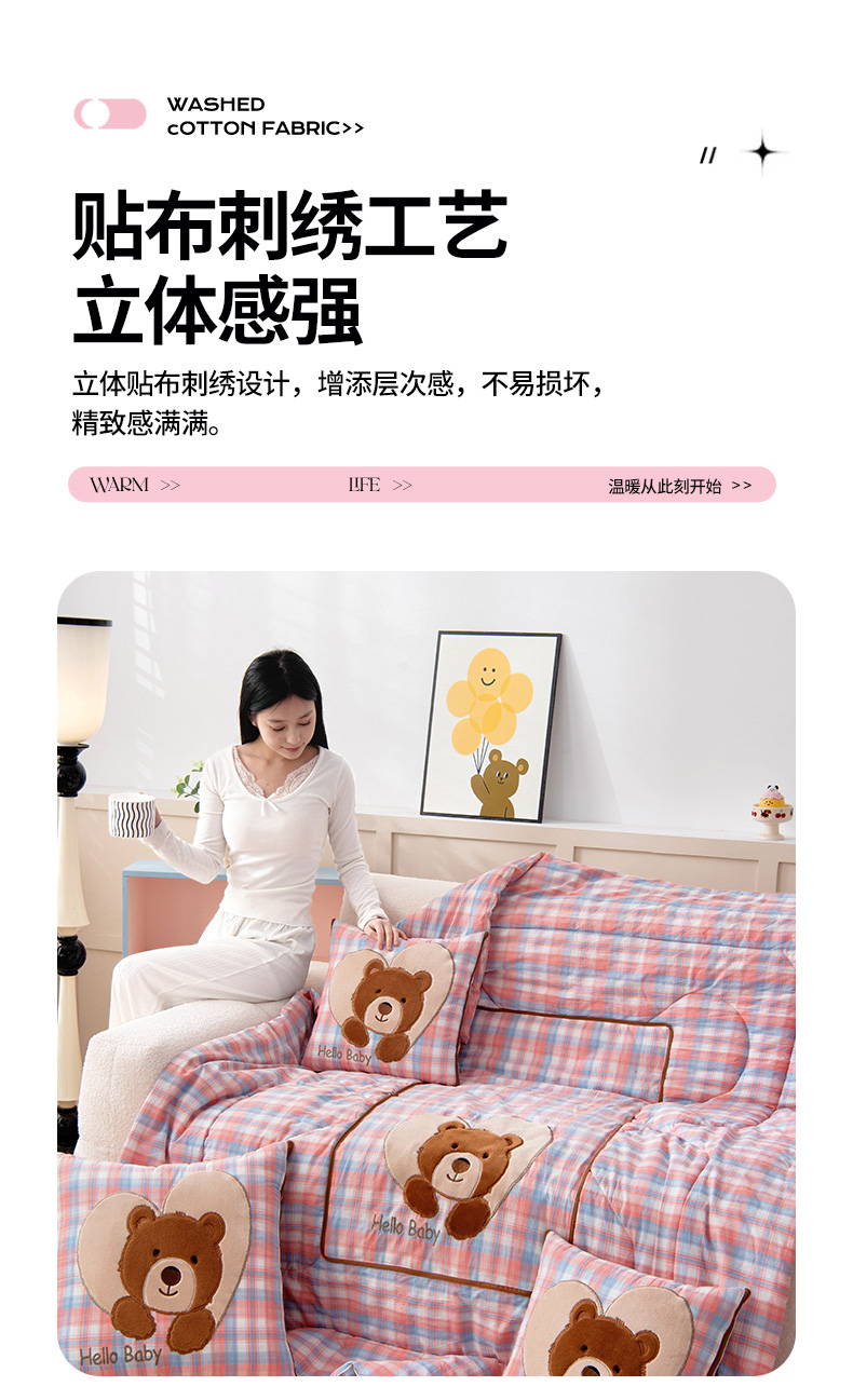 (总)阳光依佰 2024新款四季款全棉贴布绣华夫格抱枕被--元气熊系列,元气熊-冰川蓝,元气熊-橄榄绿,元气熊-奶昔灰,元气熊-青柠,元气熊-樱花粉