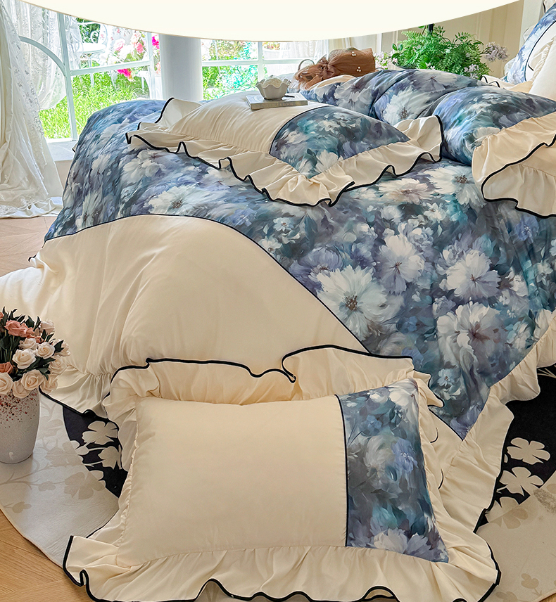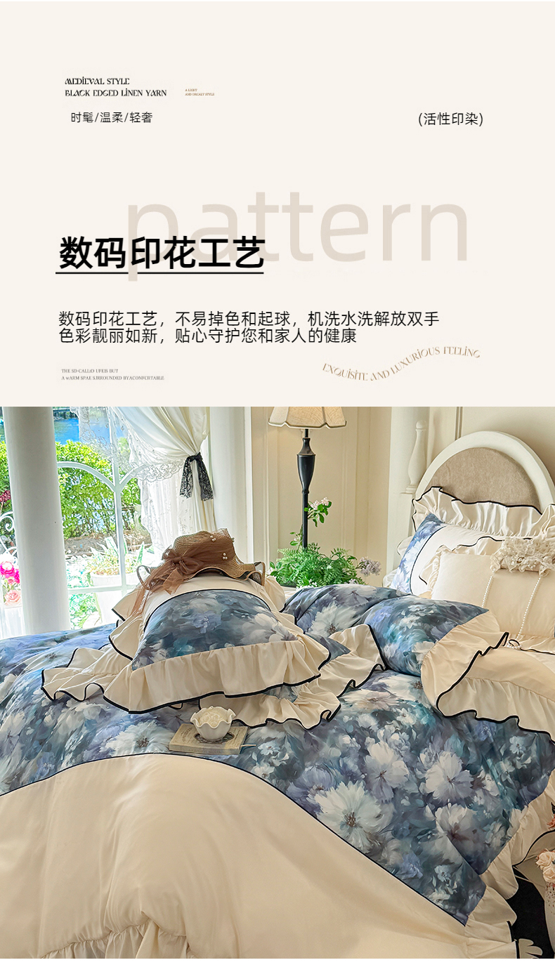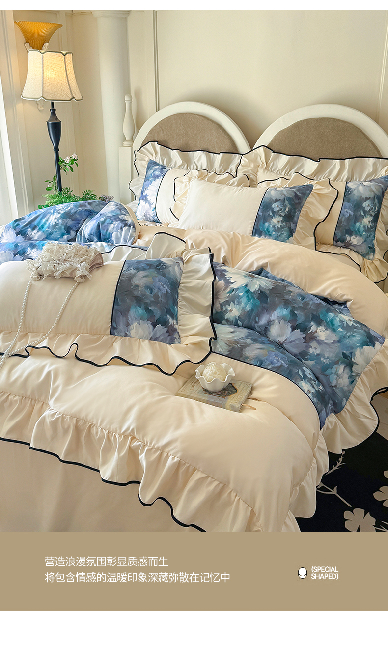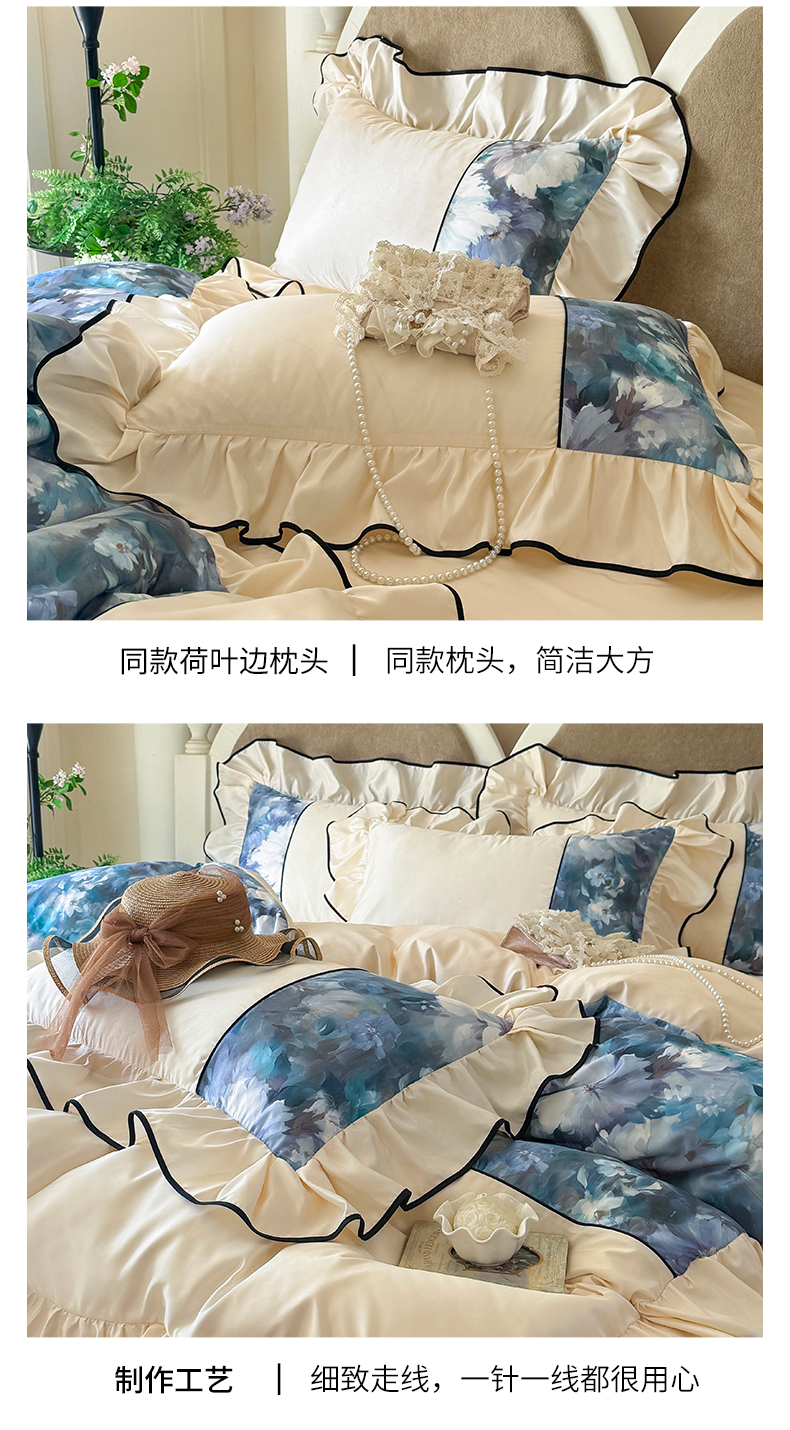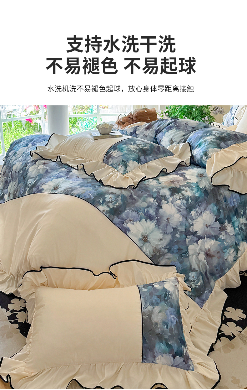 商品名称:宅家居 2025新款A类水洗亲肤棉磨毛法式拼接数码印花奶油韩式花边款四件套 绽放