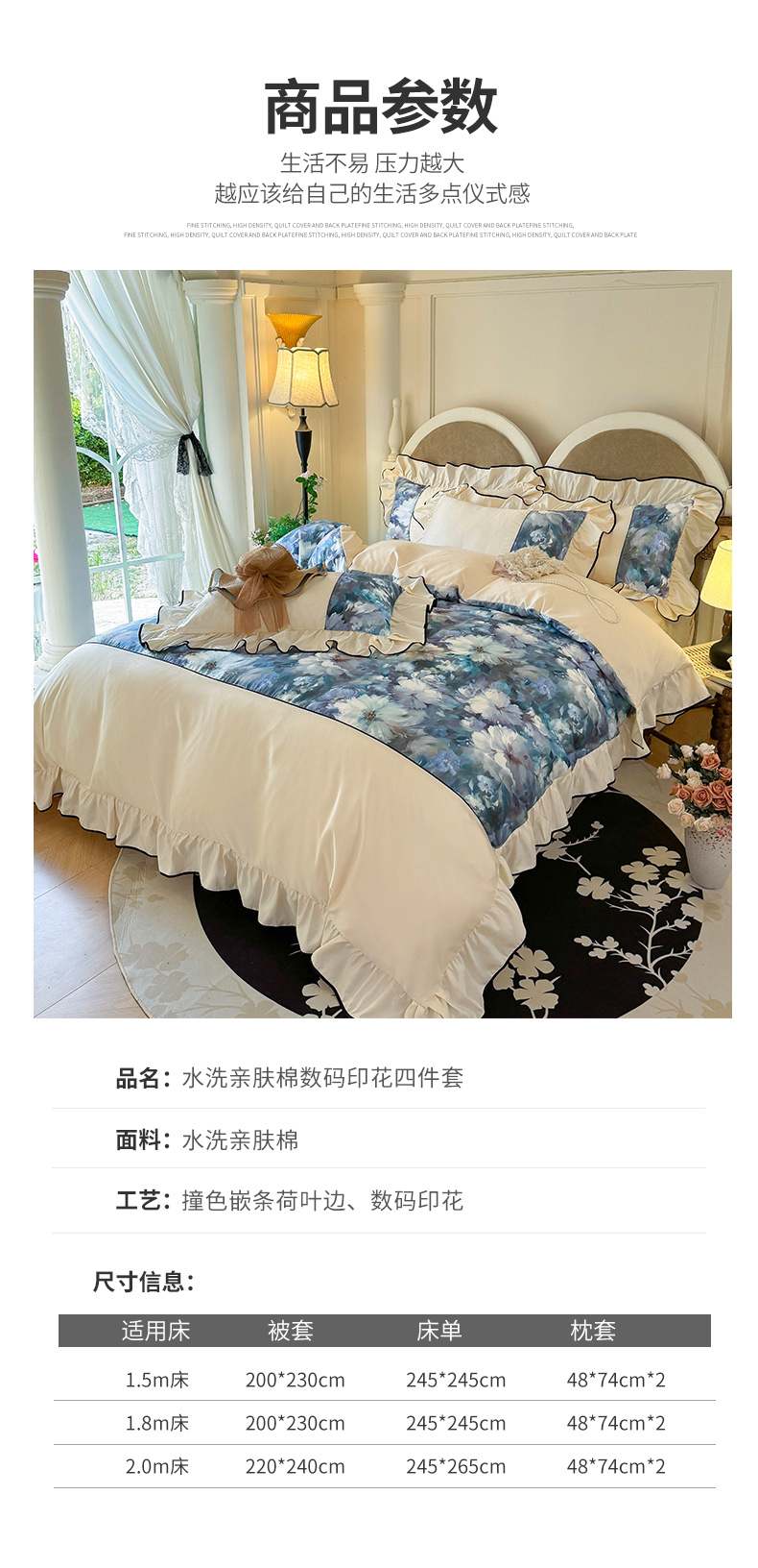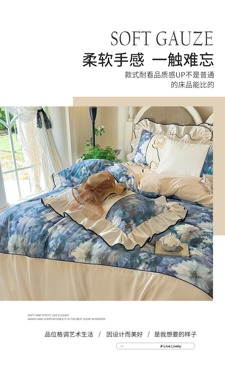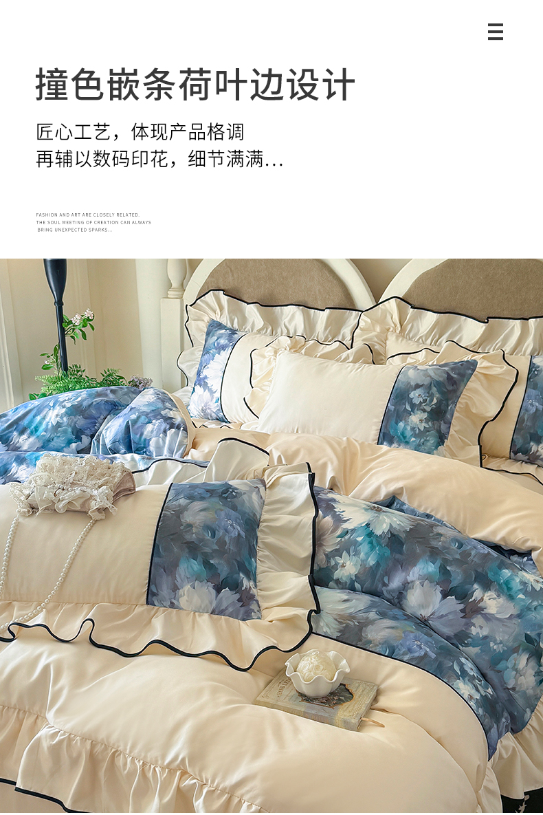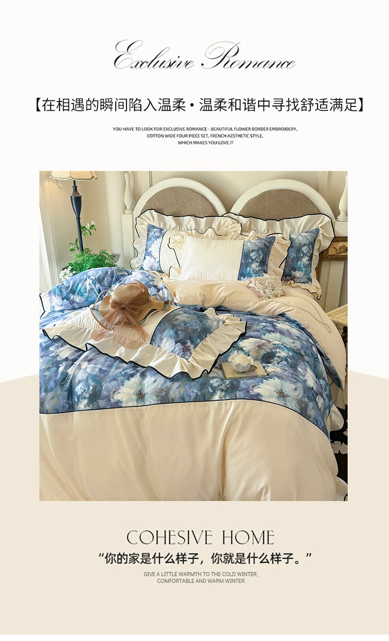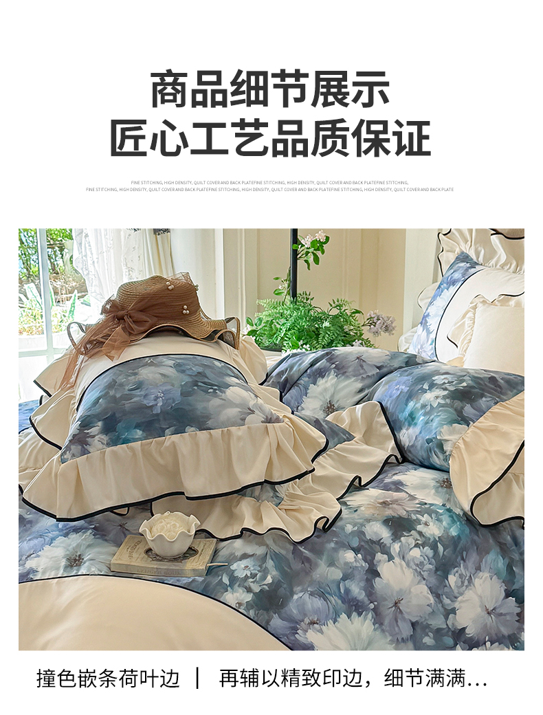 商品名称:宅家居 2025新款A类水洗亲肤棉磨毛法式拼接数码印花奶油韩式花边款四件套 绽放