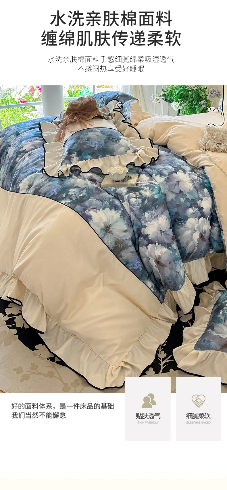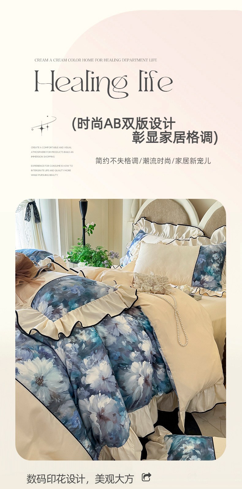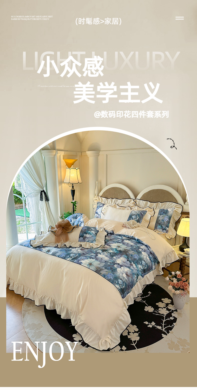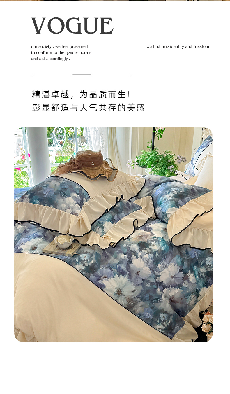 商品名称:宅家居 2025新款A类水洗亲肤棉磨毛法式拼接数码印花奶油韩式花边款四件套 绽放