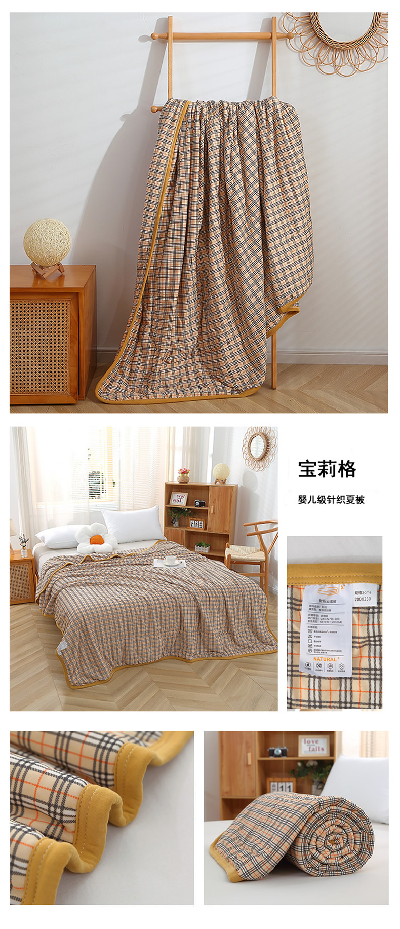 商品名称:贝兰仙奴 2025春夏新款针织棉格子印花夏被夏凉被空调被 贝格黄